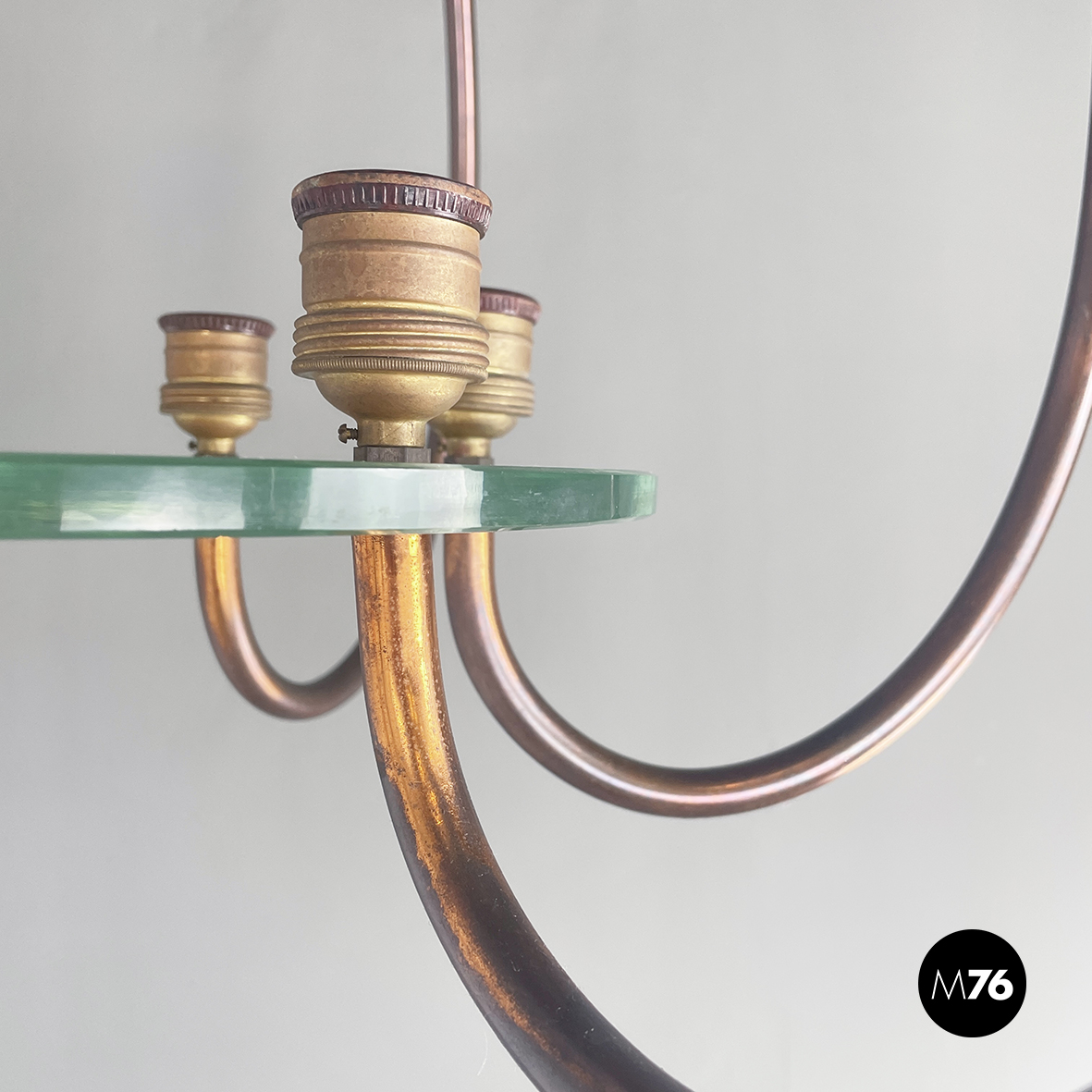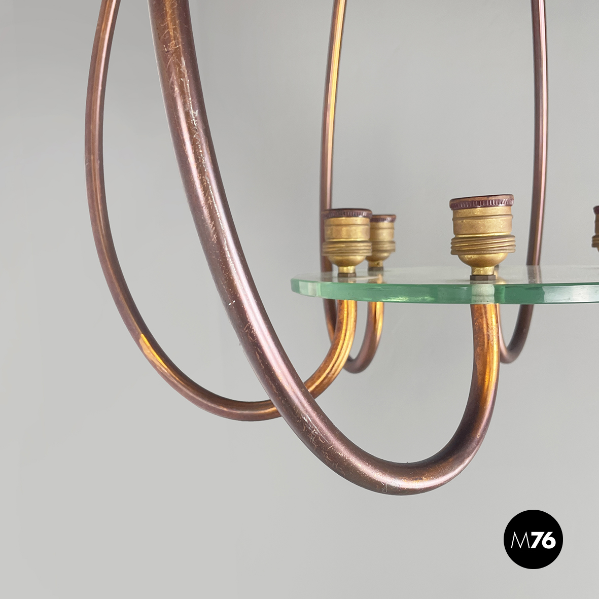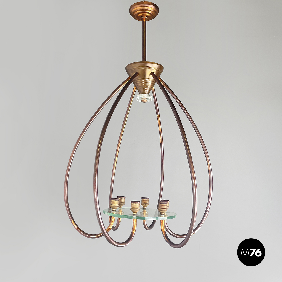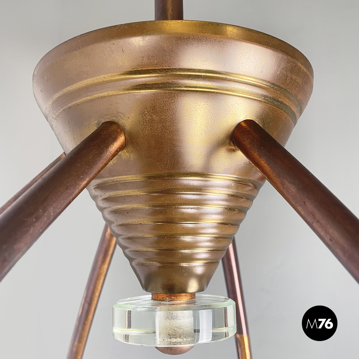 Lampadario composto da sei bracci ricurvi verso l’interno in tondino di rame. I bracci sono uniti al centro da una lastra tonda in vetro di grosso spessore, sulla quale sono poste le sei fonti luminose. La struttura è composta da una parte conica in rame con un dettaglio tondo in vetro spesso, un tondino di rame e una base tonda, anche essa in rame. Art Deco.