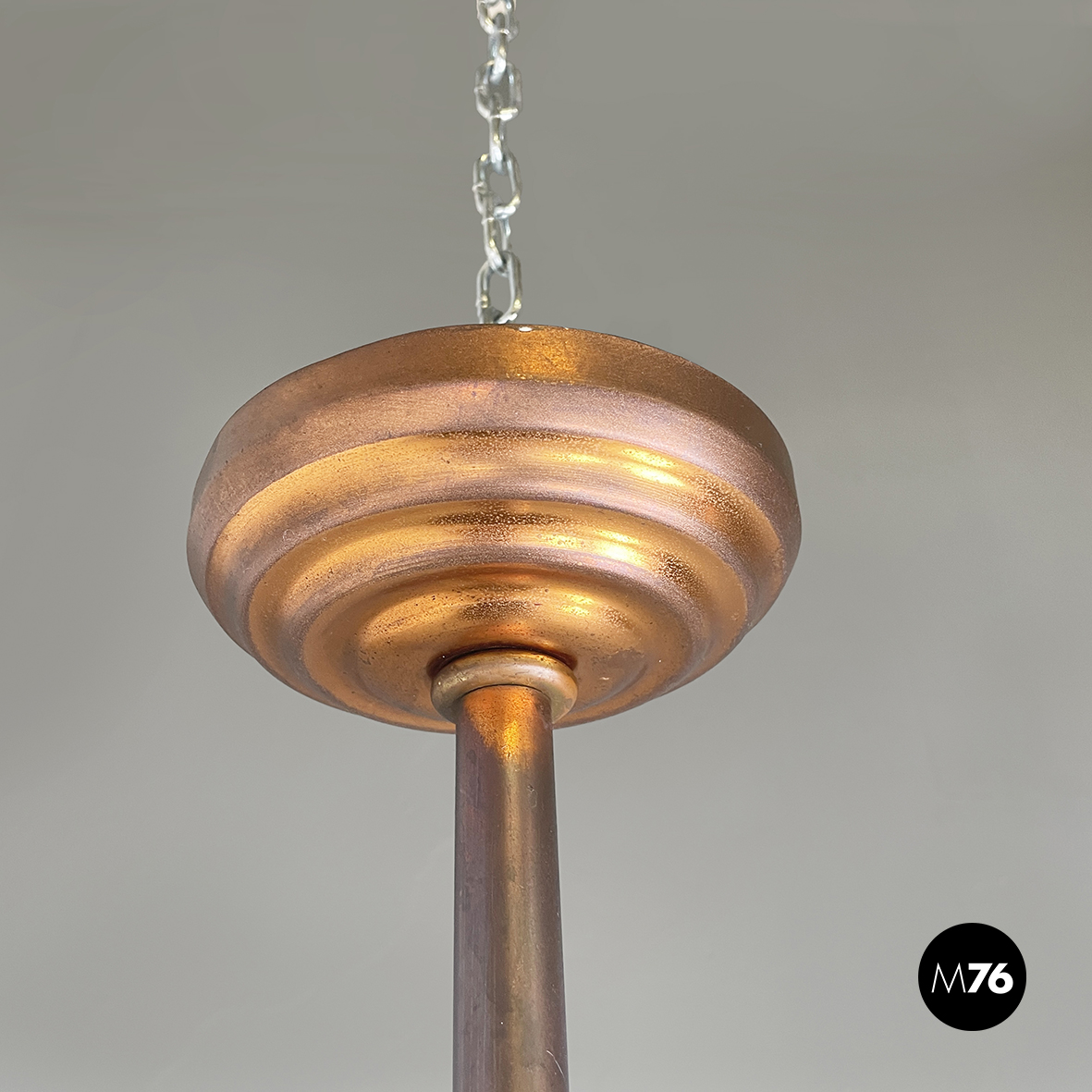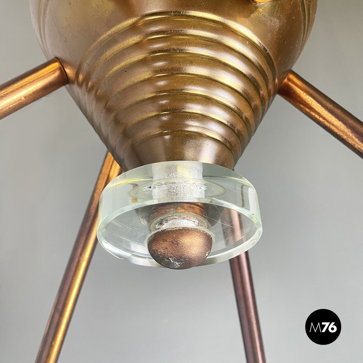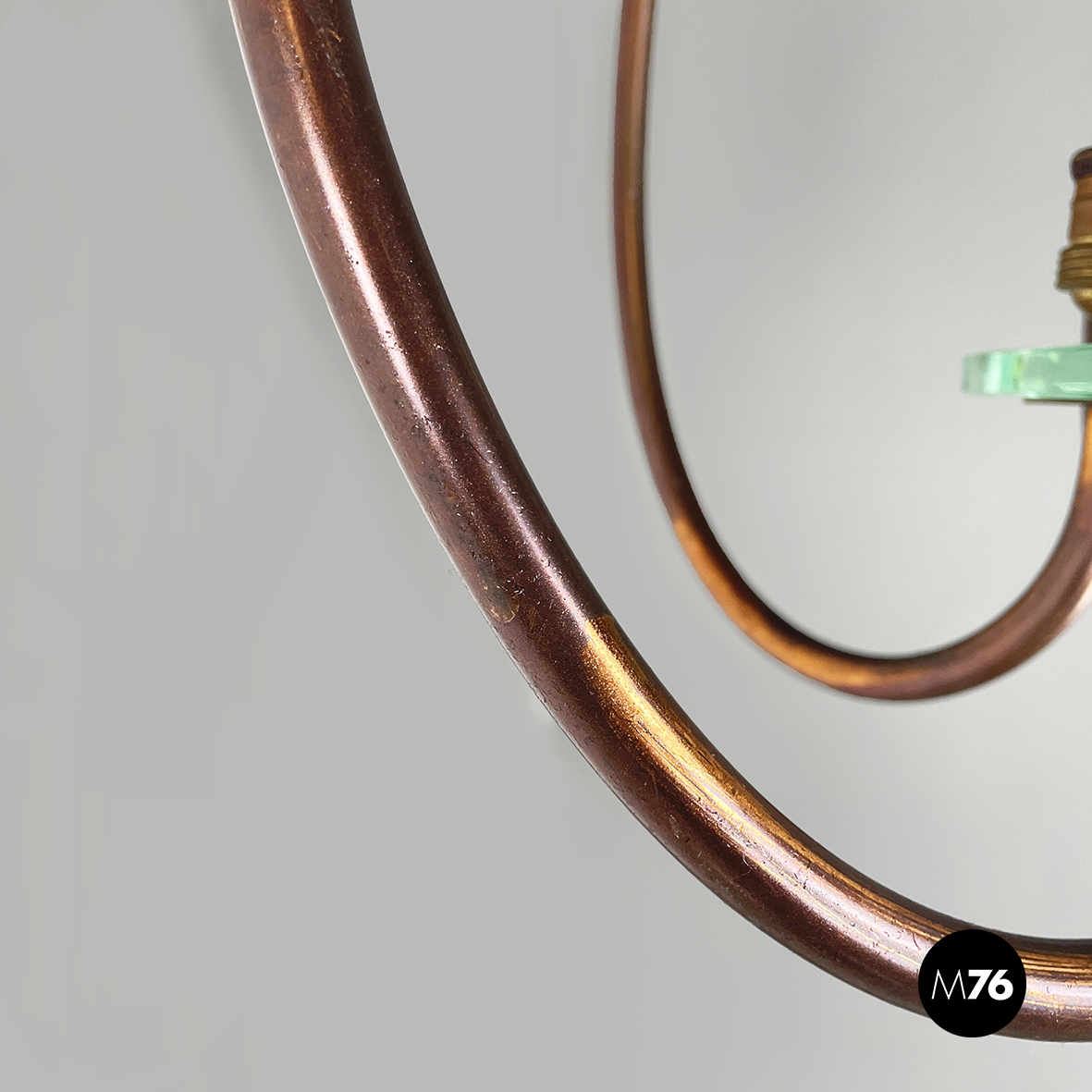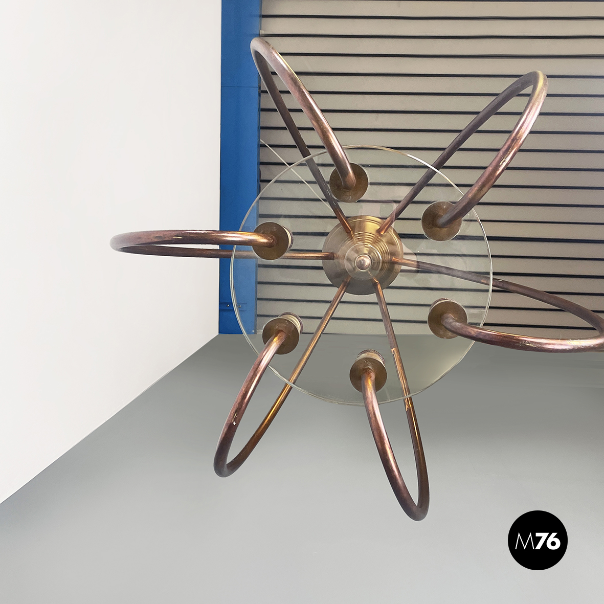 Lampadario composto da sei bracci ricurvi verso l’interno in tondino di rame. I bracci sono uniti al centro da una lastra tonda in vetro di grosso spessore, sulla quale sono poste le sei fonti luminose. La struttura è composta da una parte conica in rame con un dettaglio tondo in vetro spesso, un tondino di rame e una base tonda, anche essa in rame. Art Deco.