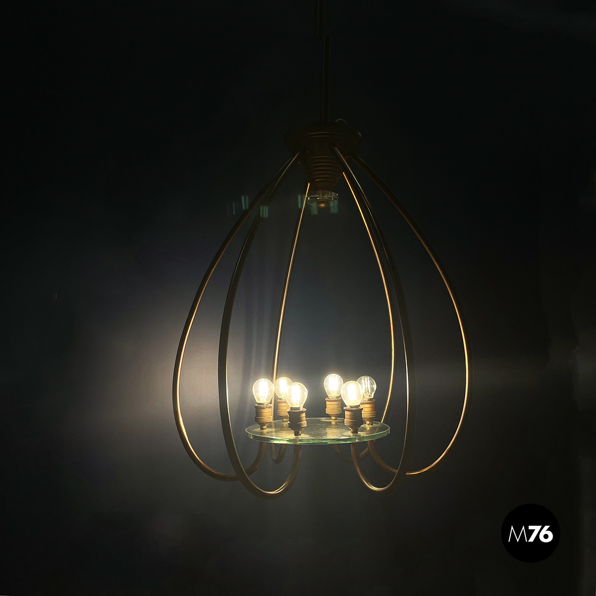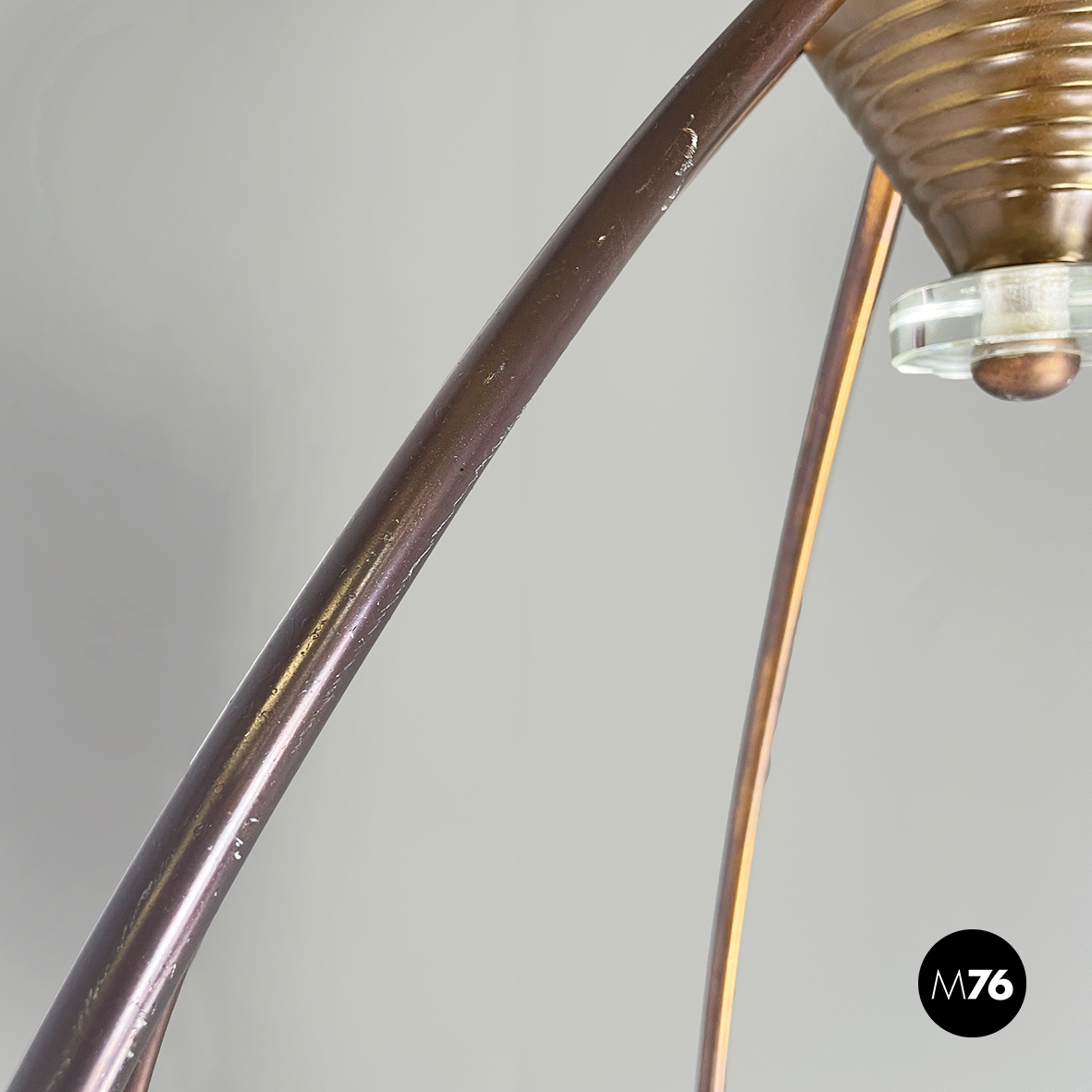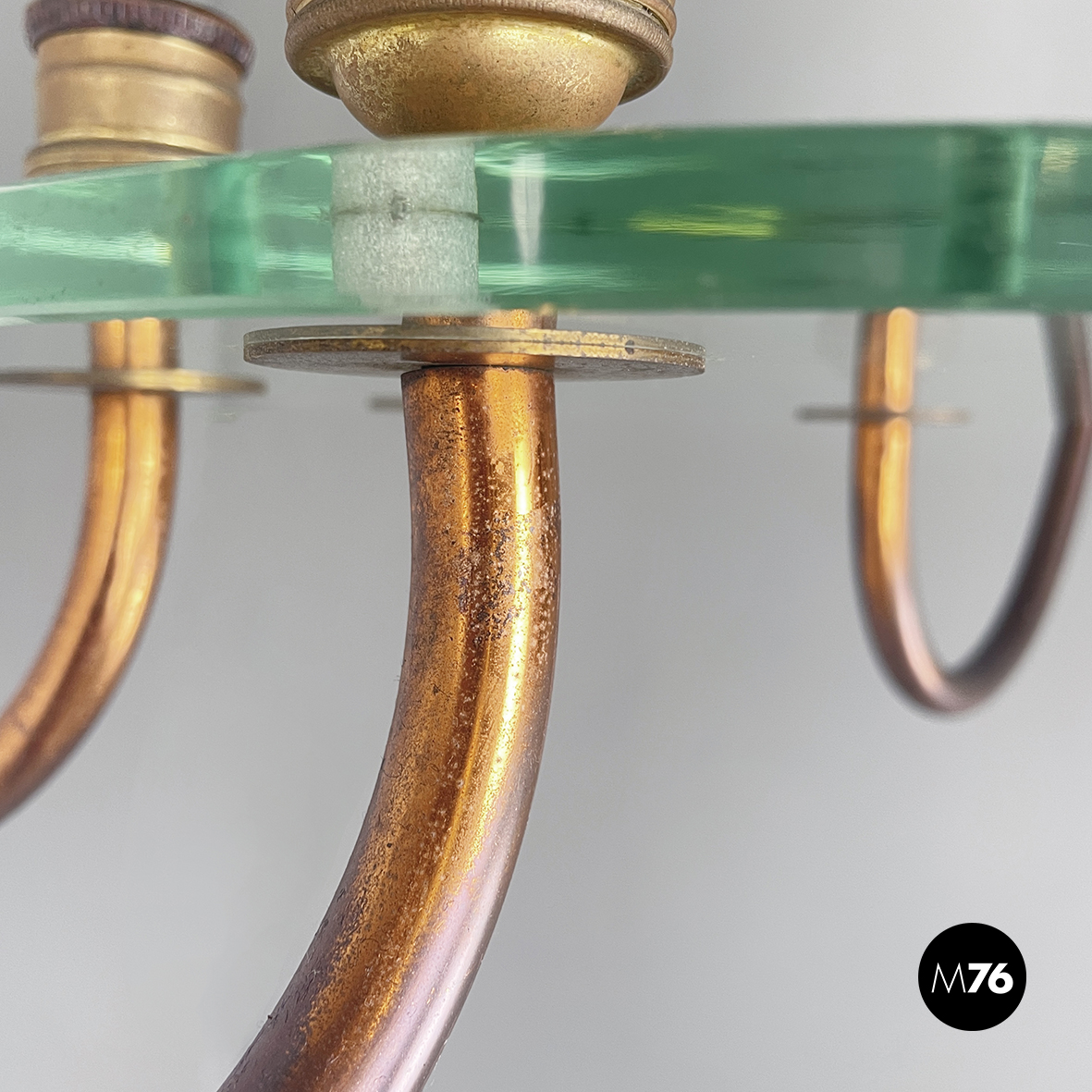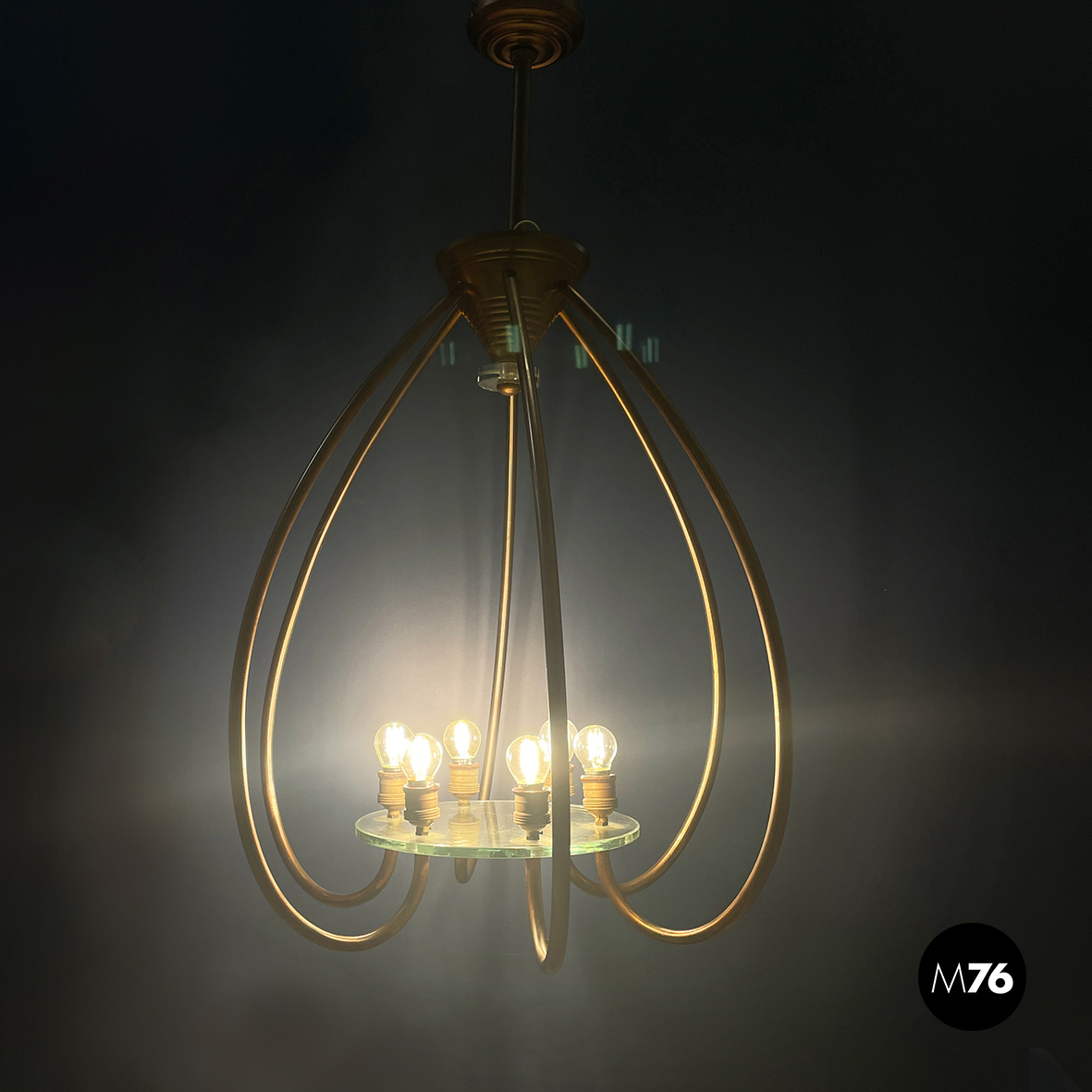 Lampadario composto da sei bracci ricurvi verso l’interno in tondino di rame. I bracci sono uniti al centro da una lastra tonda in vetro di grosso spessore, sulla quale sono poste le sei fonti luminose. La struttura è composta da una parte conica in rame con un dettaglio tondo in vetro spesso, un tondino di rame e una base tonda, anche essa in rame. Art Deco.
