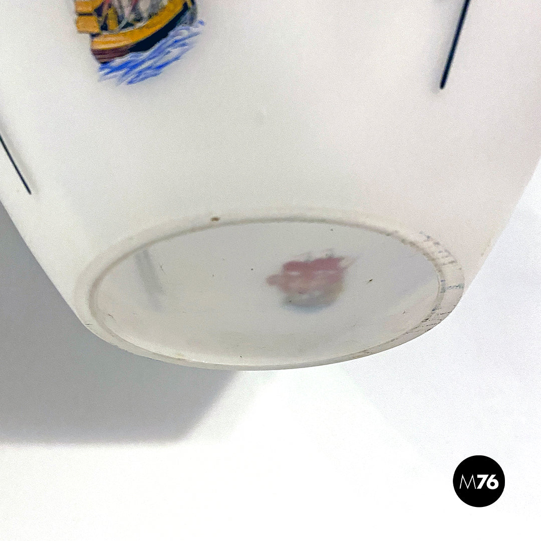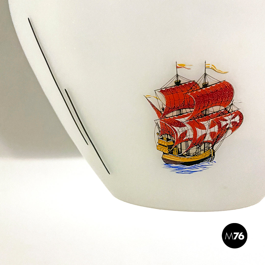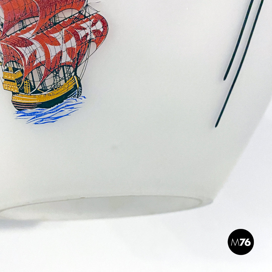 Lampadario in vetro opalino bianco con motivo con veliero stampato, struttura in metallo su cui è fissato il portalampada e a cui si avvitano i tre tondini di metallo necessari a sorreggere il vetro, tipici dell’epoca.