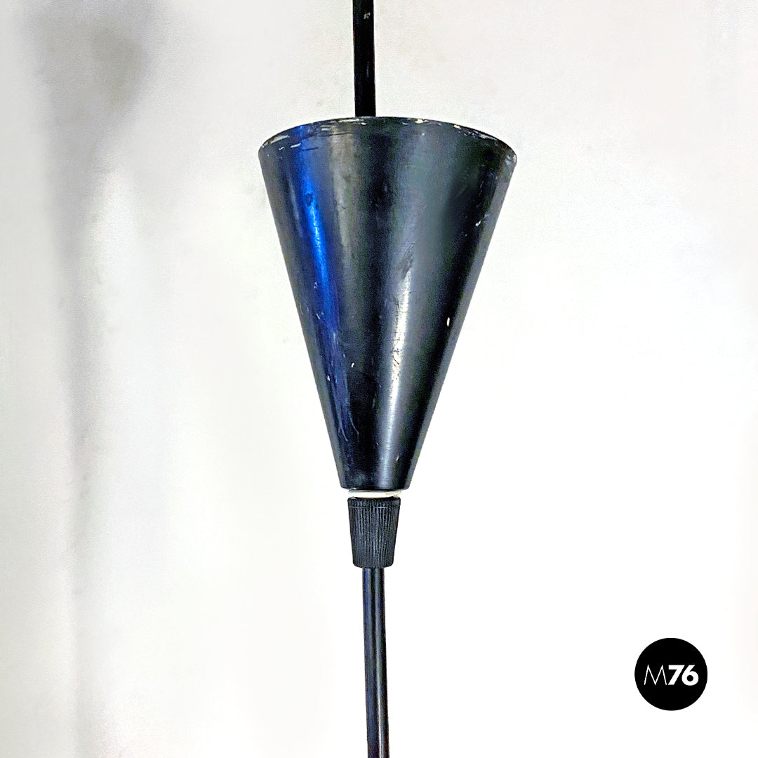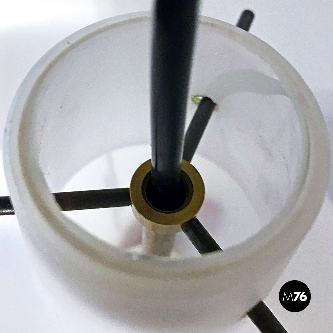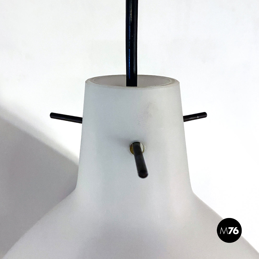 Lampadario in vetro opalino bianco con motivo con veliero stampato, struttura in metallo su cui è fissato il portalampada e a cui si avvitano i tre tondini di metallo necessari a sorreggere il vetro, tipici dell’epoca.