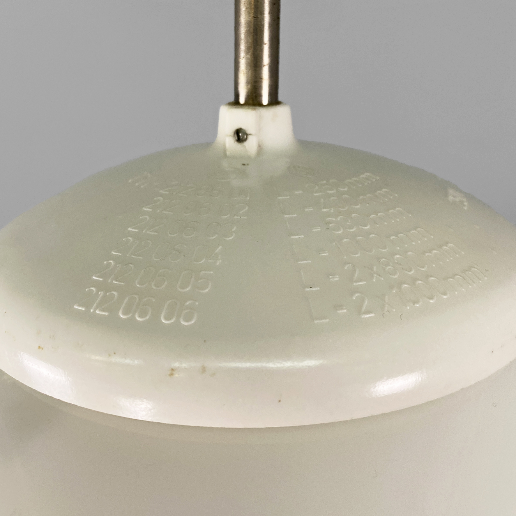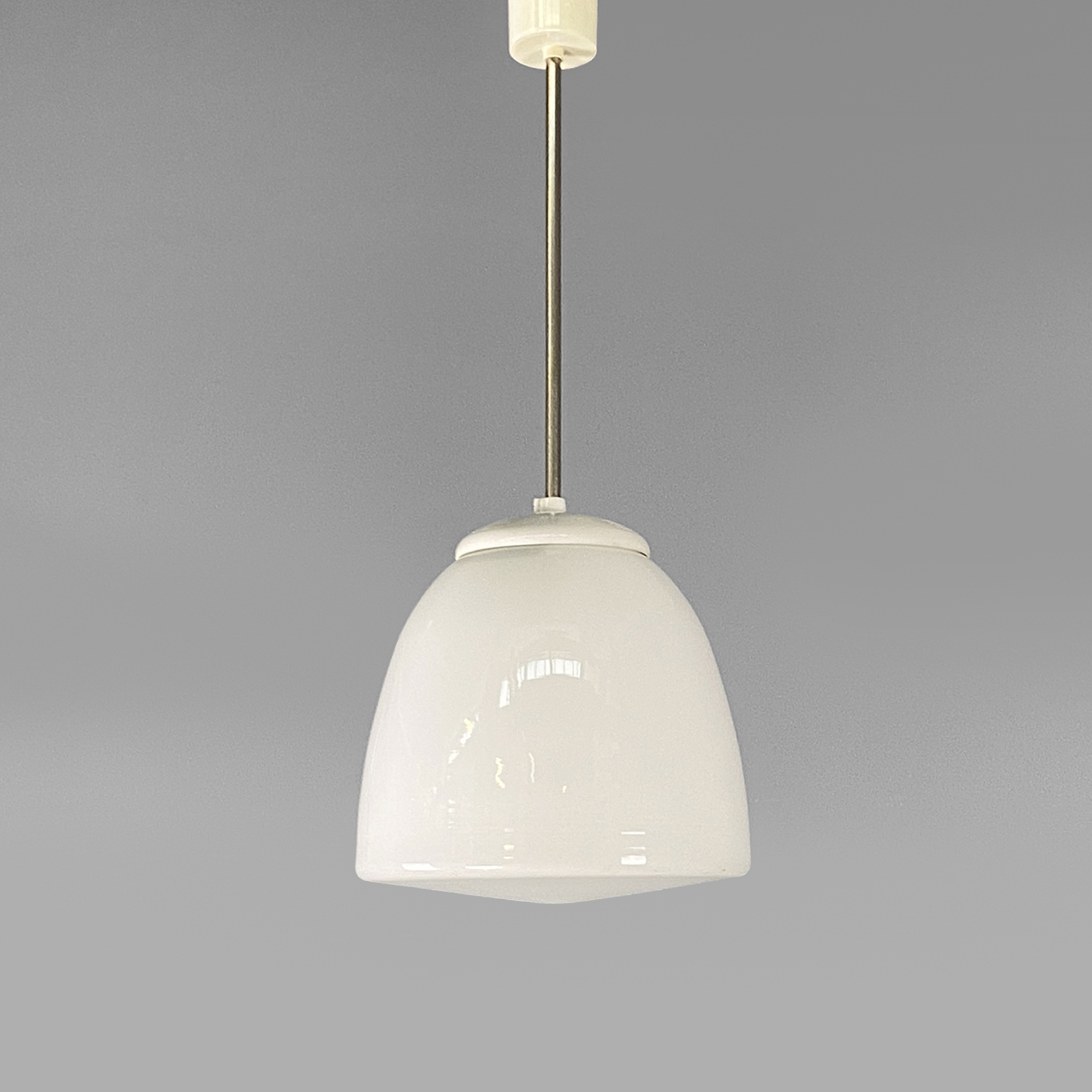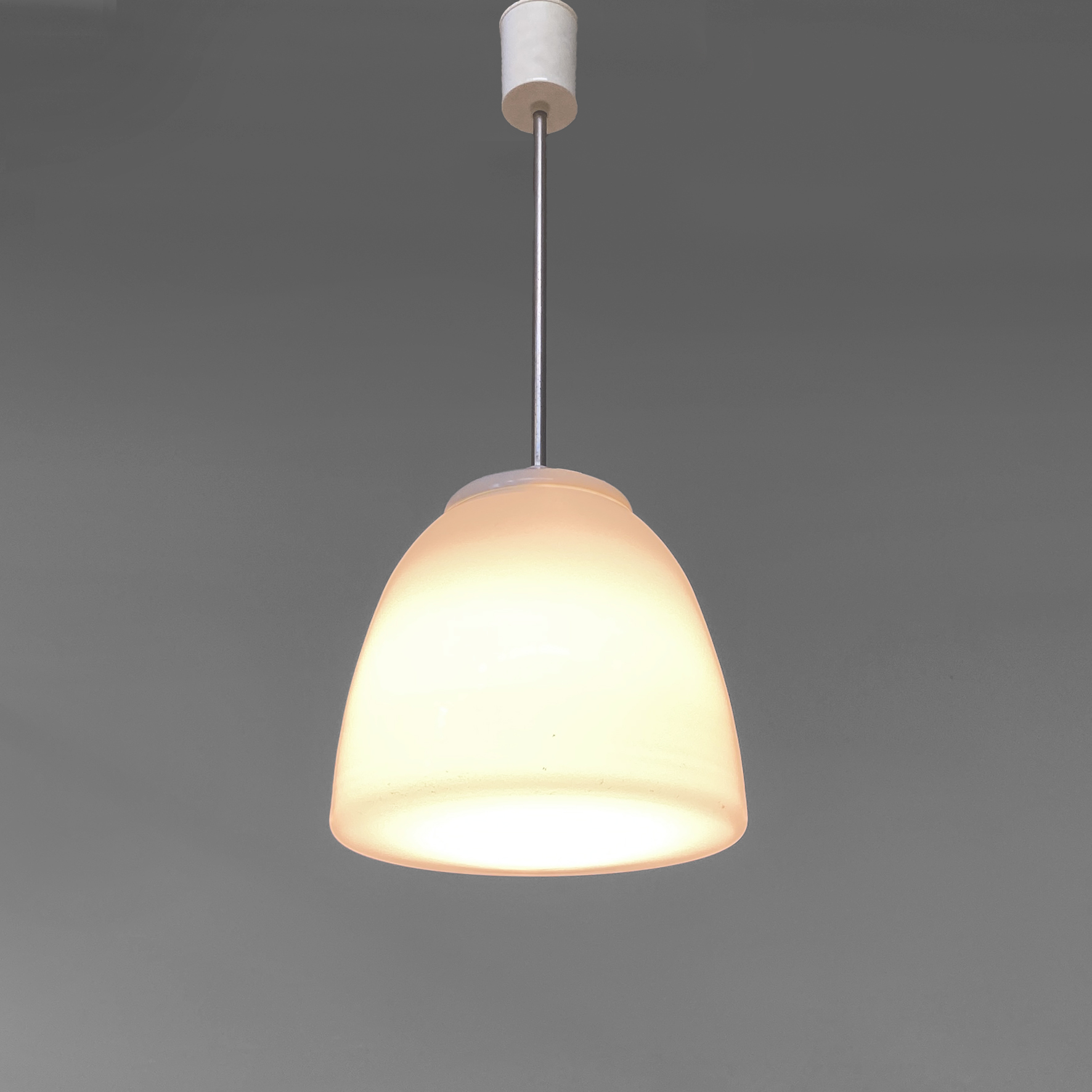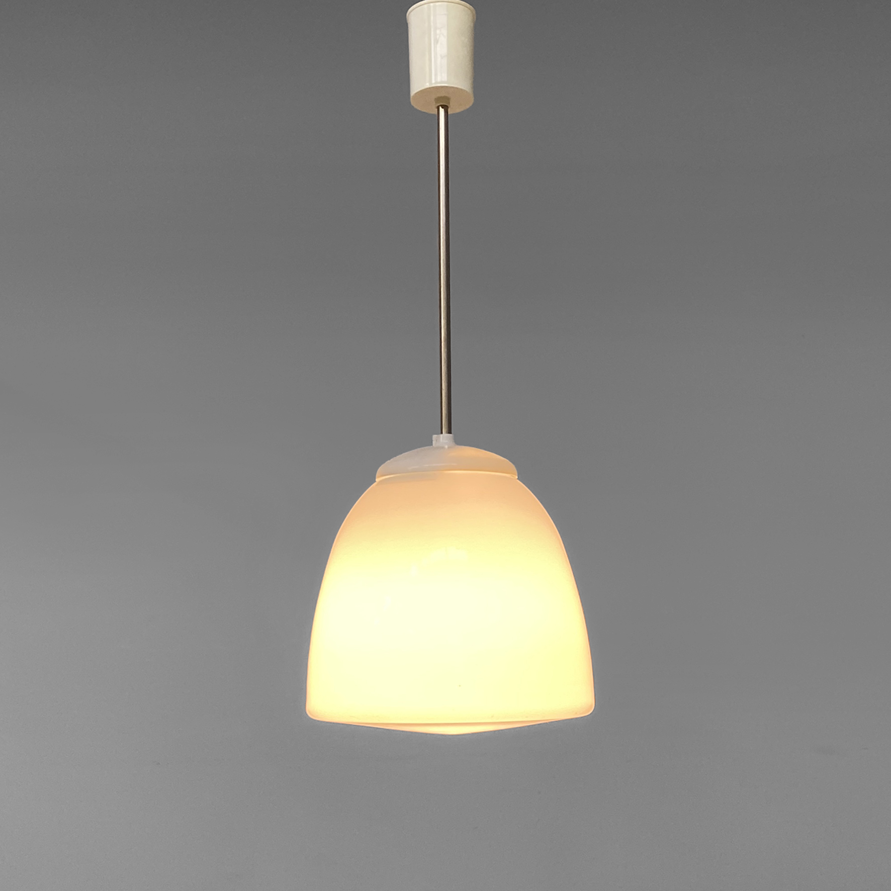 Lampadario in vetro bianco opalino di forma irregolare. Struttura provvista di un diffusore in vetro opalino dalla forma arrotondata e chiusa nella parte inferiore, con stelo in alluminio a sezione tonda. Portalampada in plastica bianca, così come il supporto cilindrico necessario per il fissaggio a soffitto. Supporta una lampadina con attacco E27.