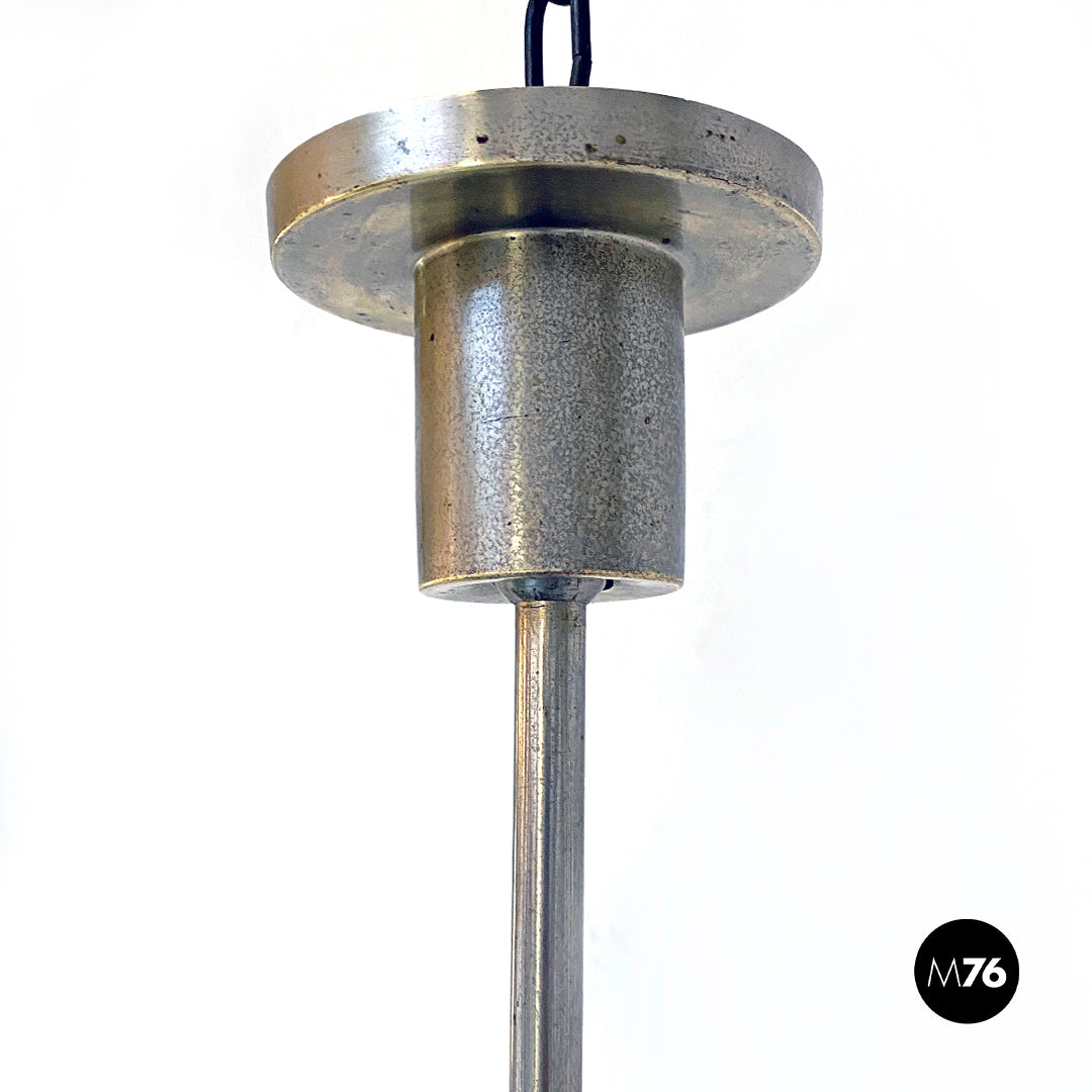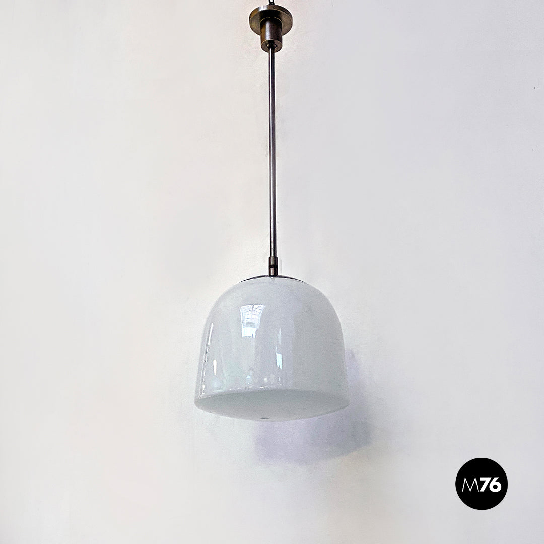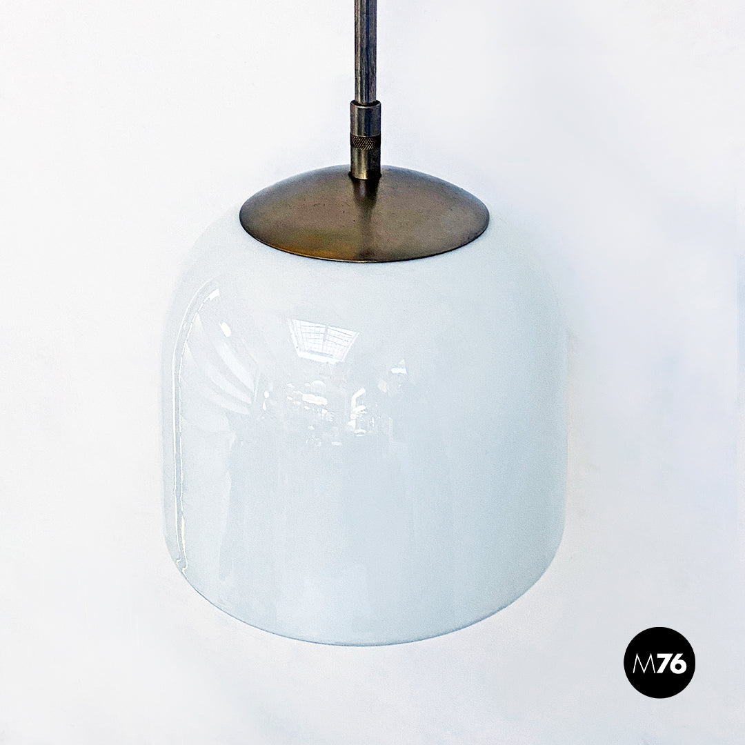 Lampadario in vetro opalino di forma irregolare, con asta centrale e portalampada in tondino di acciaio satinato.