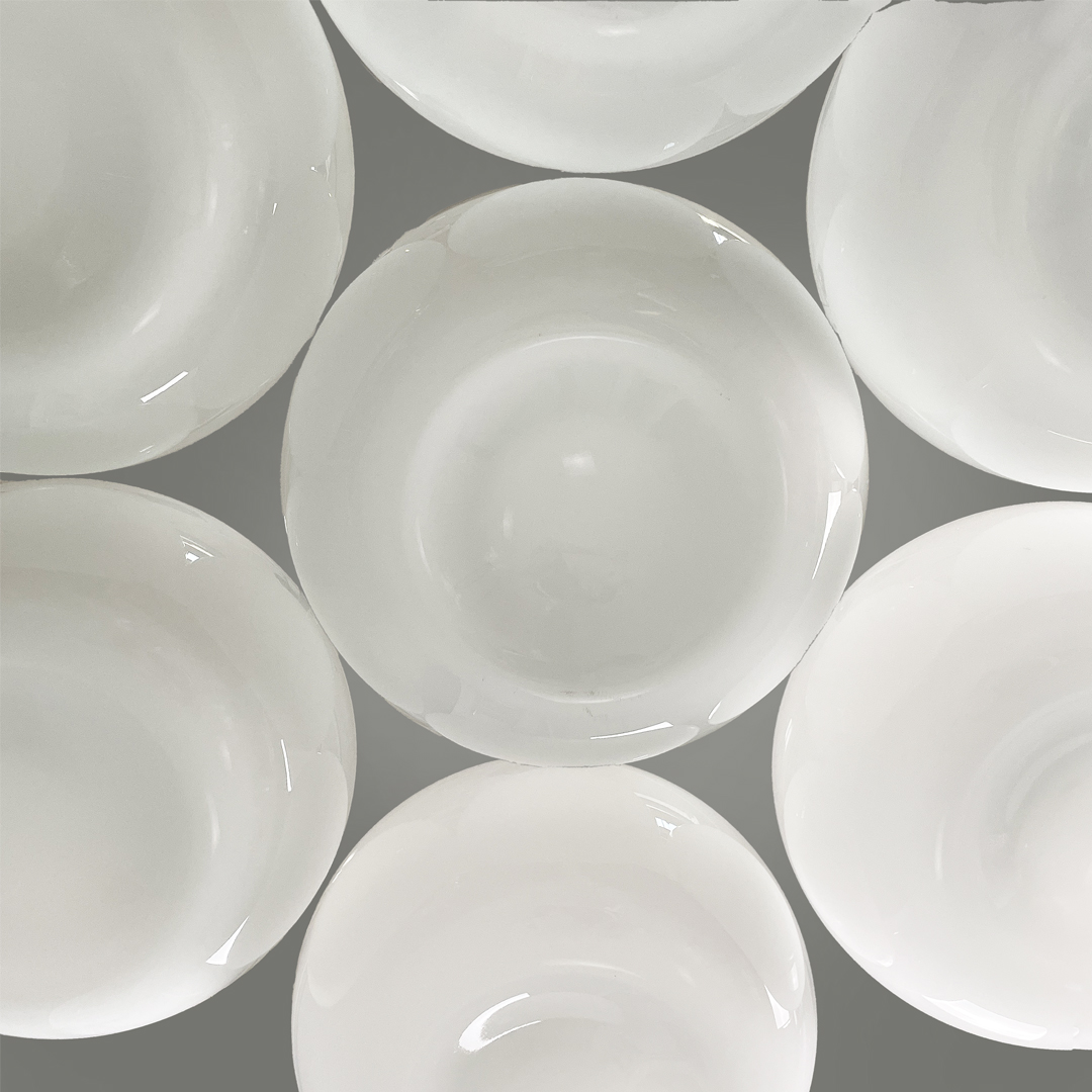 Lampadario con sette diffusori in vetro opalino. Ogni diffusore cilindrico presenta una conca nella parte inferiore.