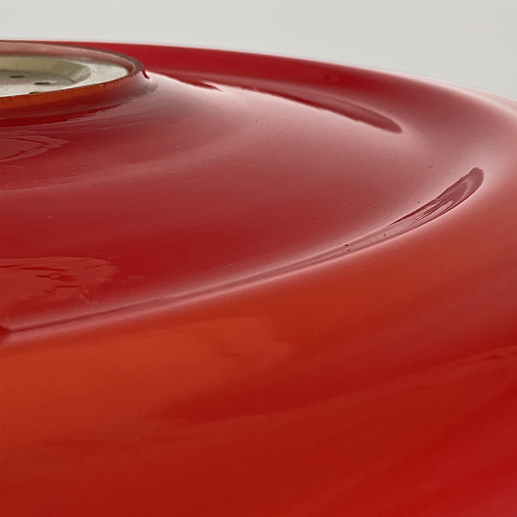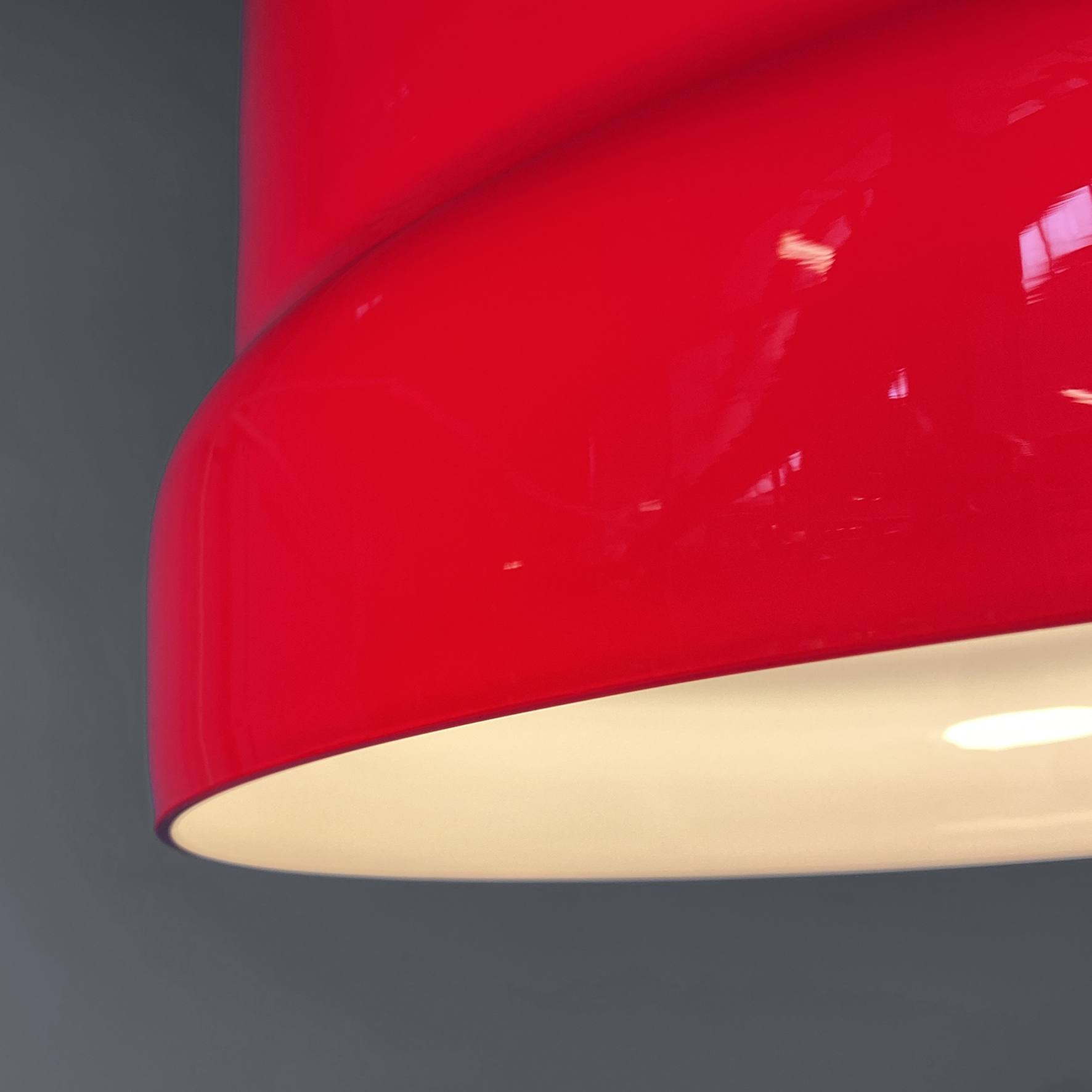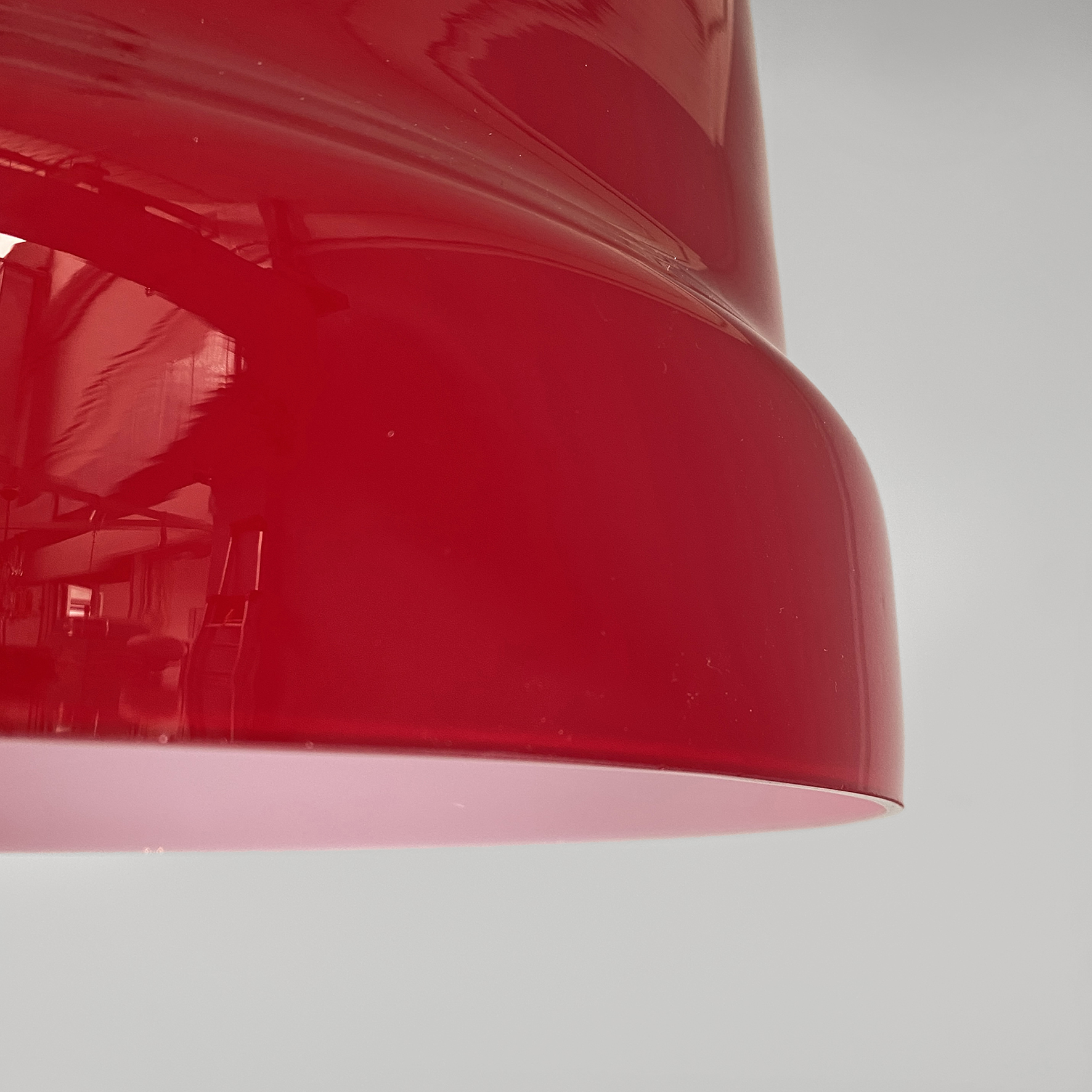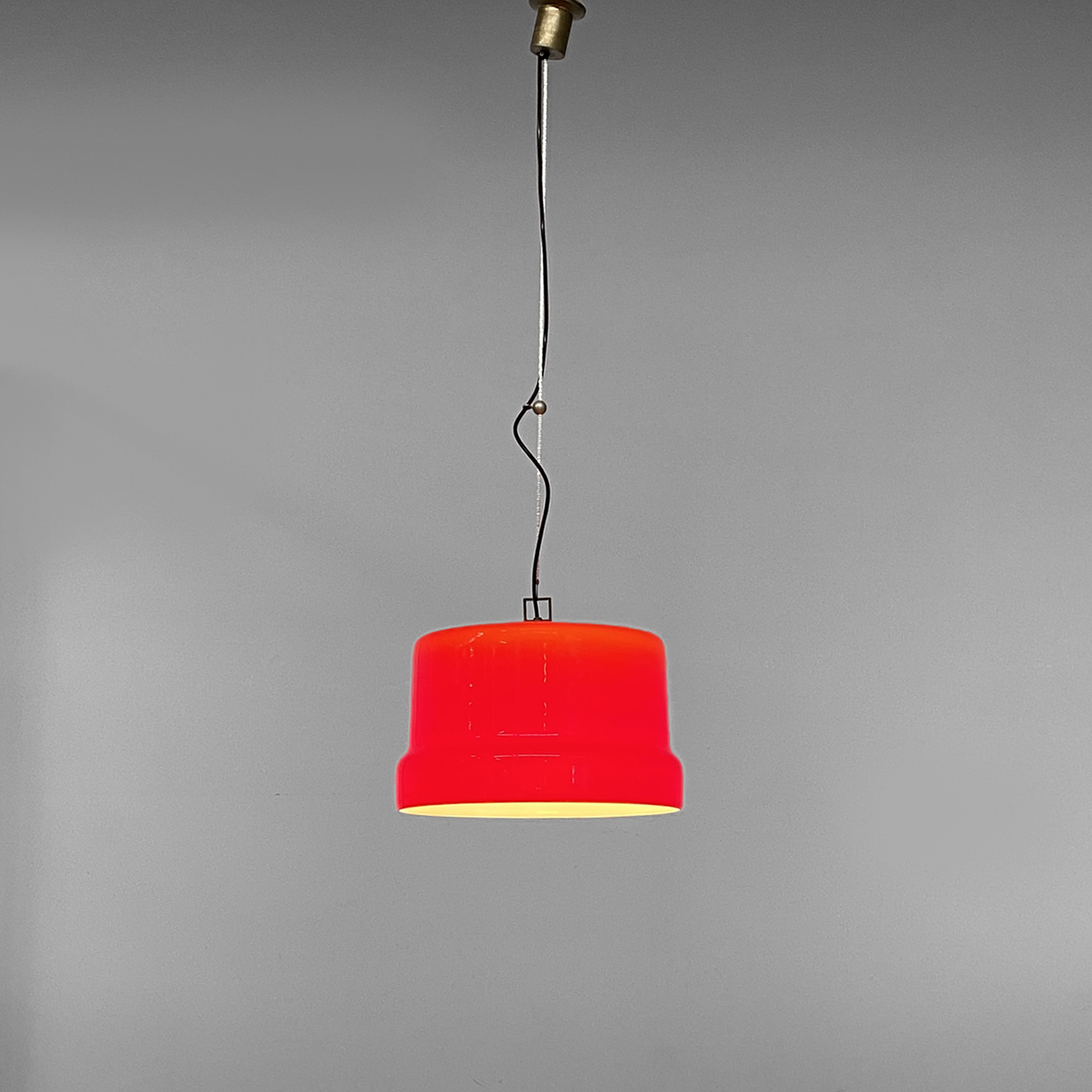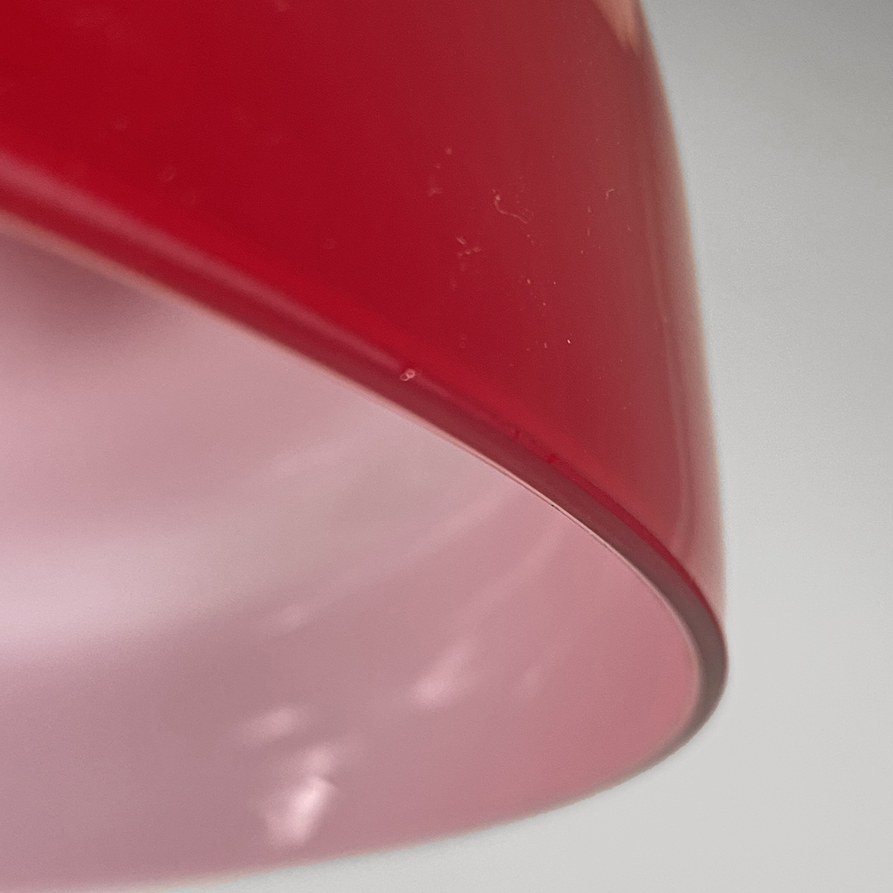 Lampada a sospensione con paralume interamente in doppio vetro incamiciato di colore rosso fuori e bianco dentro.