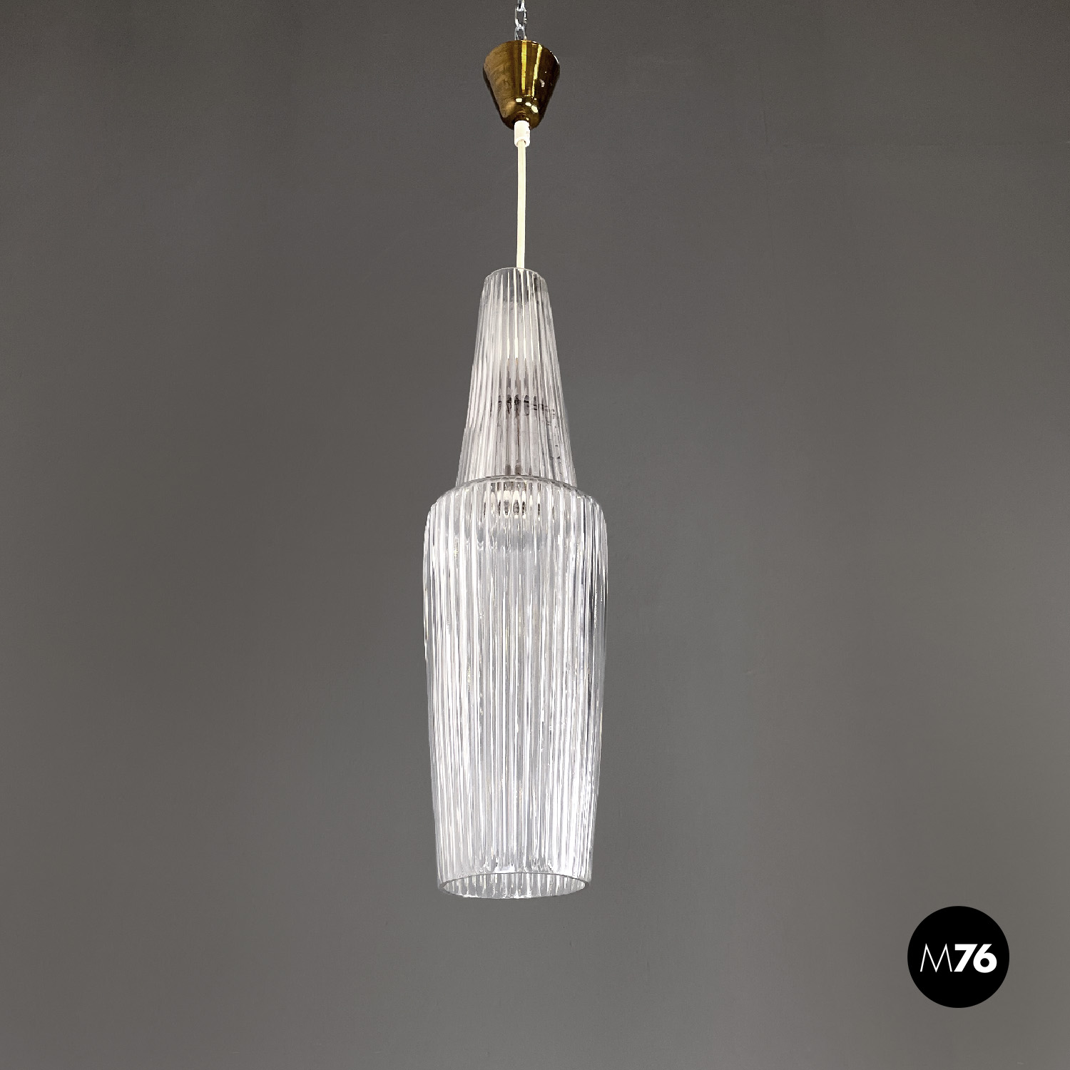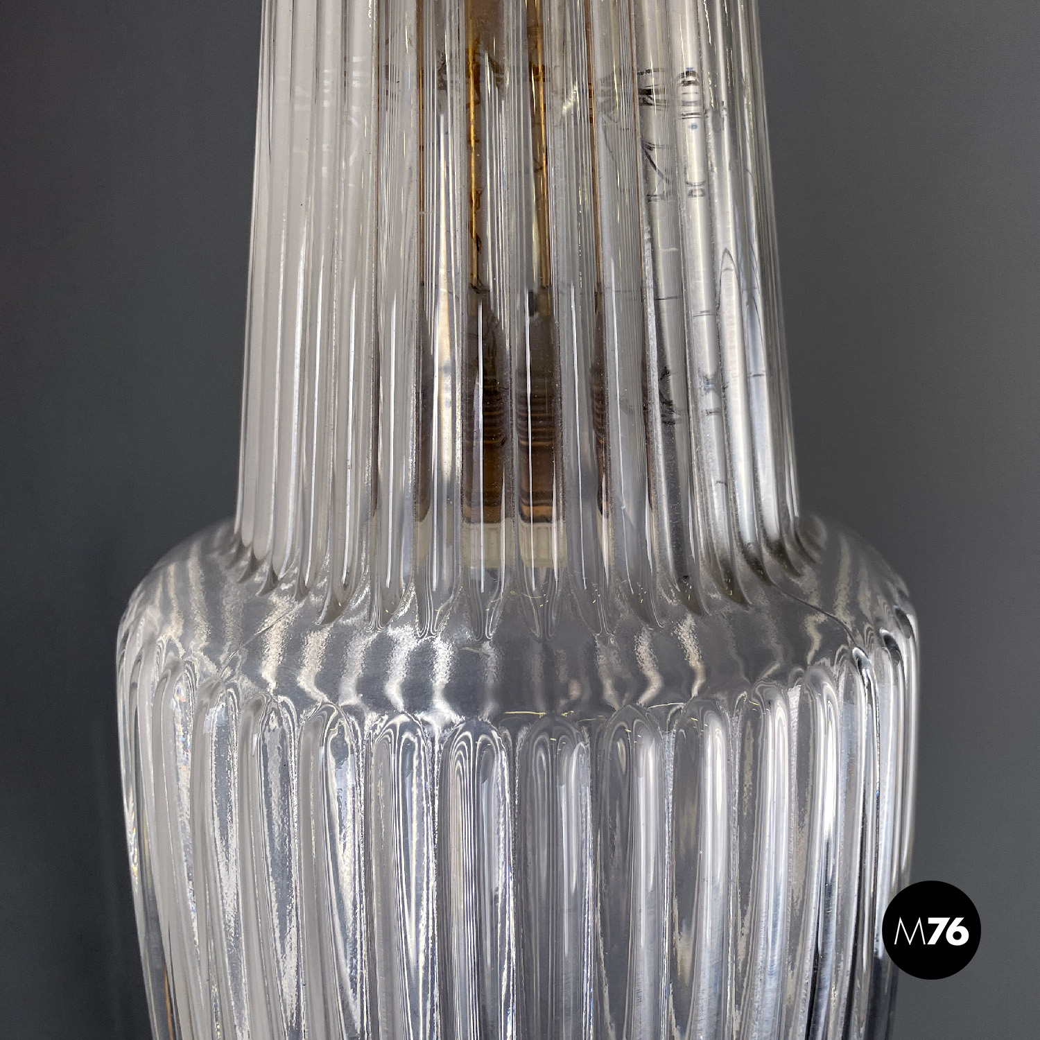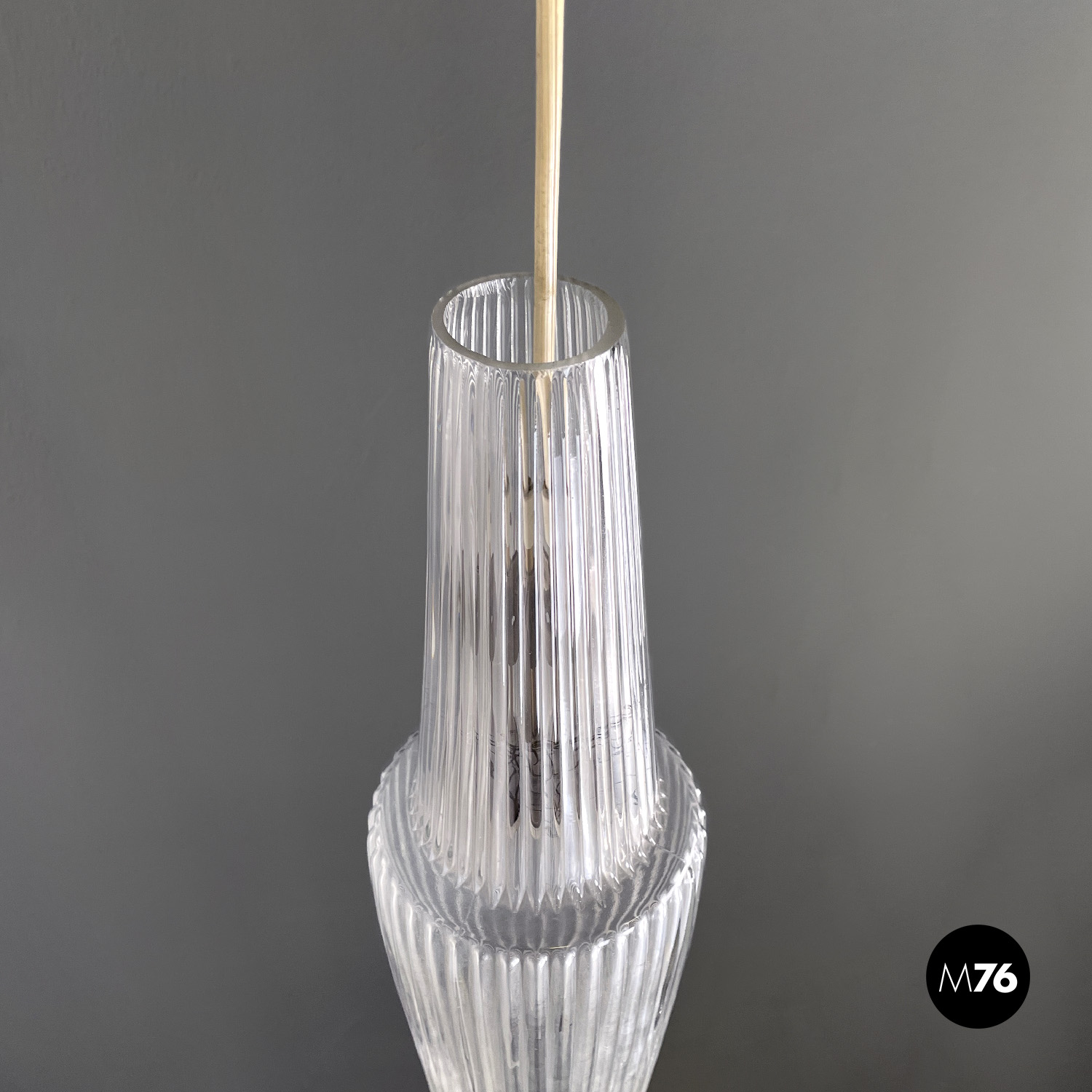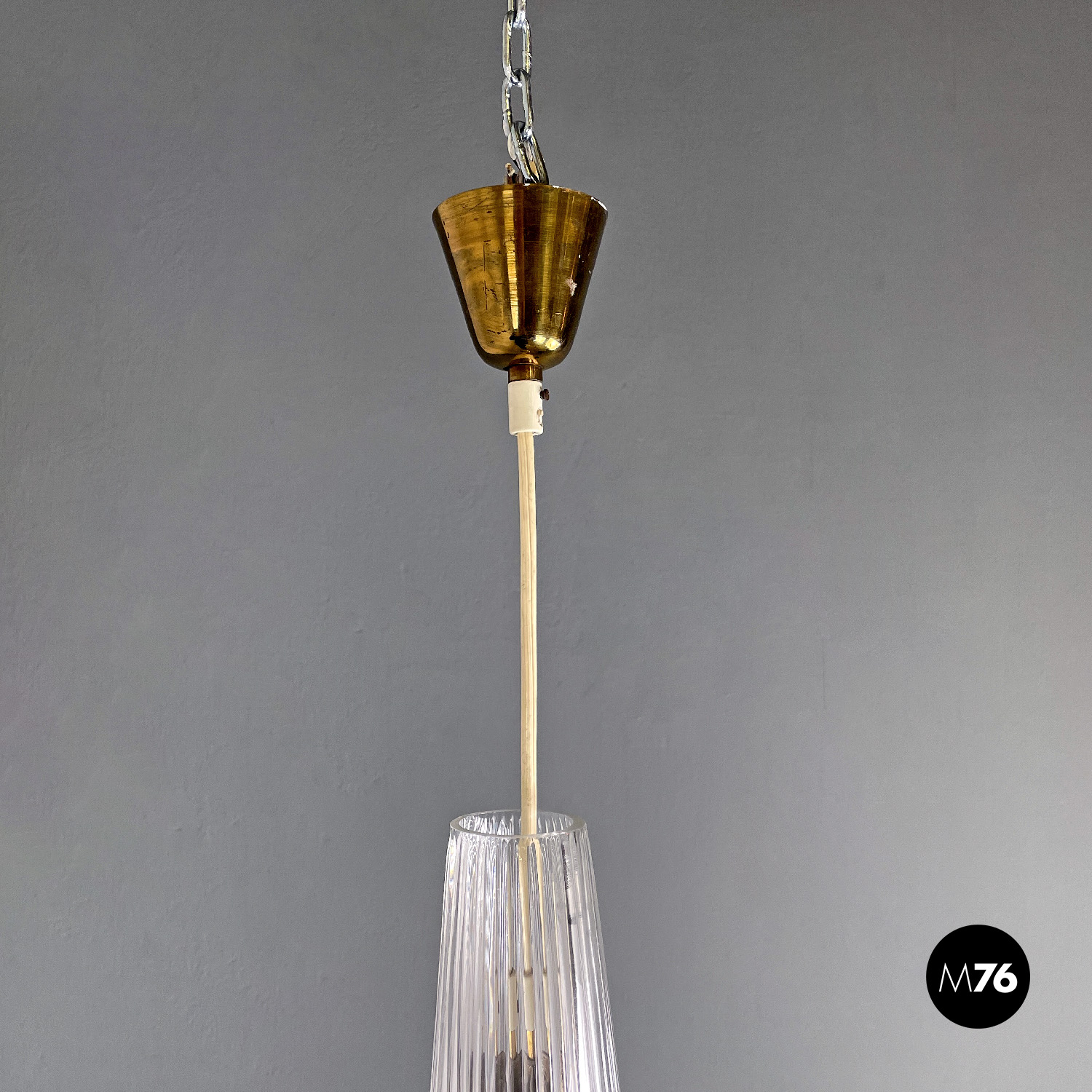 Lampadario a base tonda in vetro. Il diffusore è allungato con scanalatura verticale, nella parte centrale il vetro si stringe creando uno scalino. L’attacco al soffitto è di forma conica in plastica dorata.