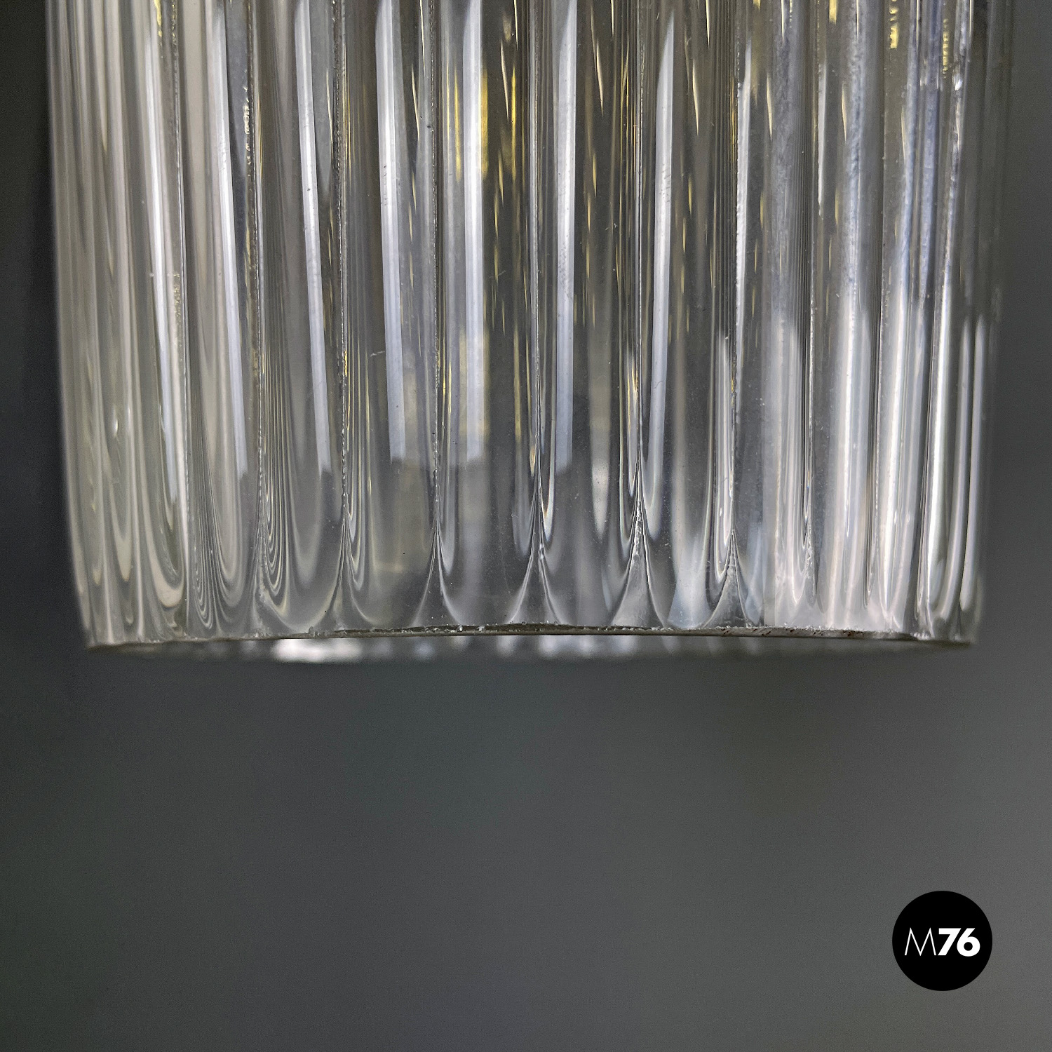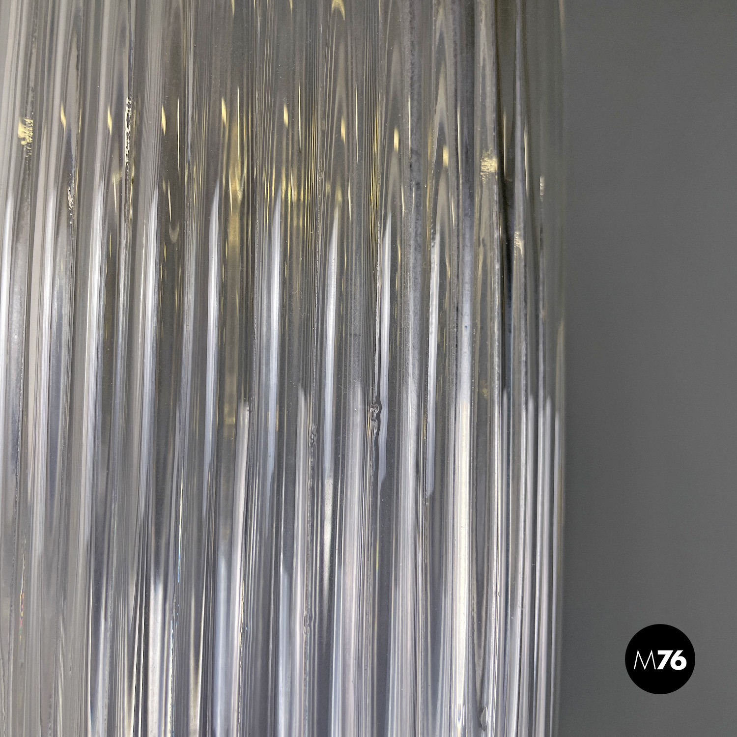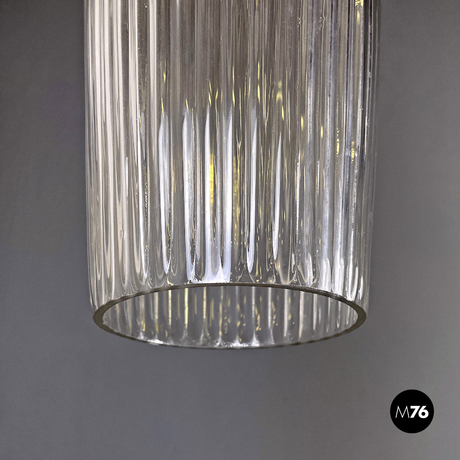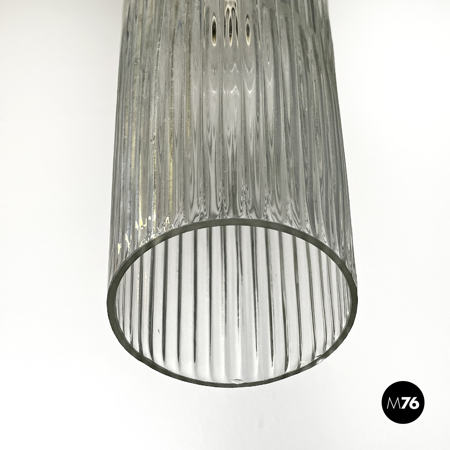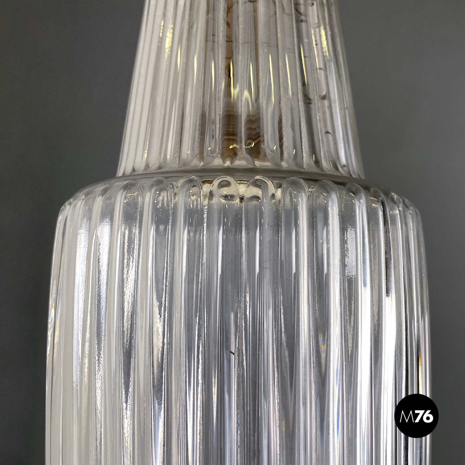 Lampadario a base tonda in vetro. Il diffusore è allungato con scanalatura verticale, nella parte centrale il vetro si stringe creando uno scalino. L’attacco al soffitto è di forma conica in plastica dorata.