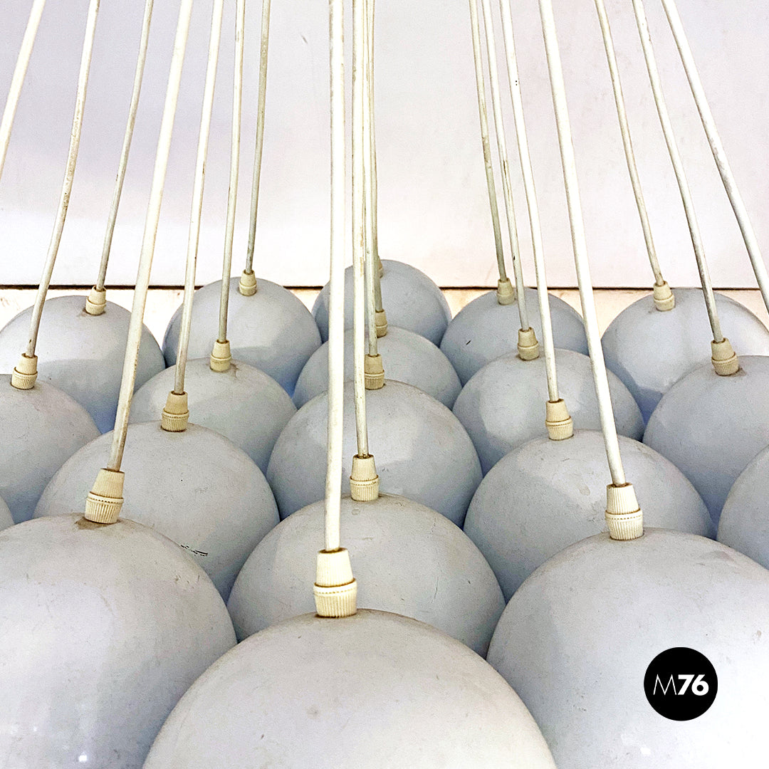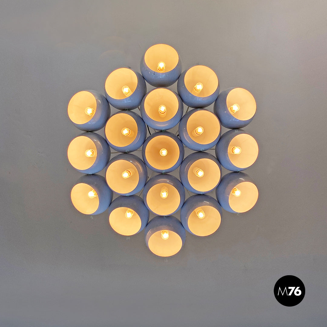 Lampadario con struttura a grappolo a diciannove luci, con paralumi sferici in metallo bianco sospesi a contatto tra loro.
