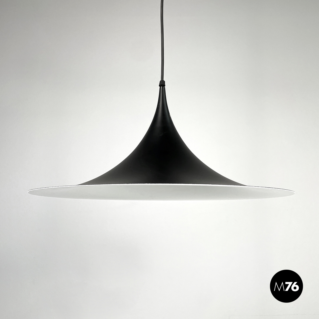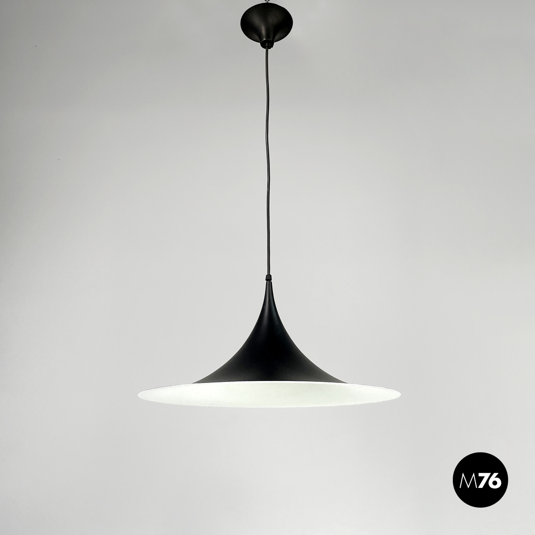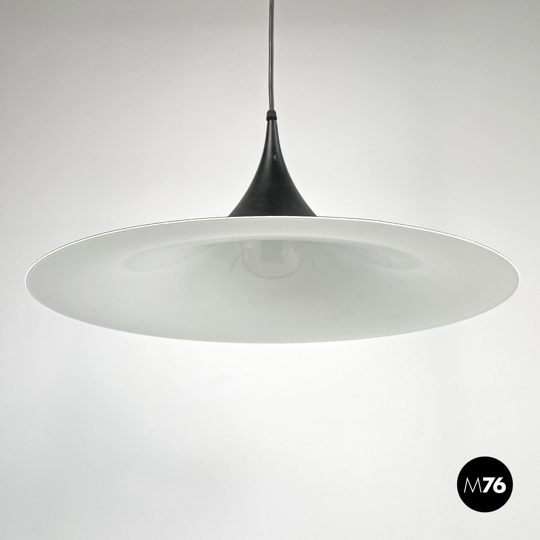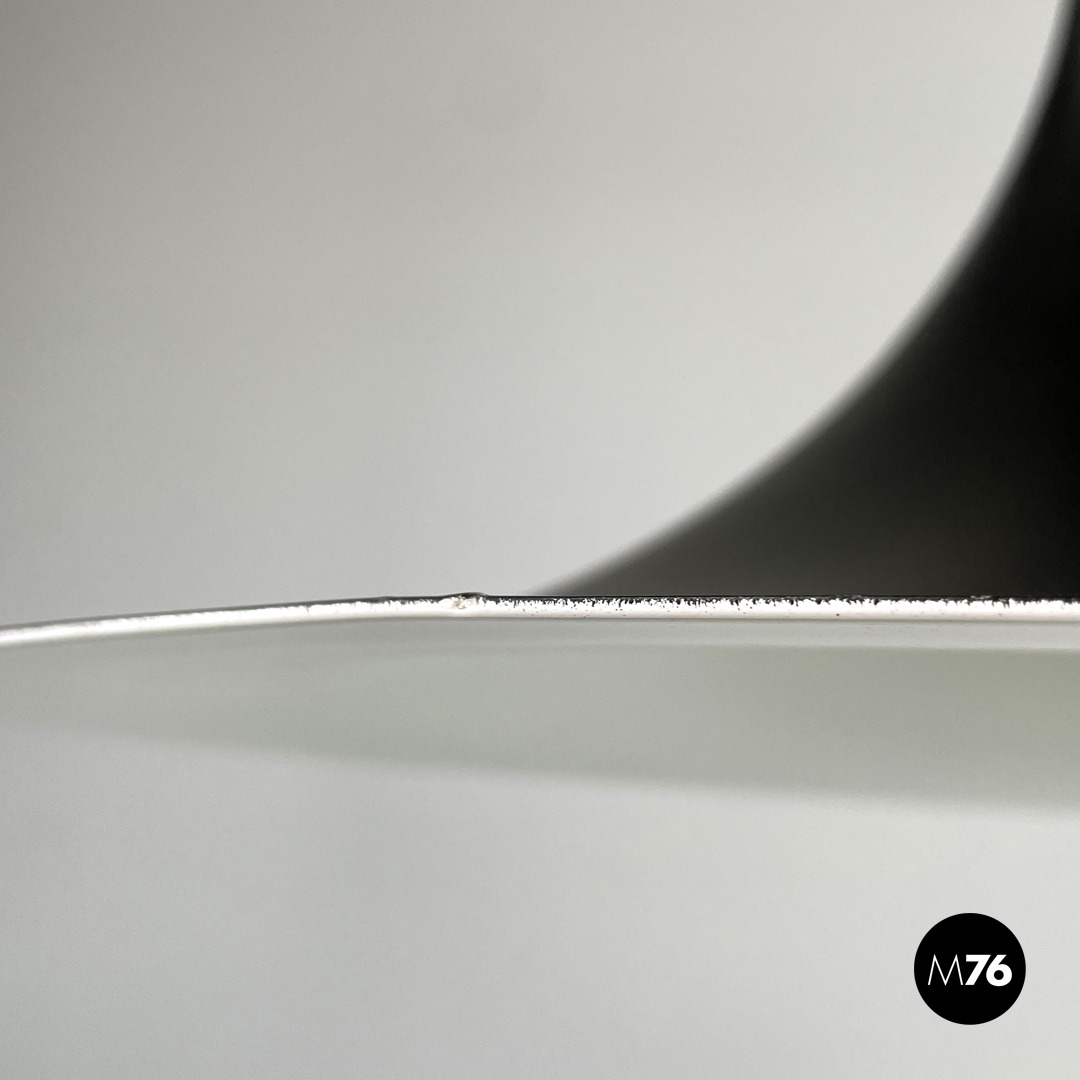 Lampadario modello Semi, di grandi dimensioni, con paralume a base tonda in alluminio smaltato bianco all’interno e nero opaco all’esterno. Sempre in nero sono il cavo e l’attacco al soffitto.