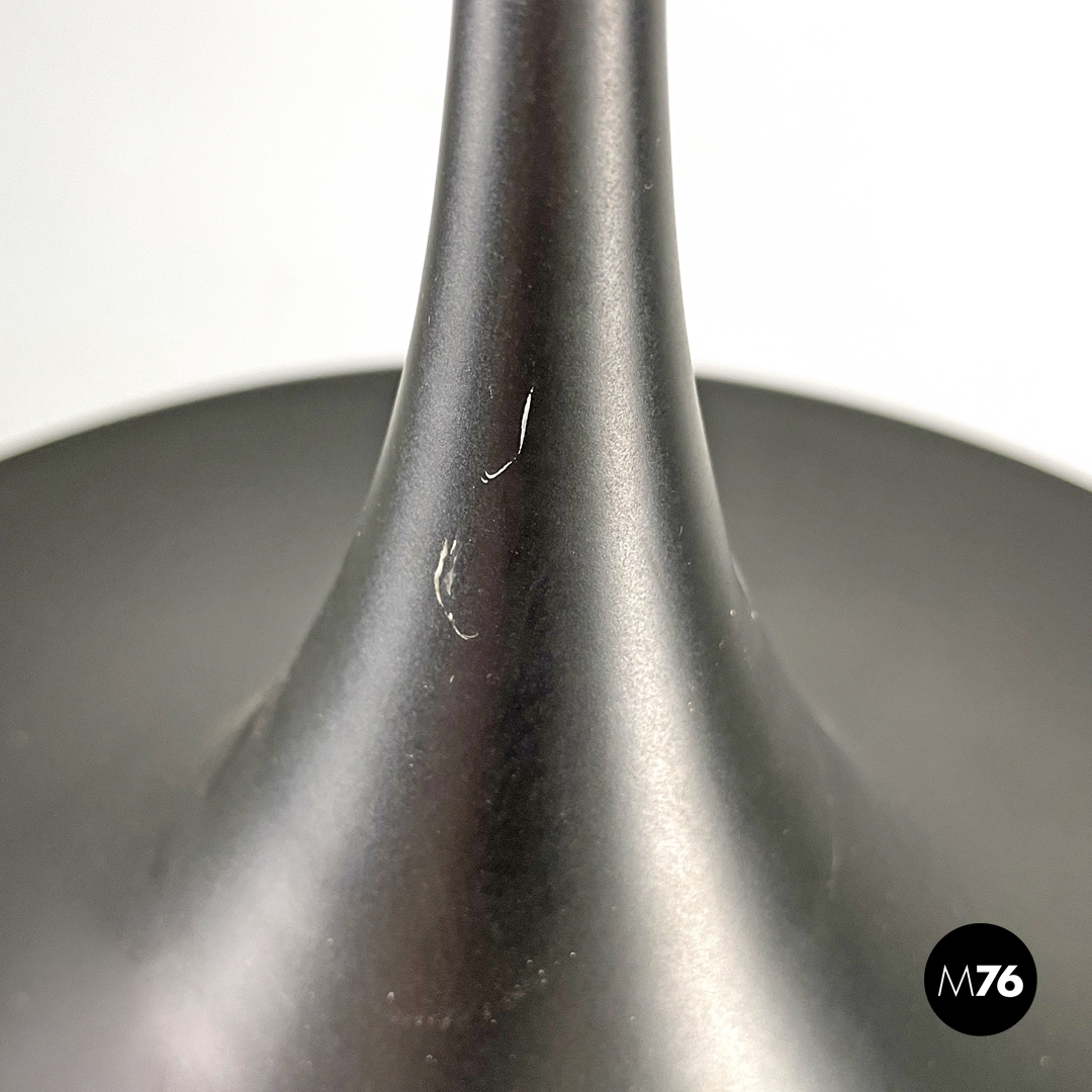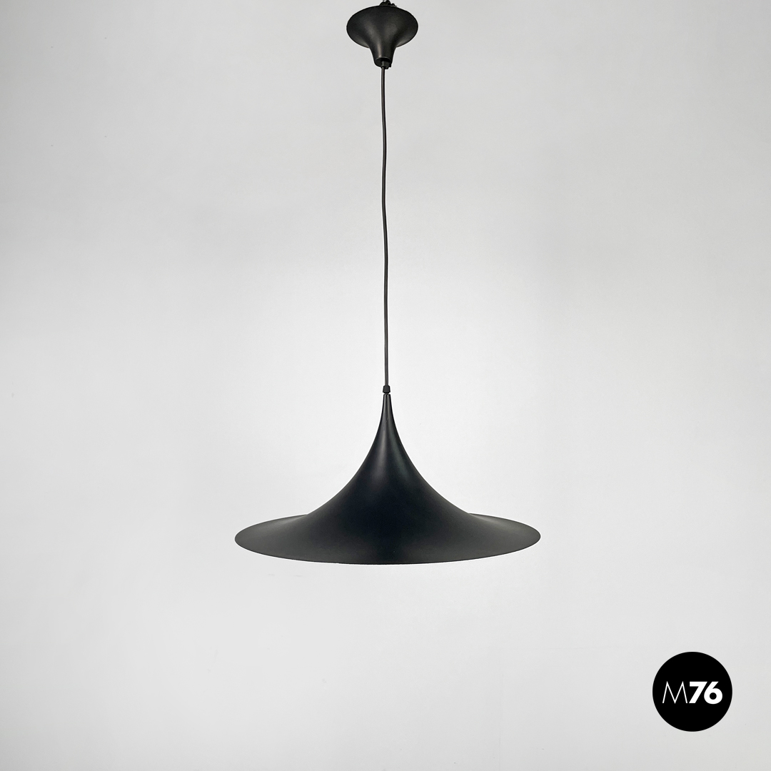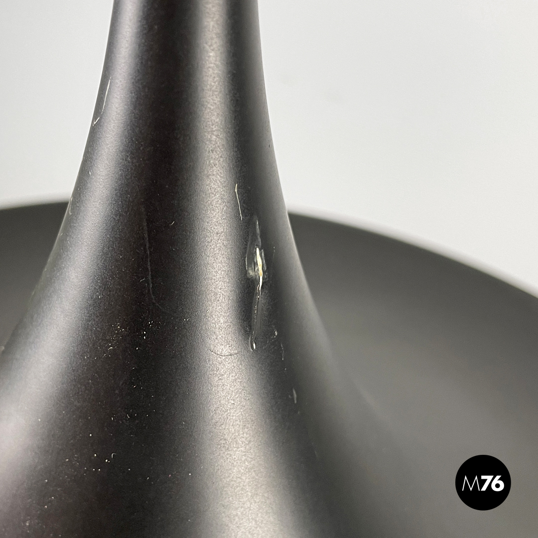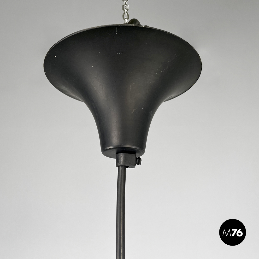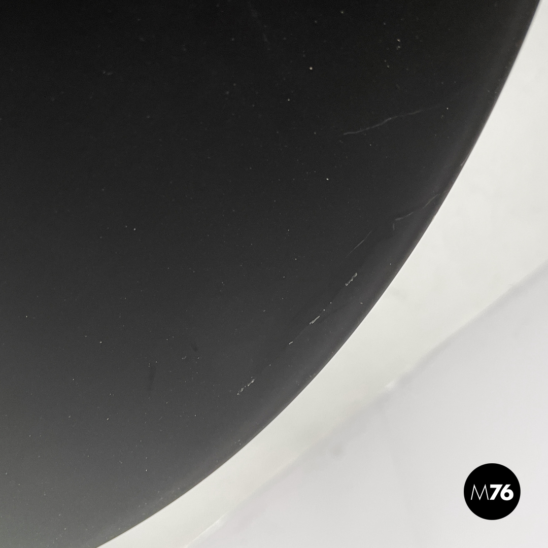Lampadario modello Semi, di grandi dimensioni, con paralume a base tonda in alluminio smaltato bianco all’interno e nero opaco all’esterno. Sempre in nero sono il cavo e l’attacco al soffitto.