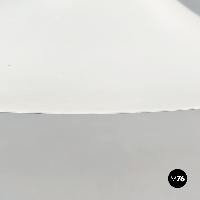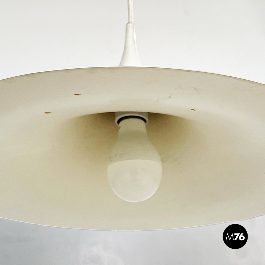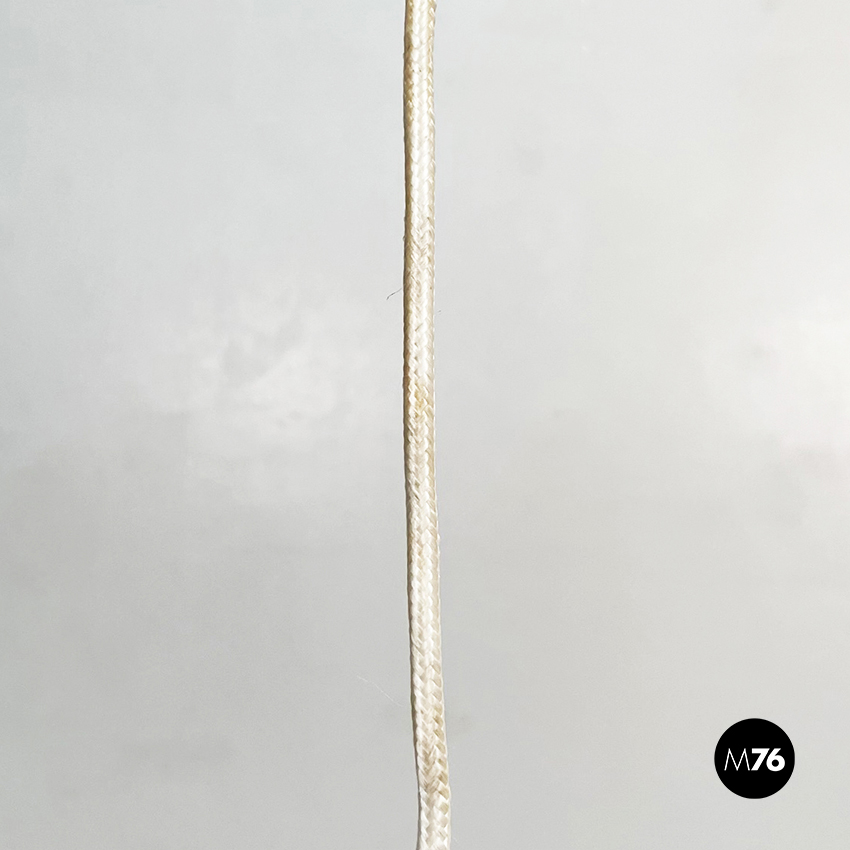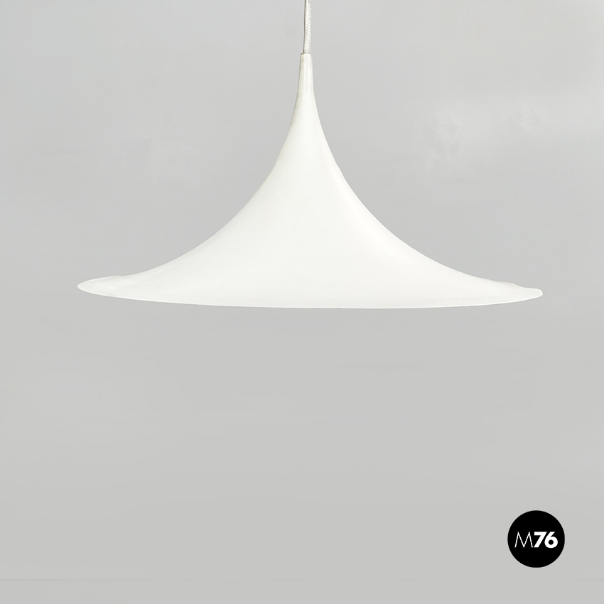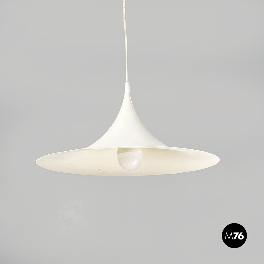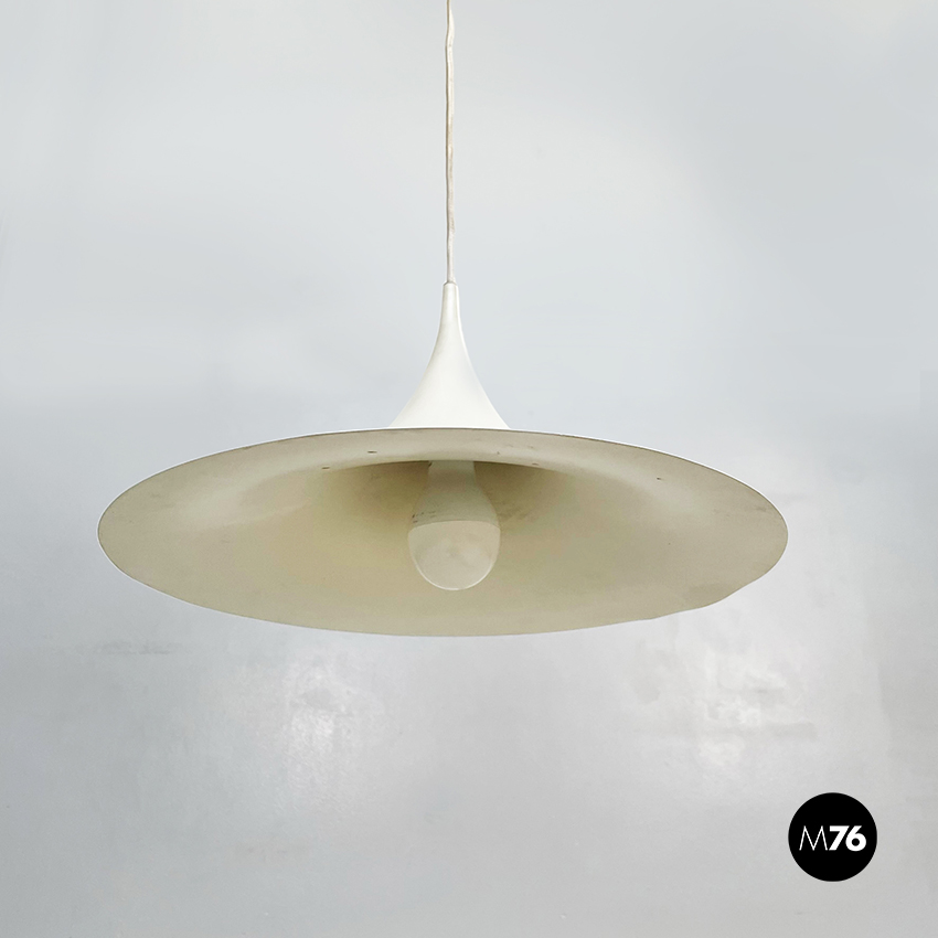 Lampadario modello Semi a base tonda. La struttura curva si stringe verso il cavo, ed è in metallo verniciato bianco.