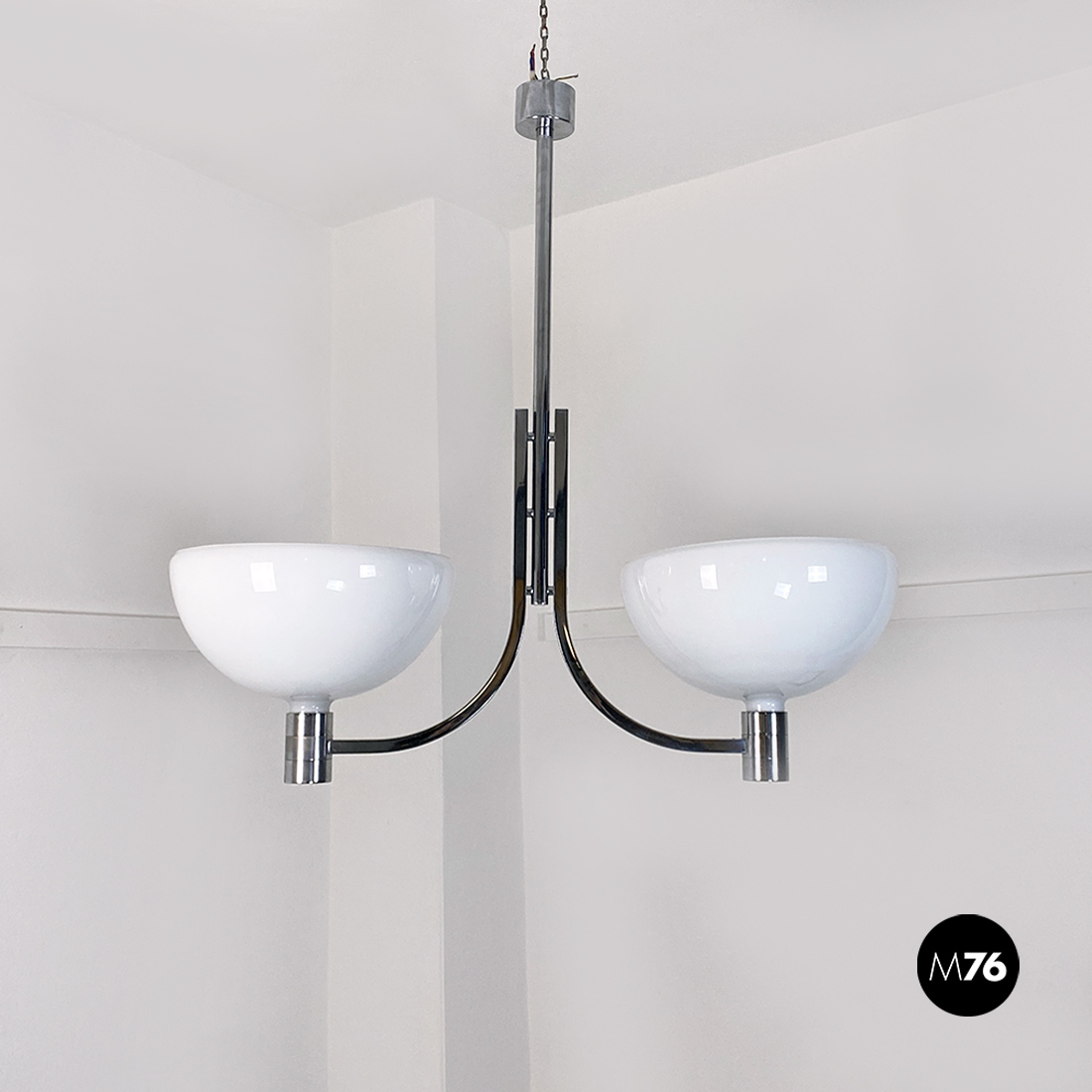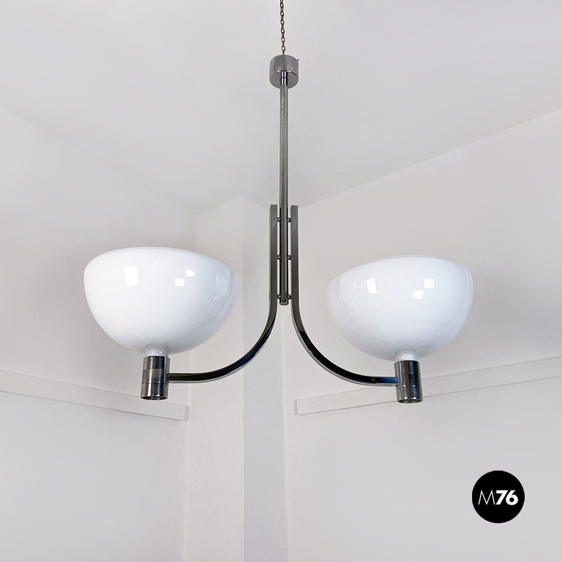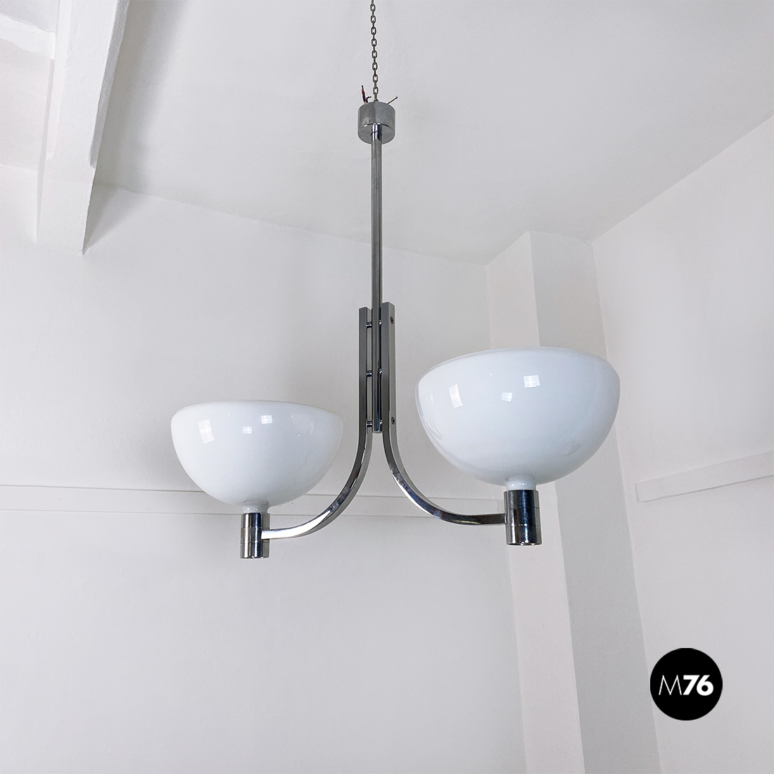 Lampadario modello AM/AS con struttura curva in acciaio cromato che sostiene due paralumi semisferici in vetro opaline lucido. Come in tutte le lampade di questa serie, presenta paralumi intercambiabili e con doppio attacco sia sulla parte alta che bassa del braccio curvo.