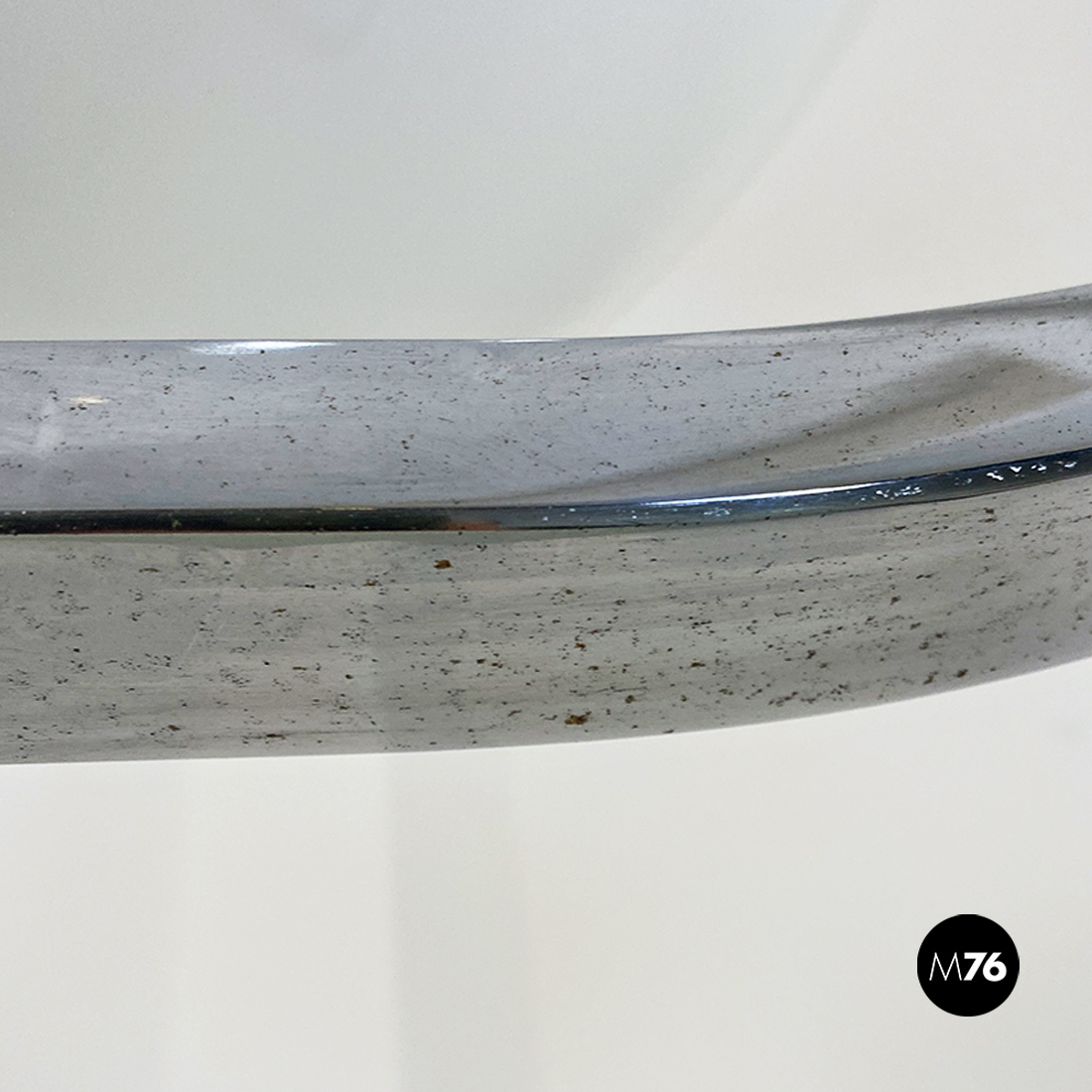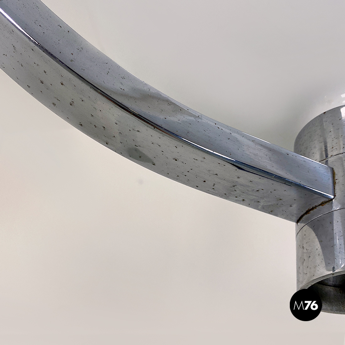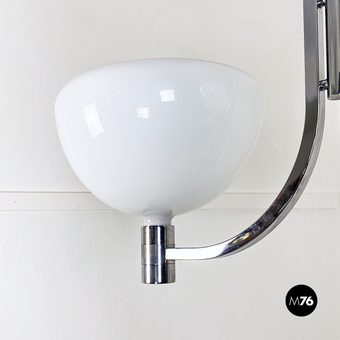 Lampadario modello AM/AS con struttura curva in acciaio cromato che sostiene due paralumi semisferici in vetro opaline lucido. Come in tutte le lampade di questa serie, presenta paralumi intercambiabili e con doppio attacco sia sulla parte alta che bassa del braccio curvo.