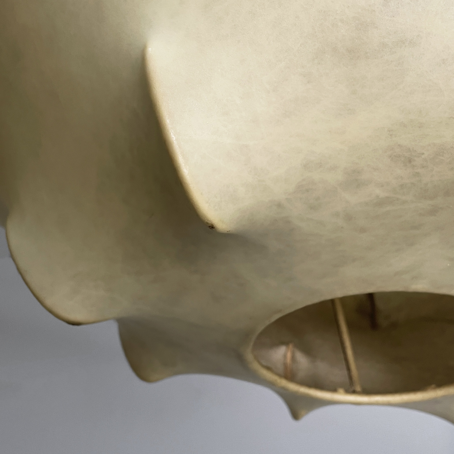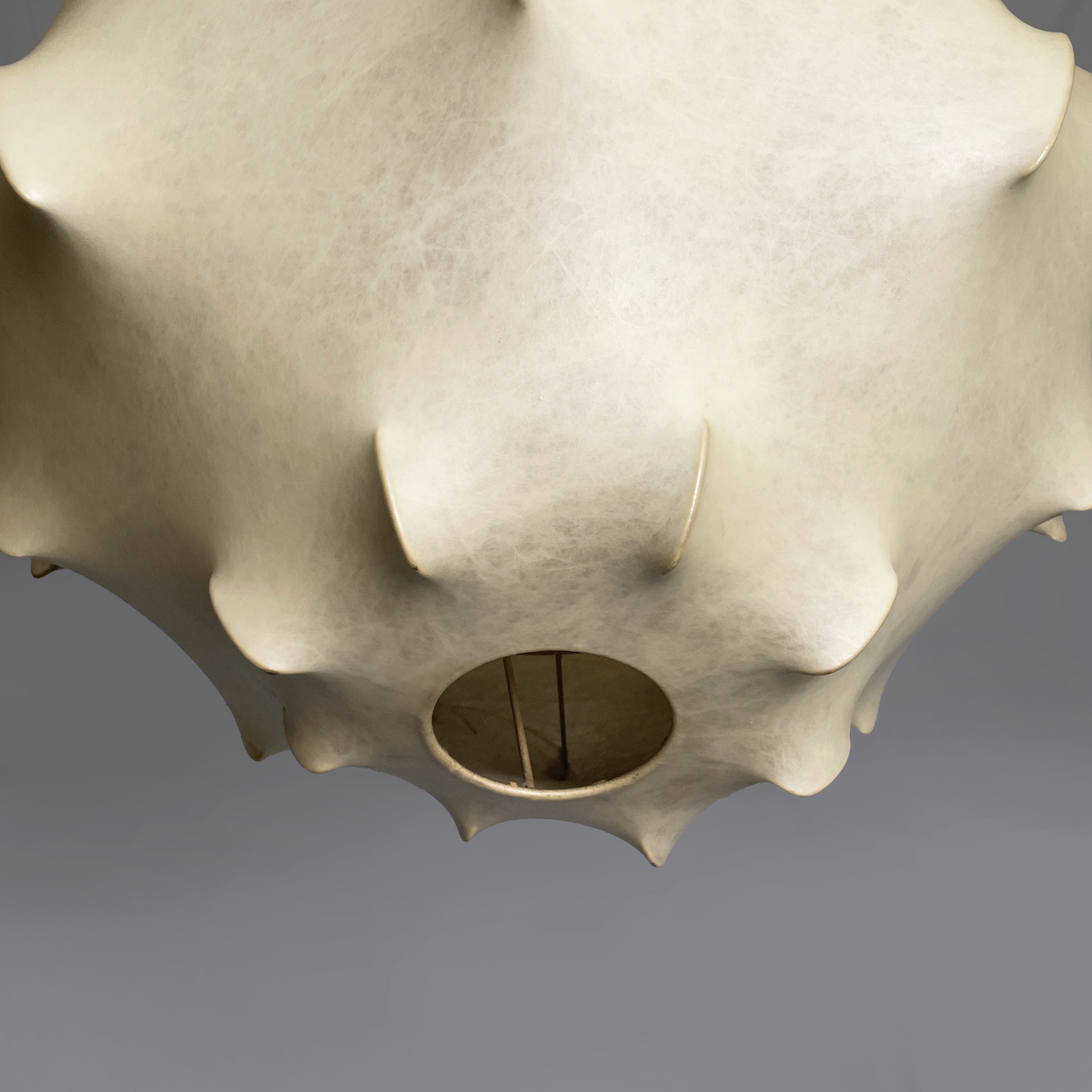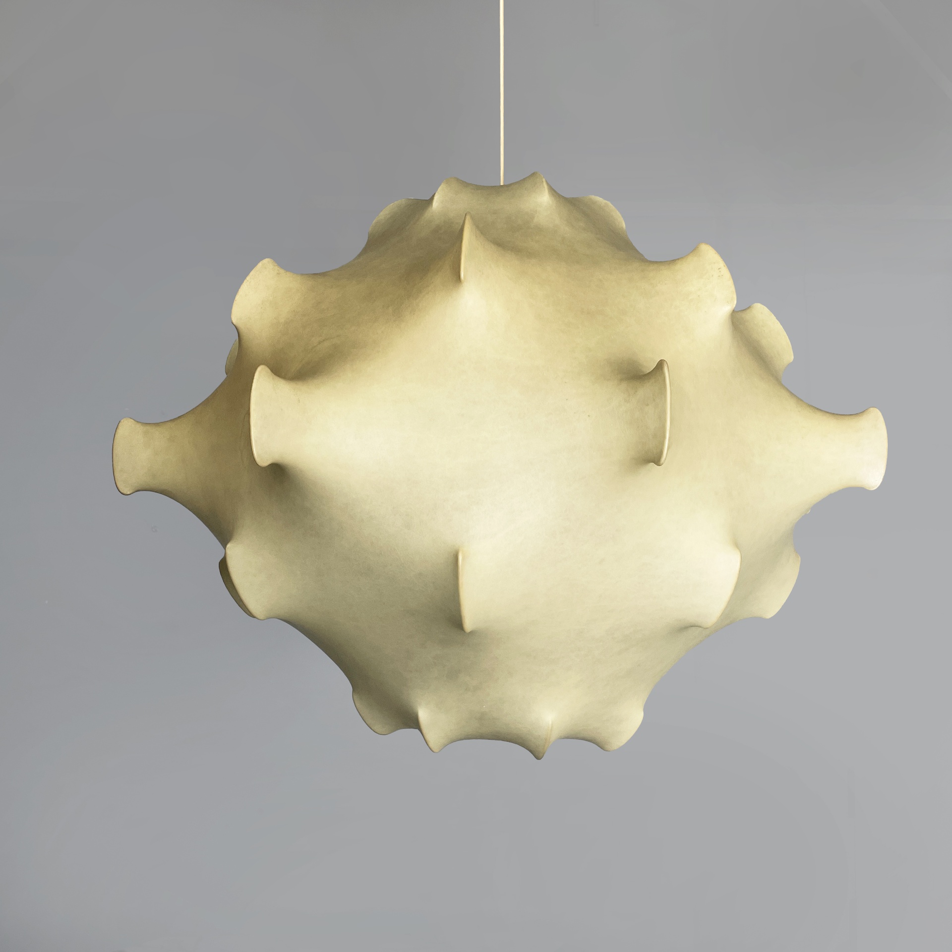 Lampadario modello Taraxacum con diffusore con diffusore sagomato in cocoon, con struttura interna in tondino di metallo verniciato bianco. Attacco al soffitto cilindrico.