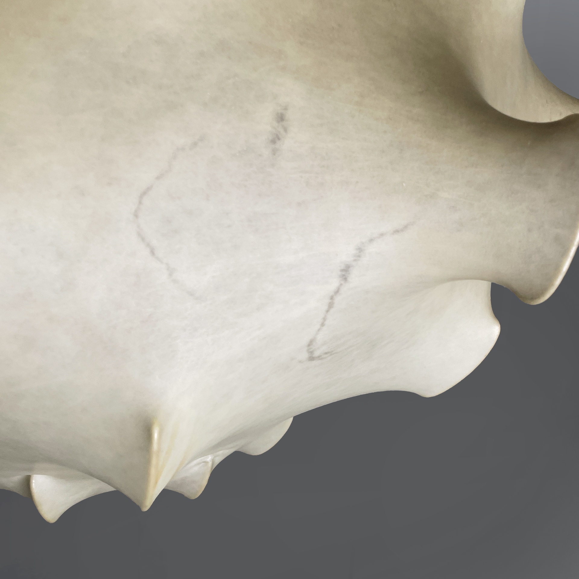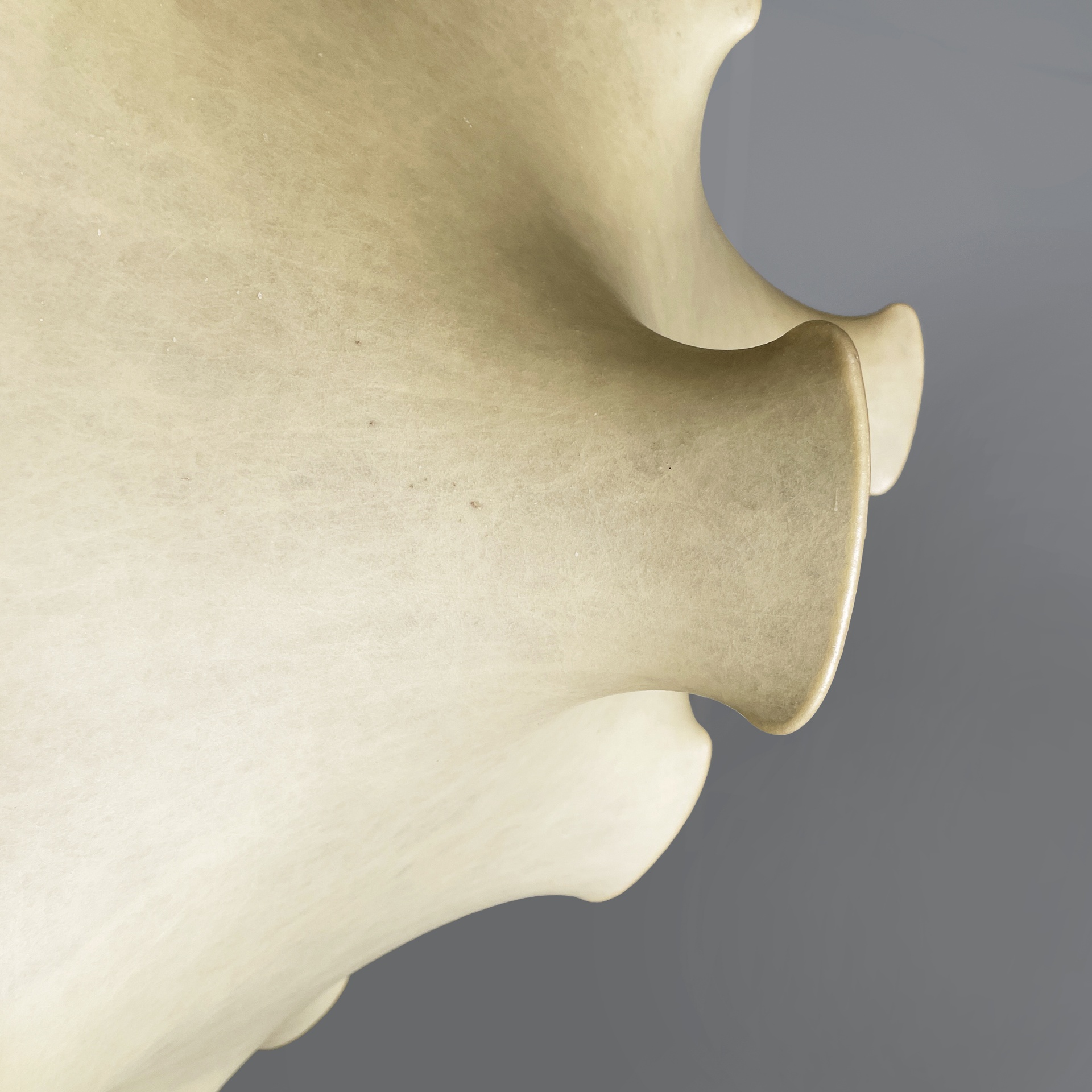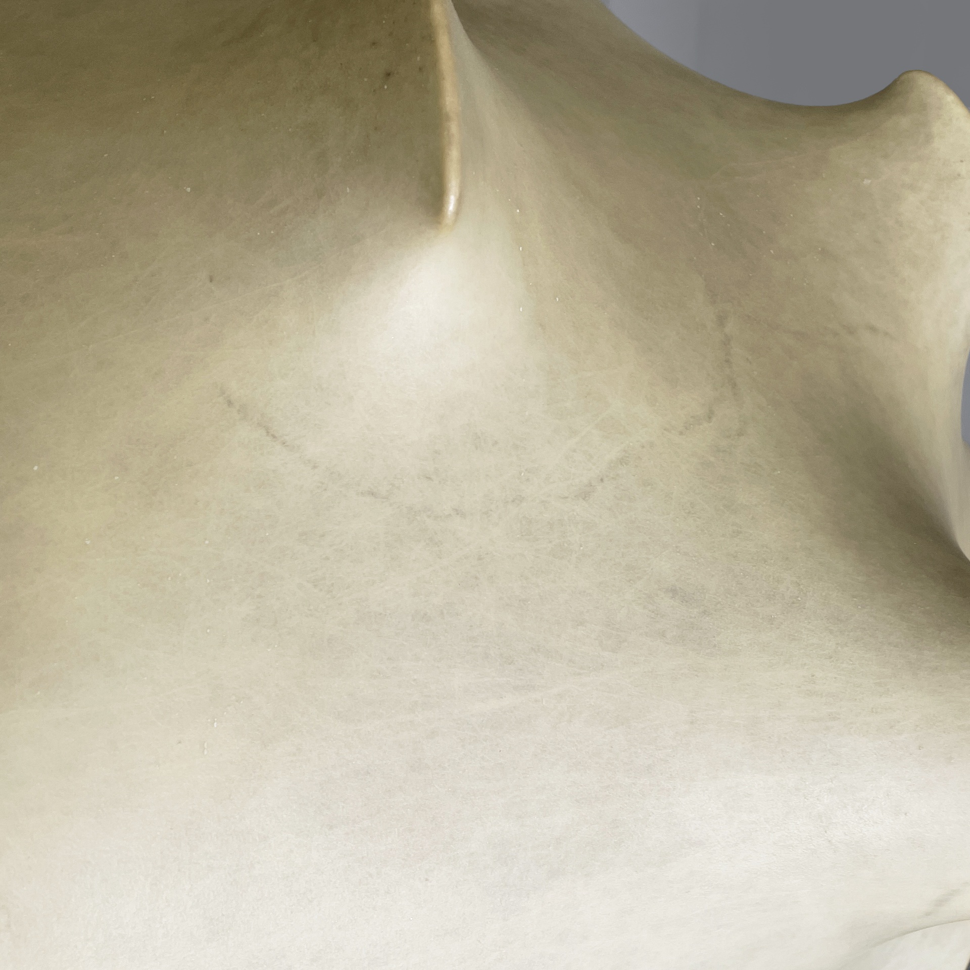 Lampadario modello Taraxacum con diffusore con diffusore sagomato in cocoon, con struttura interna in tondino di metallo verniciato bianco. Attacco al soffitto cilindrico.