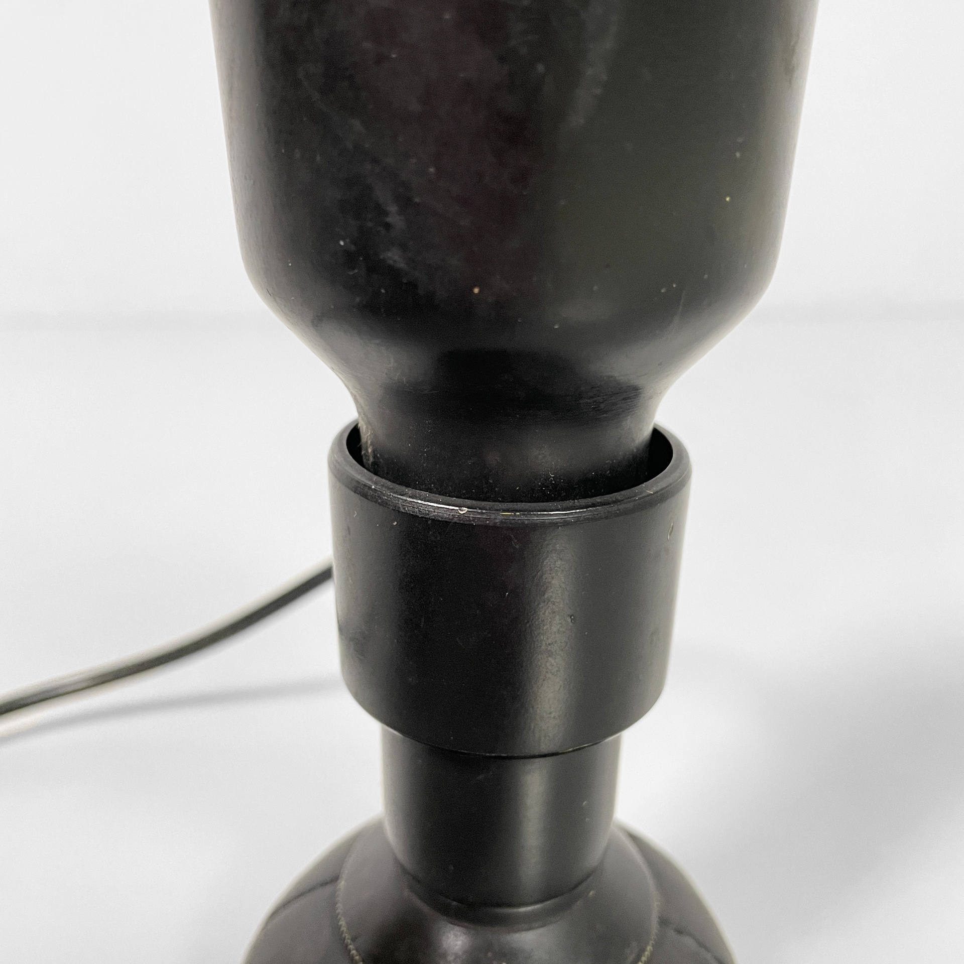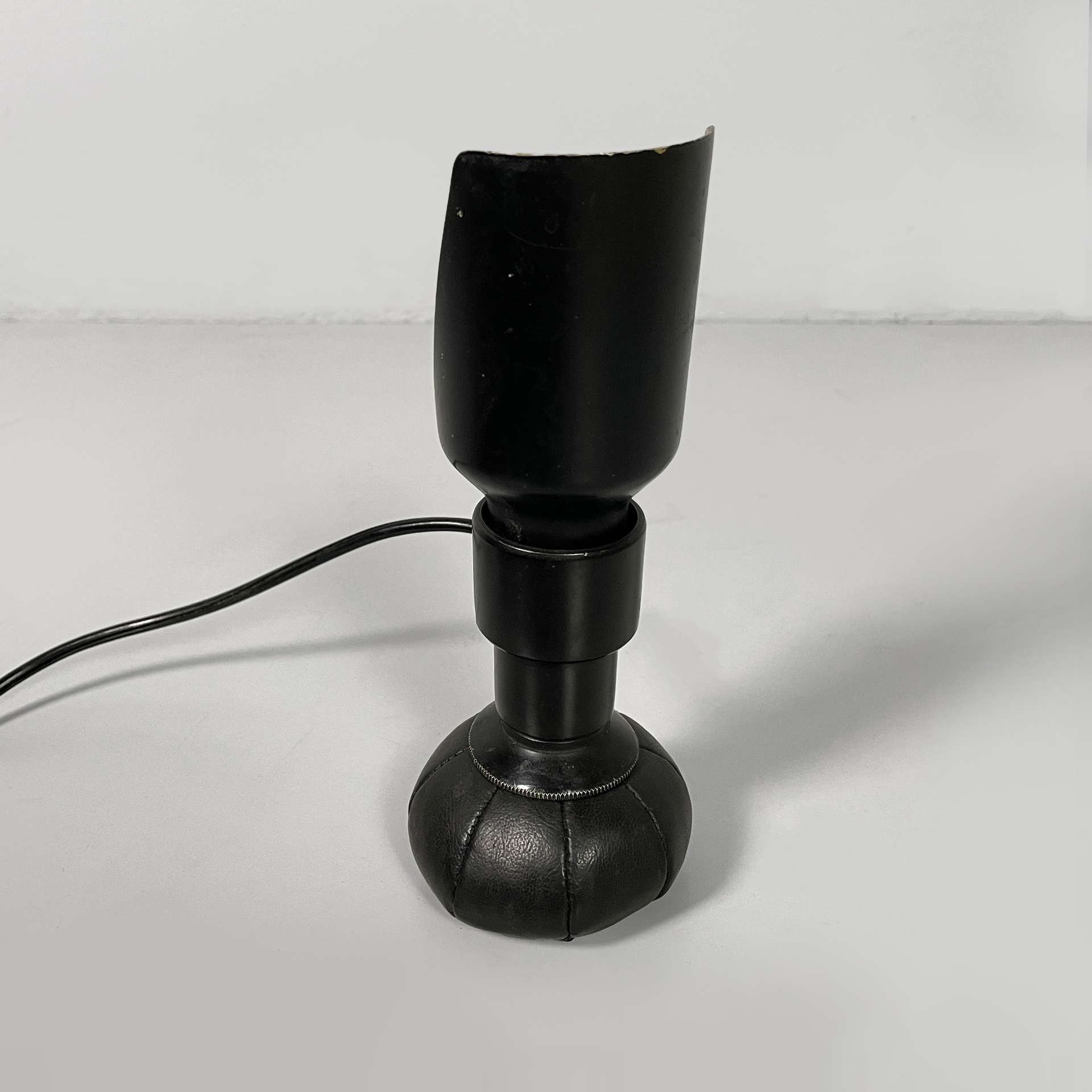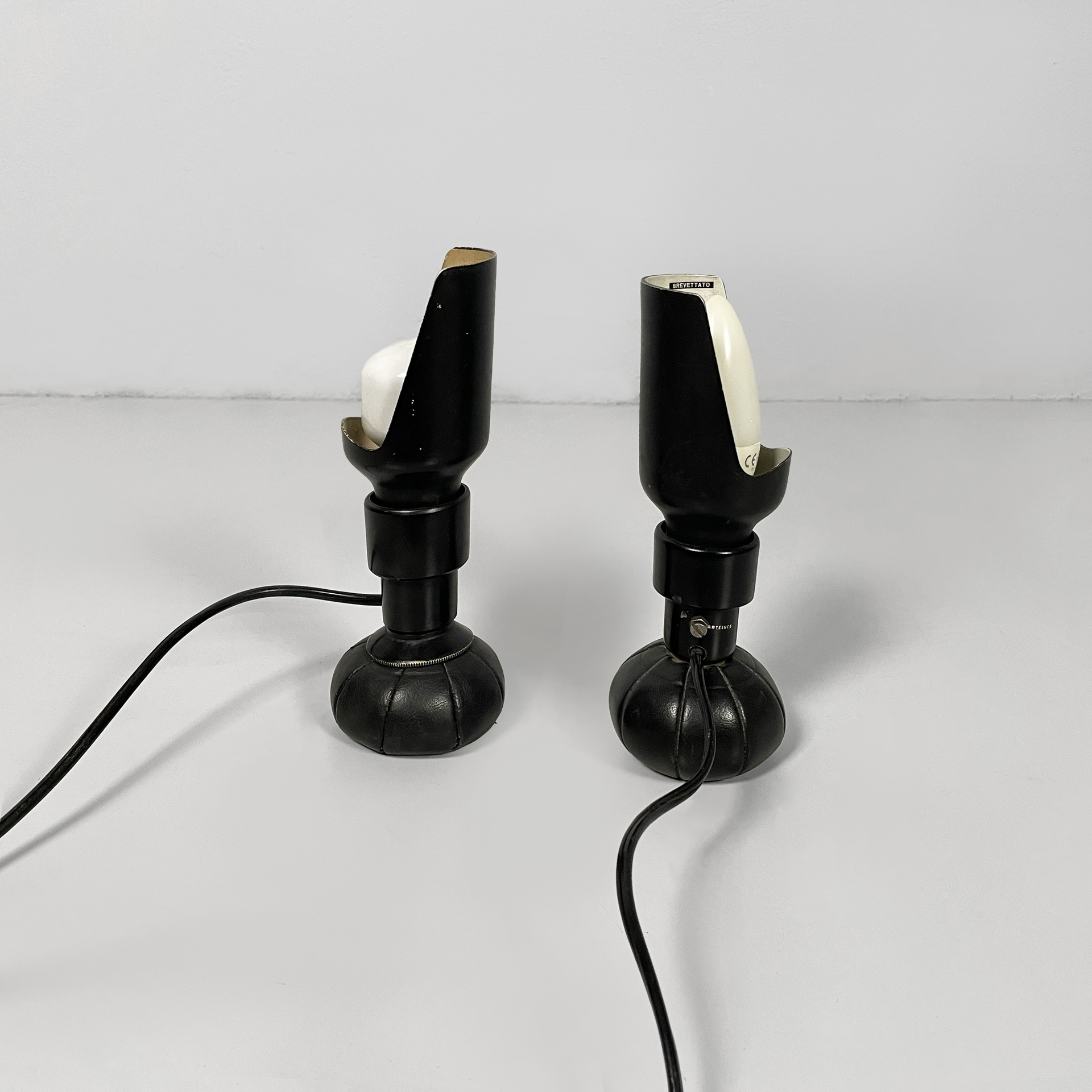 Coppia di lampade da tavolo modello 600P con diffusore in lamina di metallo curvato bianco internamente e nero esternamente. La base tonda è in pelle nera.