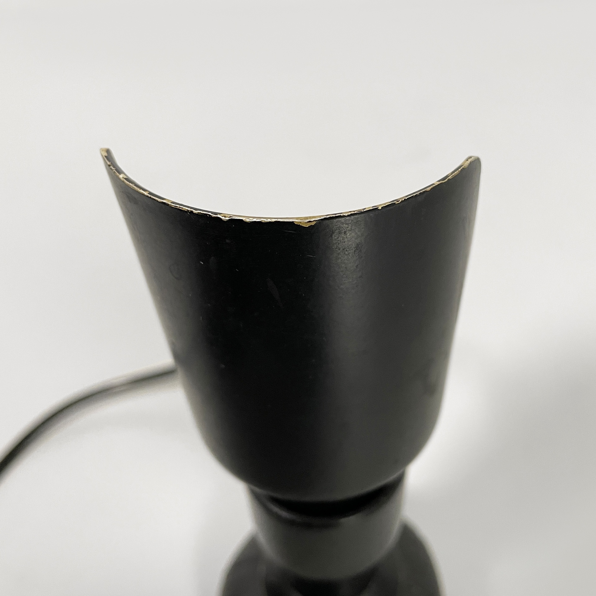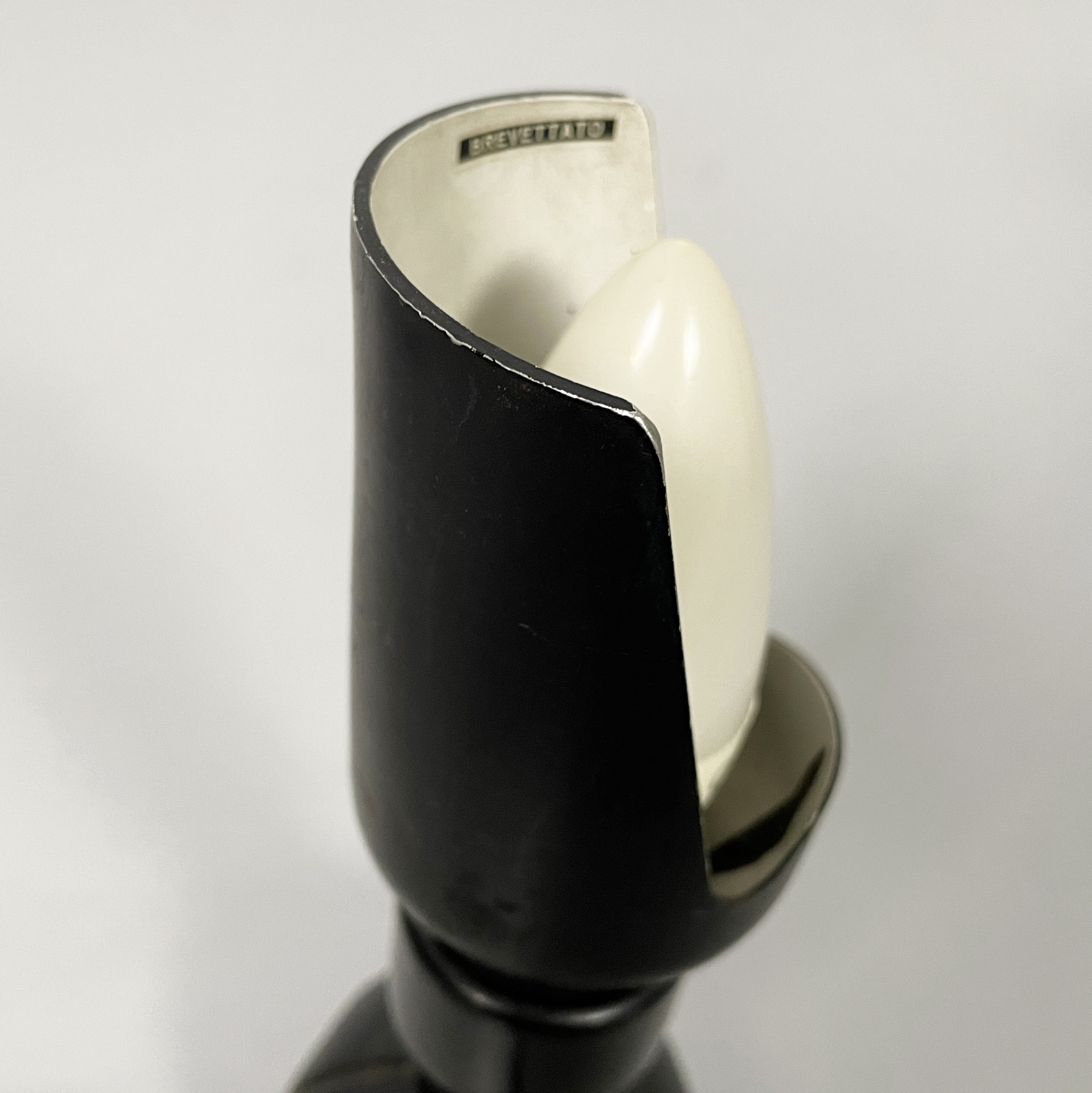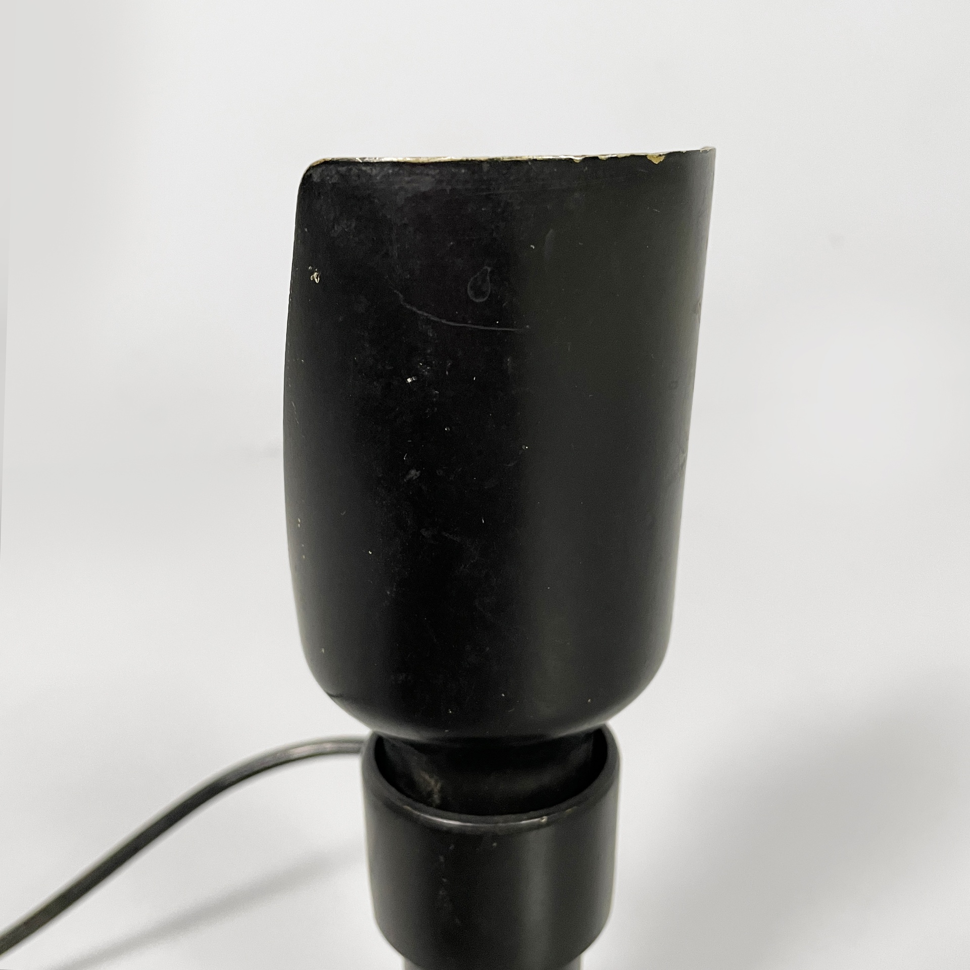 Coppia di lampade da tavolo modello 600P con diffusore in lamina di metallo curvato bianco internamente e nero esternamente. La base tonda è in pelle nera.