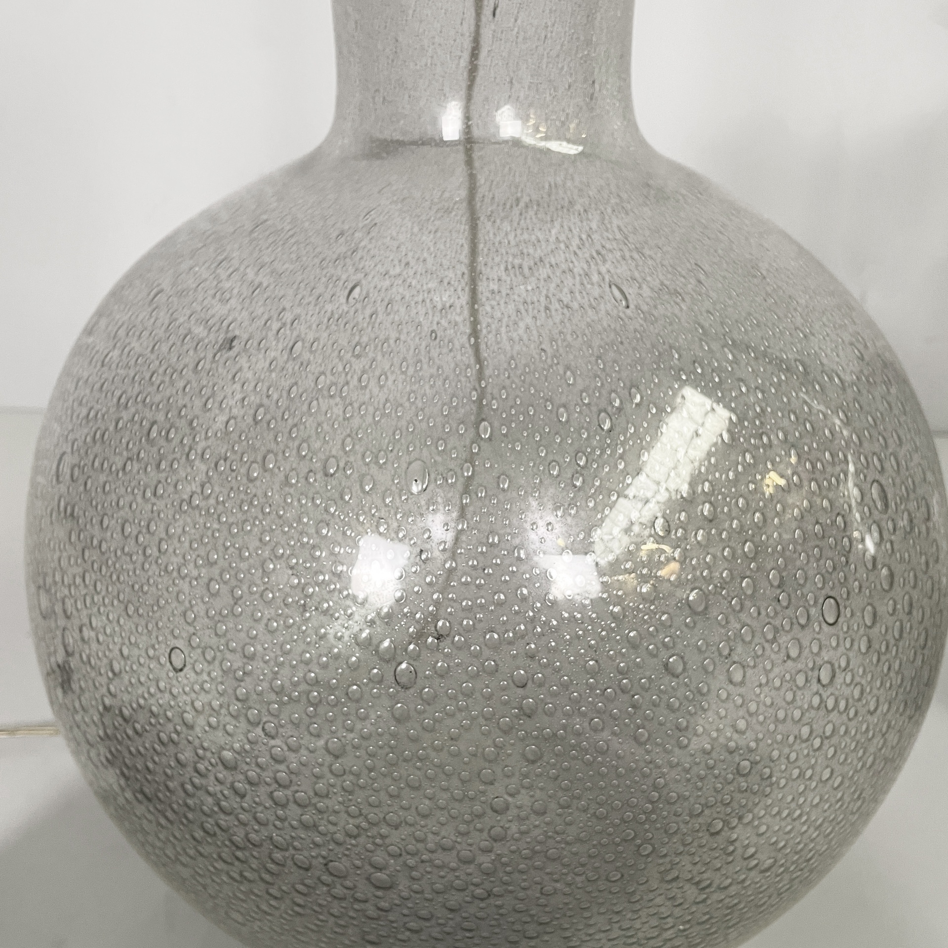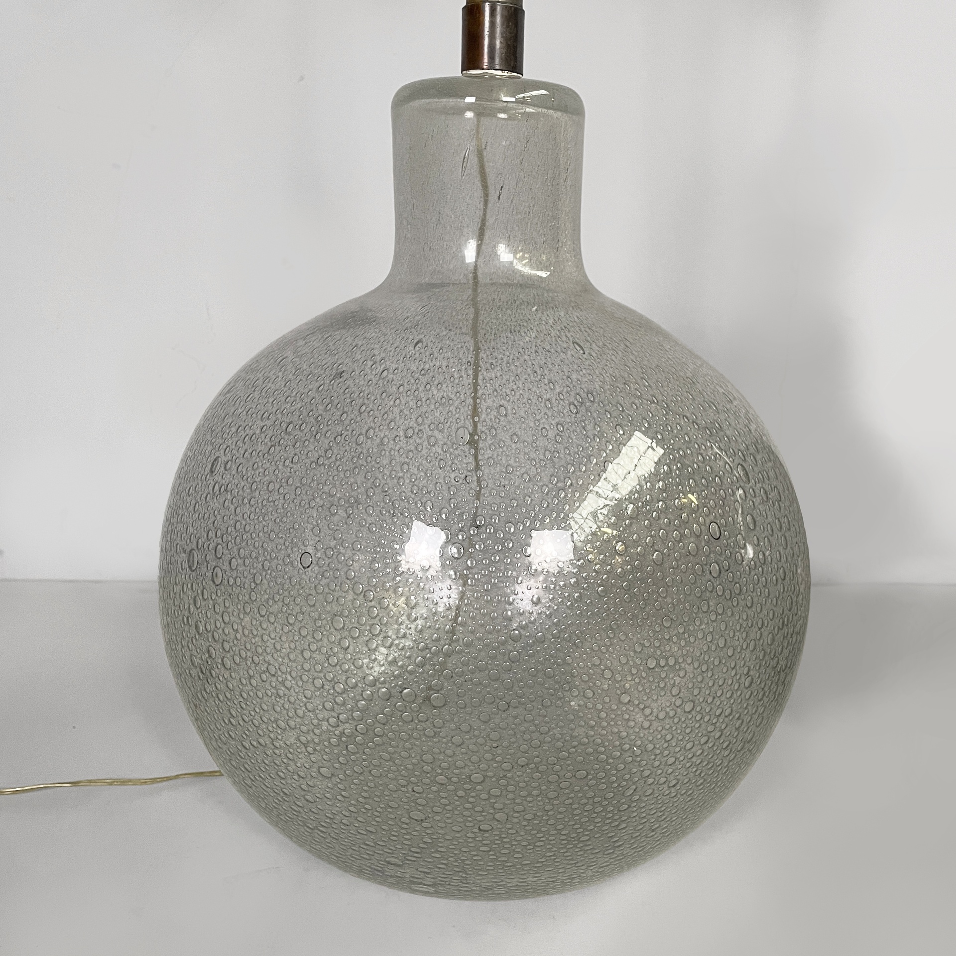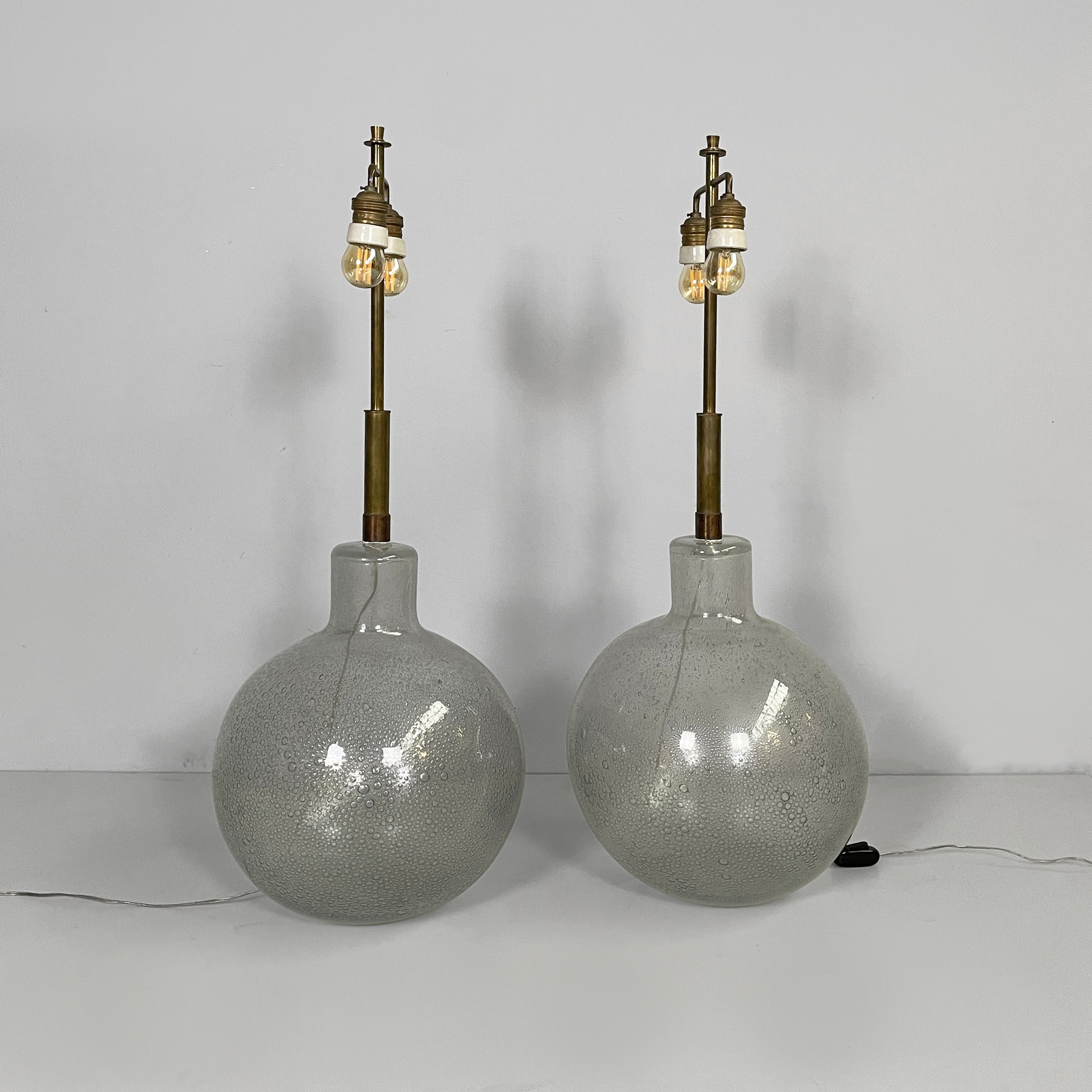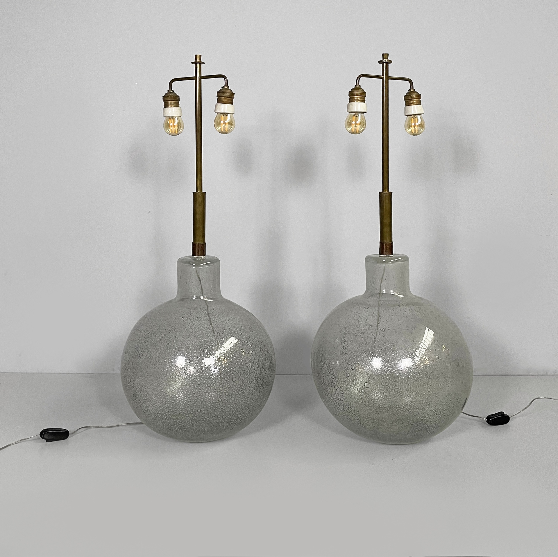 Coppia di lampade da tavolo in ottone e vetro bollicine di Murano. Nella parte superiore sono presenti due lampadine, sostenute da due bracci e una struttura in ottone. La base a sfera con vetro a bollicine.