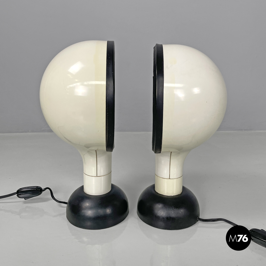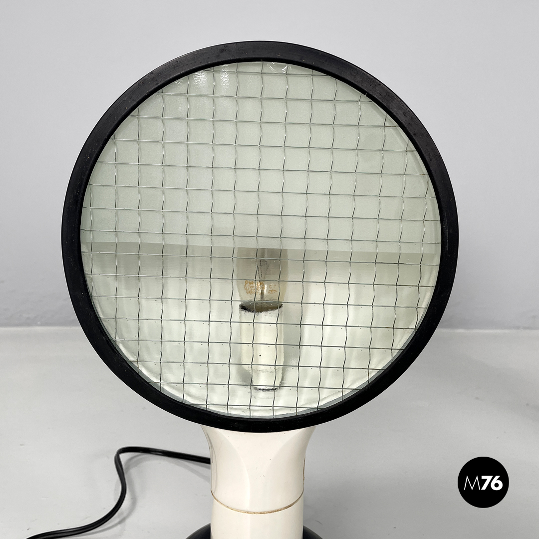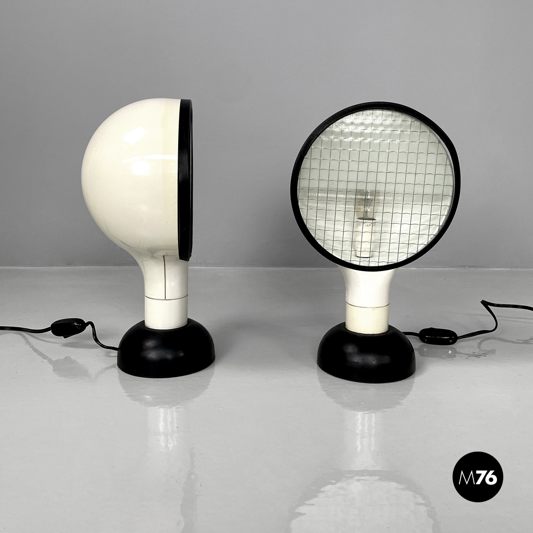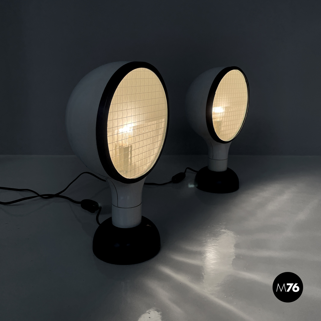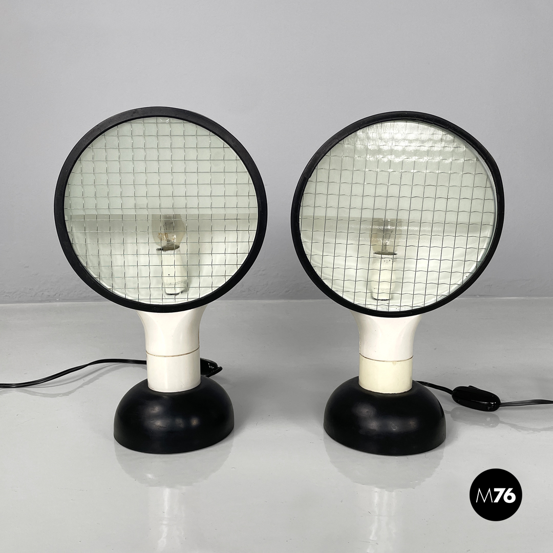 Coppia di lampade da tavolo o applique modello Drive a base tonda. La struttura è in plastica bianca, dalle forme curve e stondate. La parte superiore è di forma sferica, la parte frontale è “tagliata” con il vetro incorniciato da una cornice in gomma nera, dove si trova il punto luce. Il vetro è per metà opaco ed ha internamente una griglia in ferro. La base è in plastica nera.