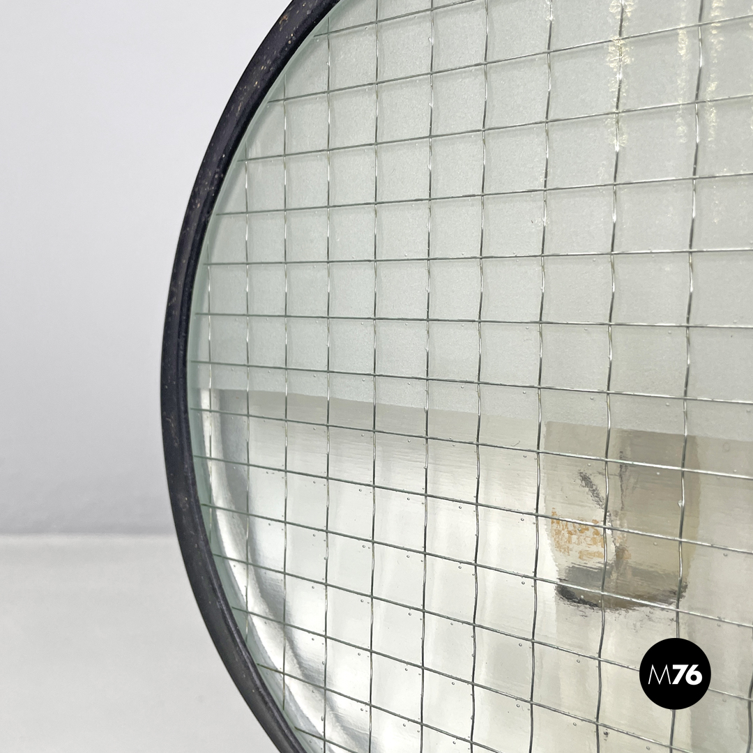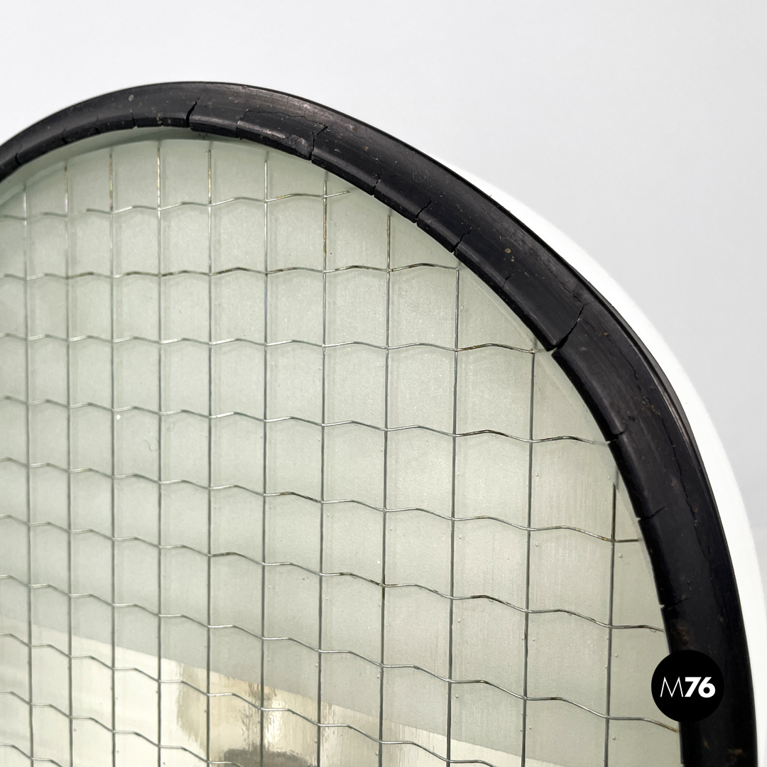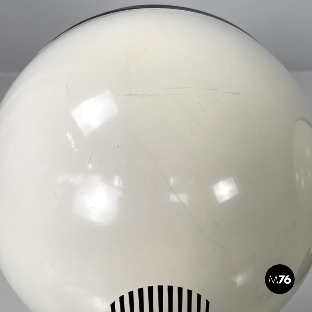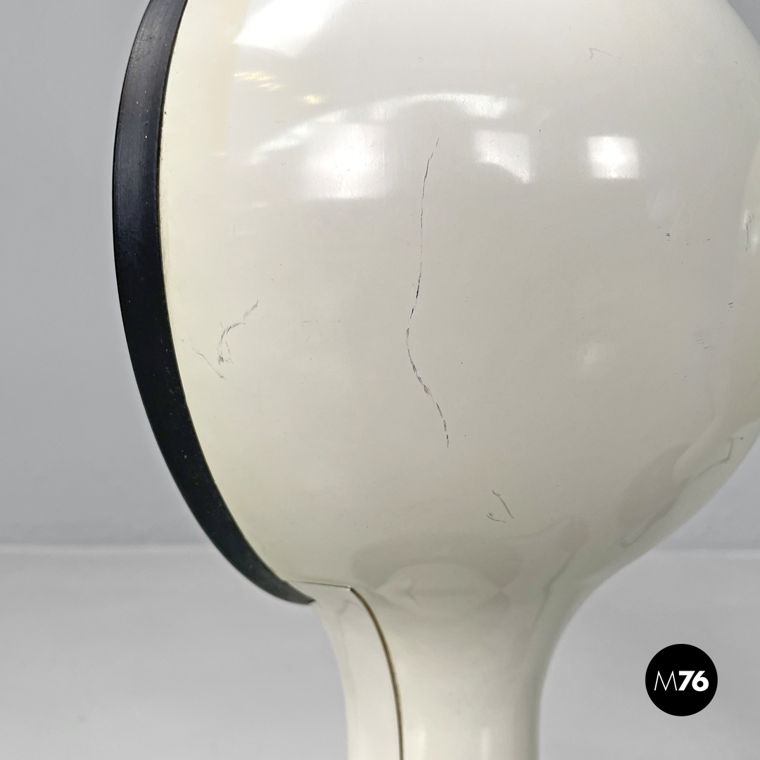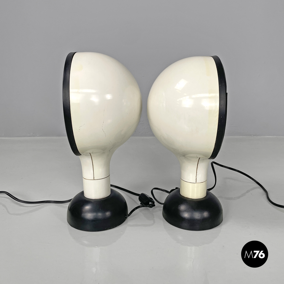 Coppia di lampade da tavolo o applique modello Drive a base tonda. La struttura è in plastica bianca, dalle forme curve e stondate. La parte superiore è di forma sferica, la parte frontale è “tagliata” con il vetro incorniciato da una cornice in gomma nera, dove si trova il punto luce. Il vetro è per metà opaco ed ha internamente una griglia in ferro. La base è in plastica nera.