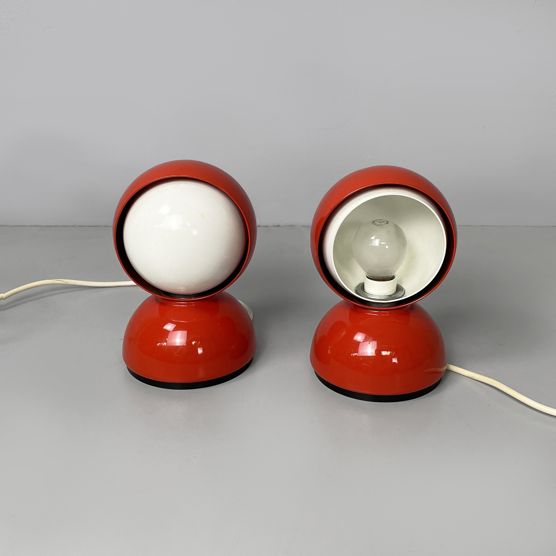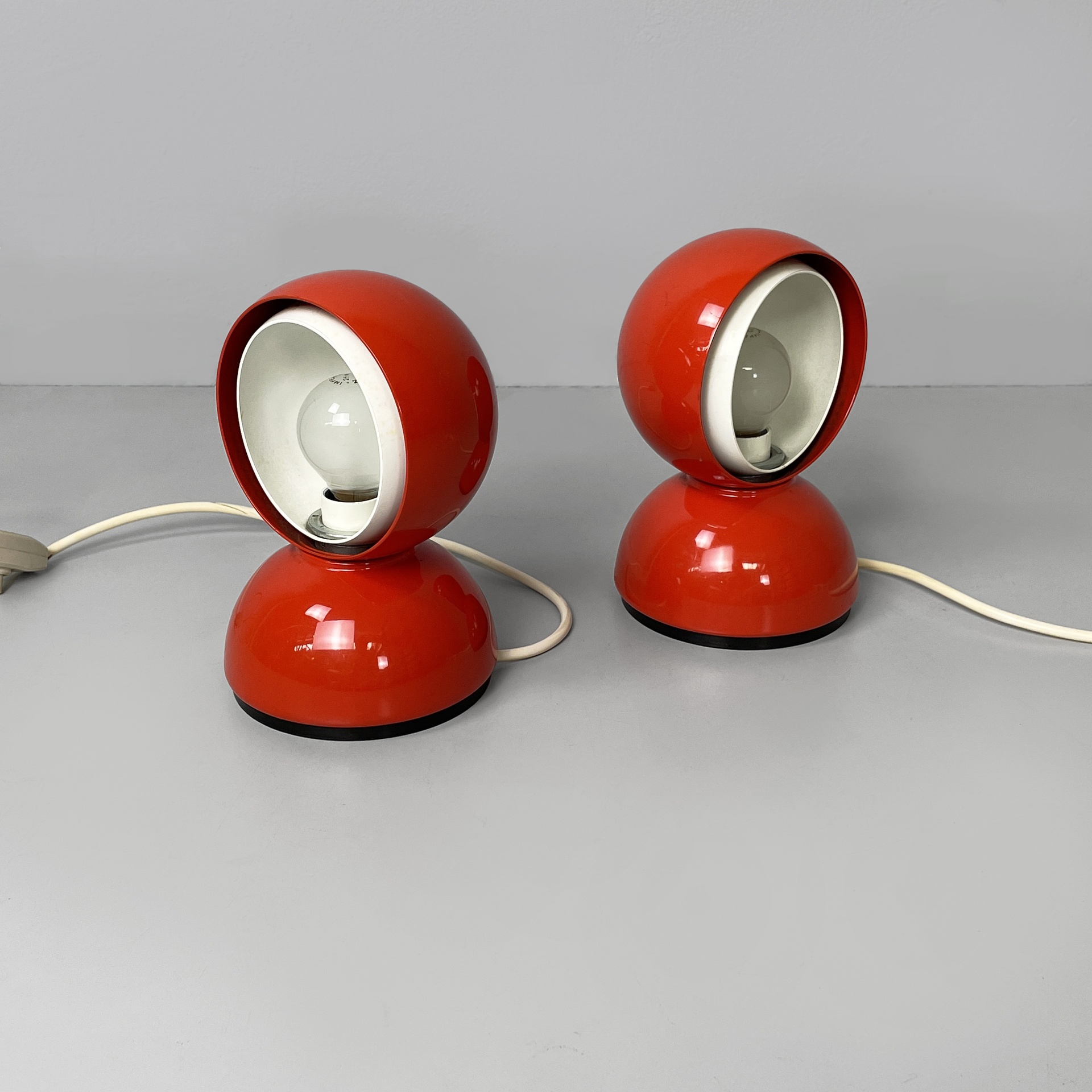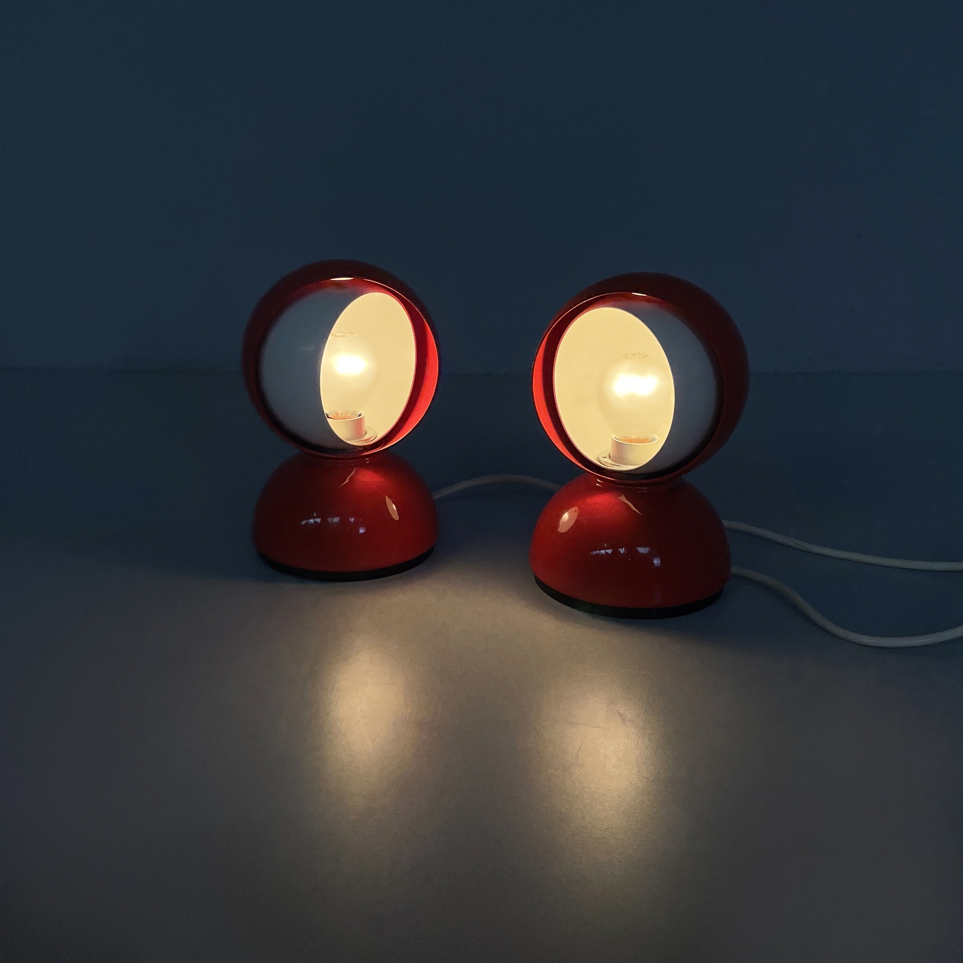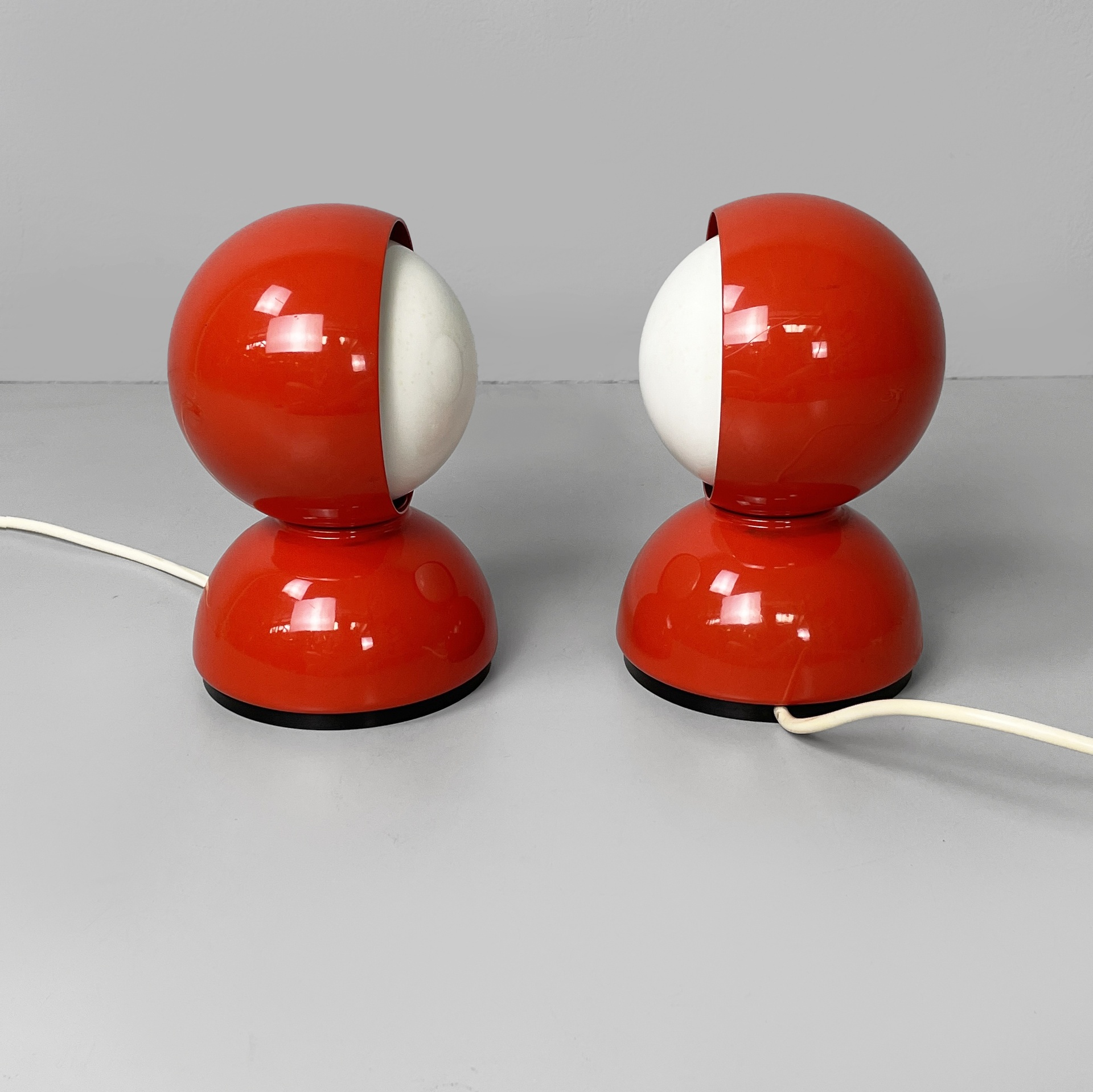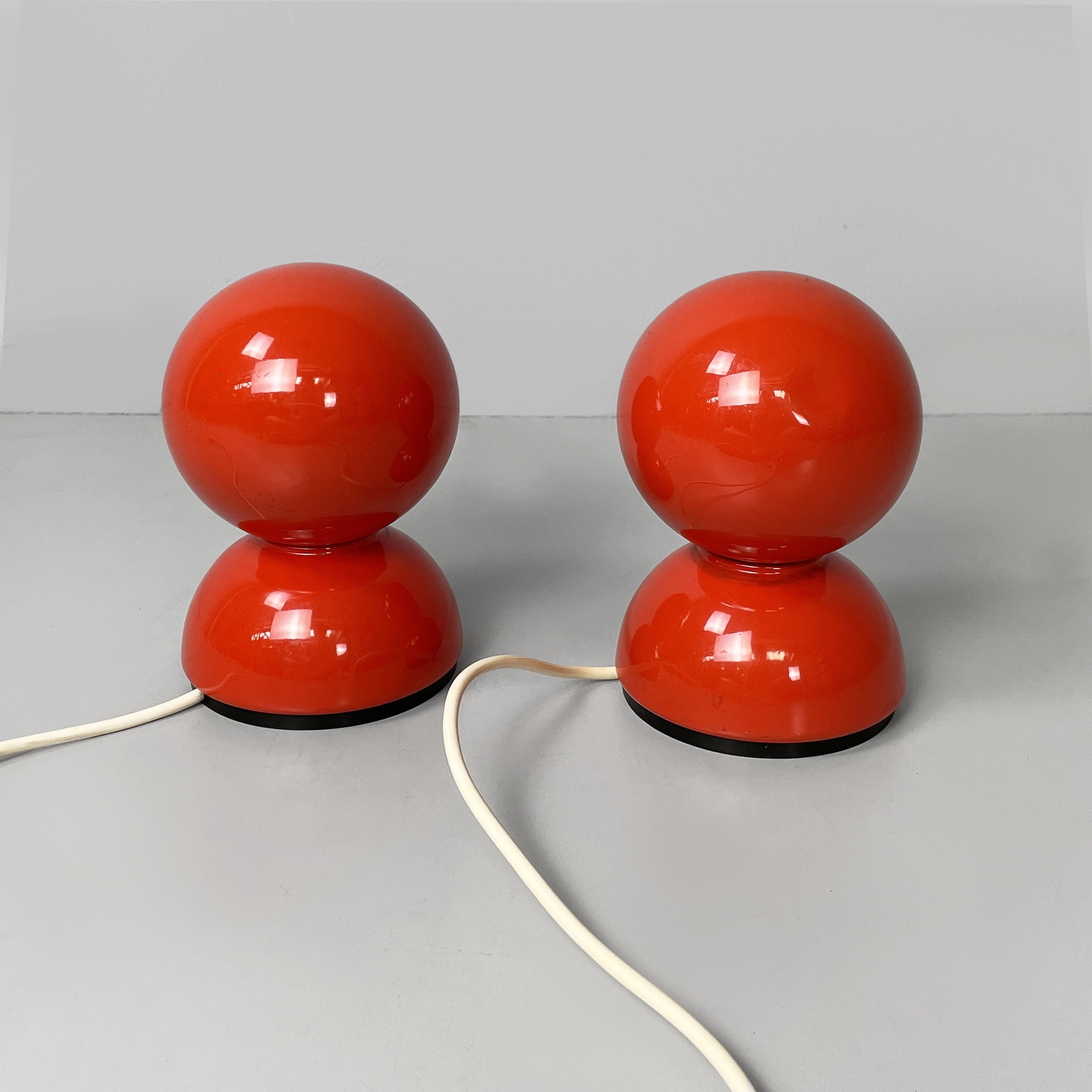 Coppia di lampade da tavolo modello Eclisse a base tonda. Il diffusore sferico è composto da una parte fissa in metallo rosso e una semisfera in metallo bianco, la quale può essere ruotato per nascondere la fonte luminosa. La base tonda è in metallo verniciato rosso. Utilizzabili come lampade da comodino. Possono essere montate a parete grazie ad un foro sotto la base ed essere usata come applique.