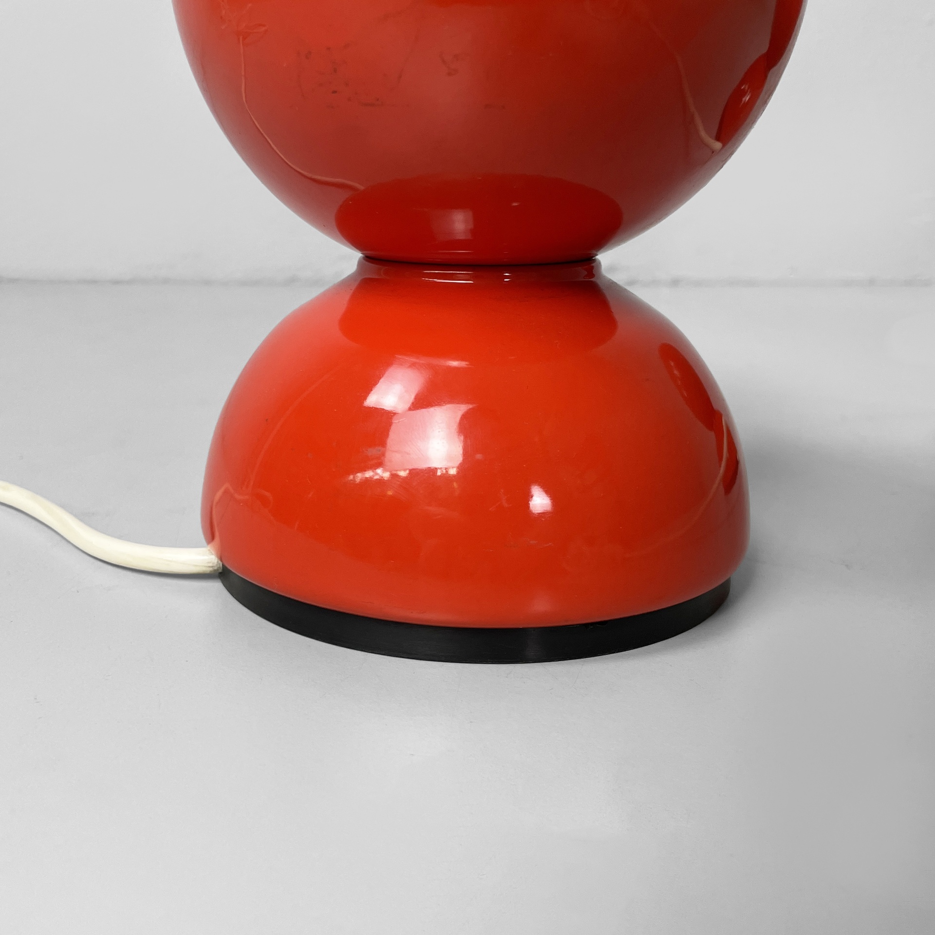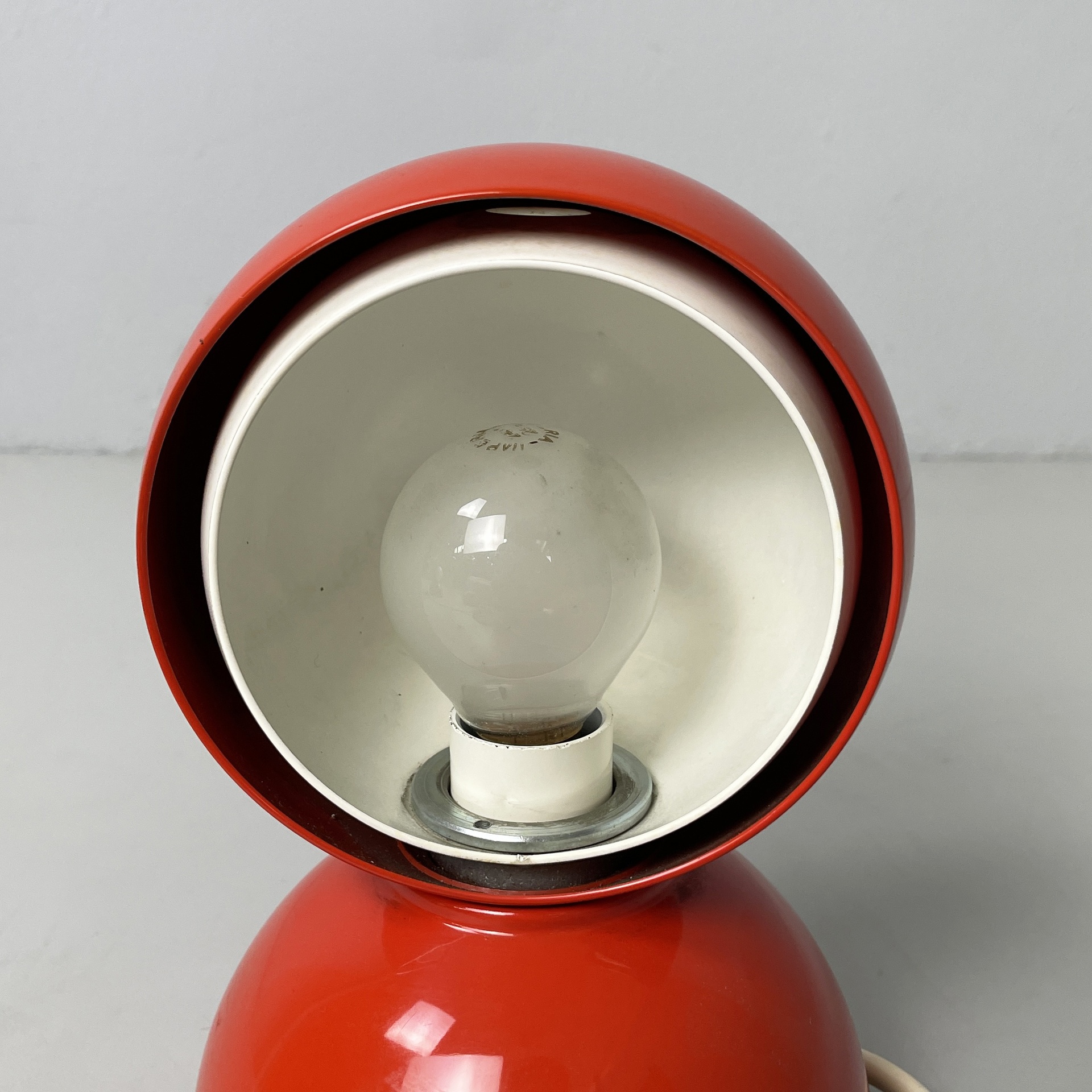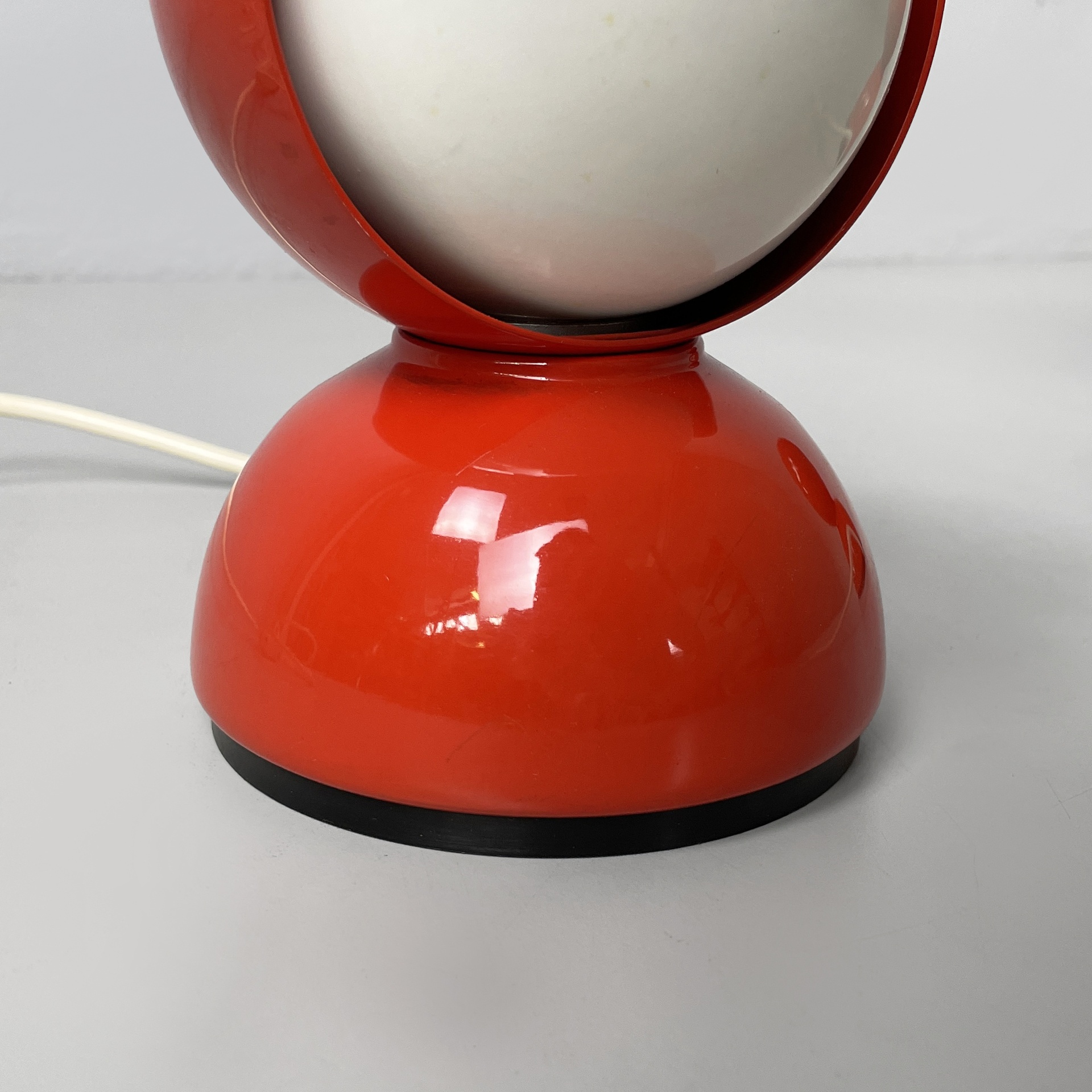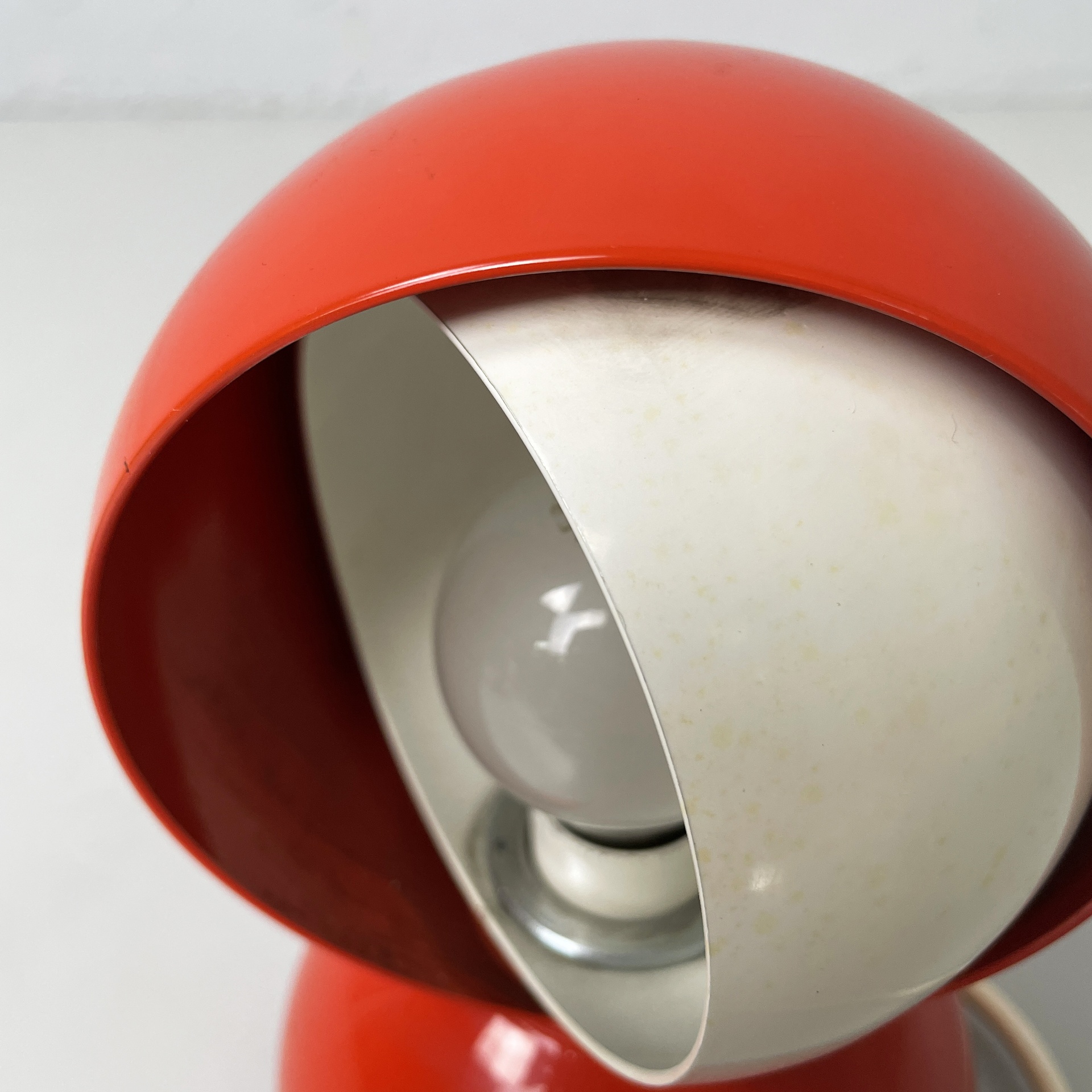 Coppia di lampade da tavolo modello Eclisse a base tonda. Il diffusore sferico è composto da una parte fissa in metallo rosso e una semisfera in metallo bianco, la quale può essere ruotato per nascondere la fonte luminosa. La base tonda è in metallo verniciato rosso. Utilizzabili come lampade da comodino. Possono essere montate a parete grazie ad un foro sotto la base ed essere usata come applique.