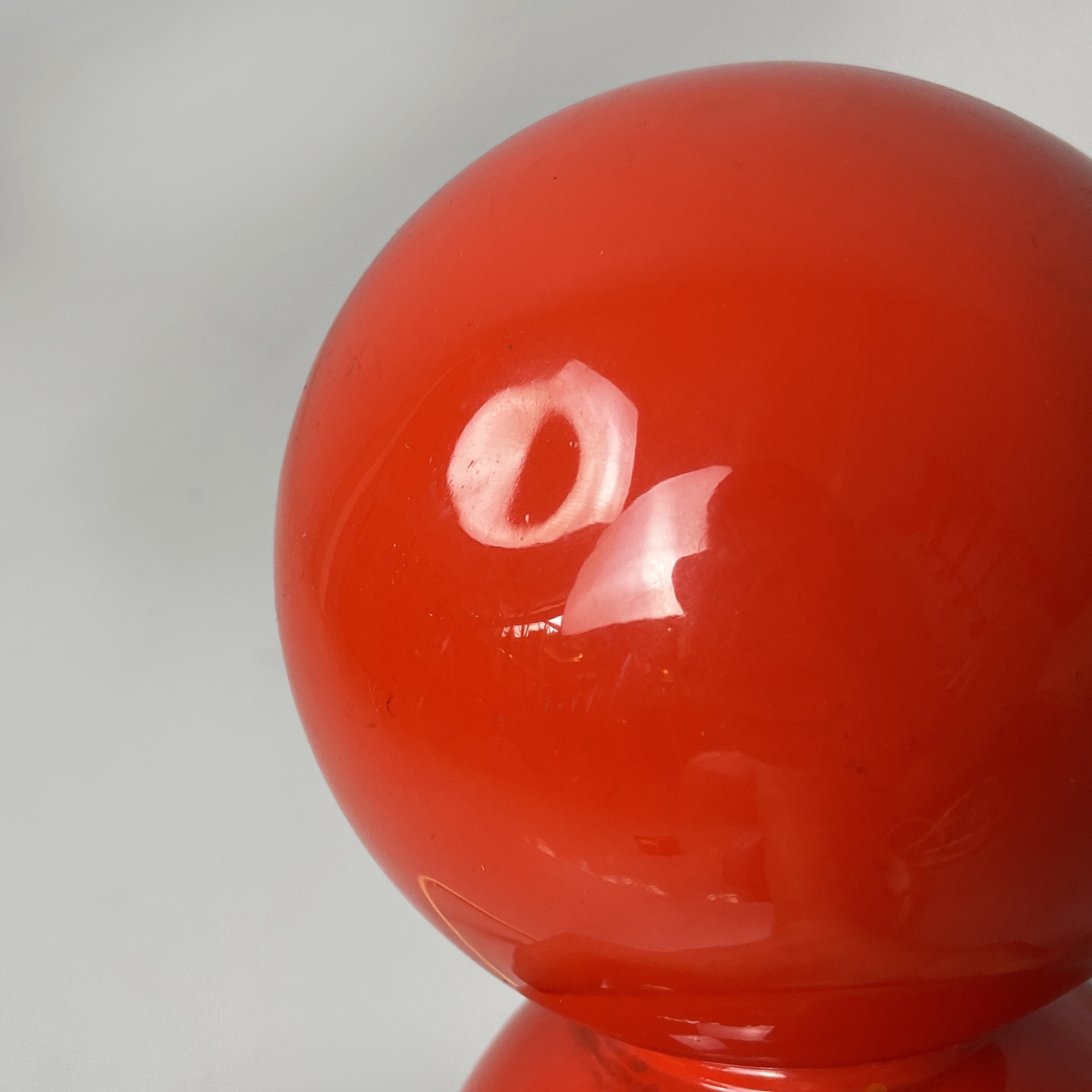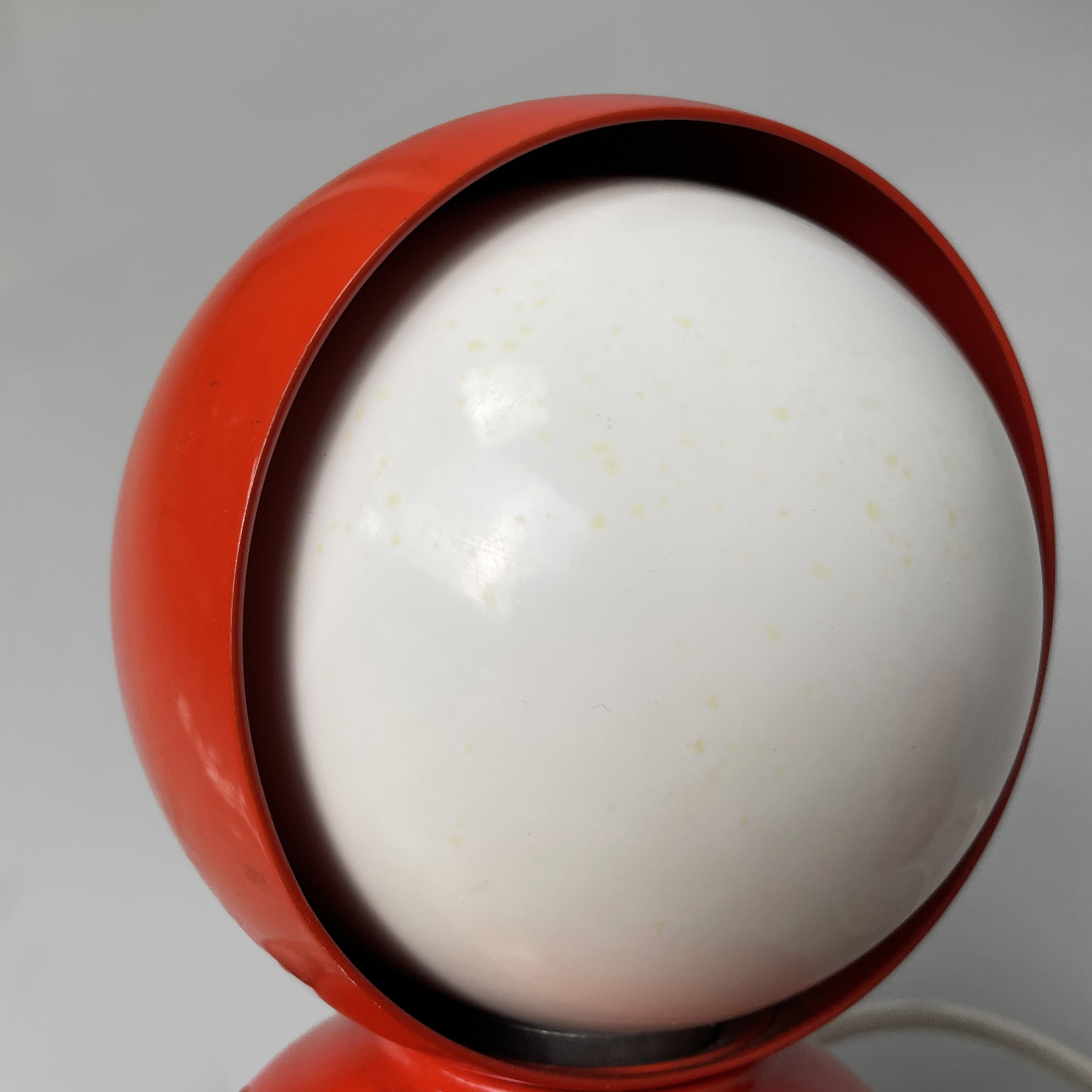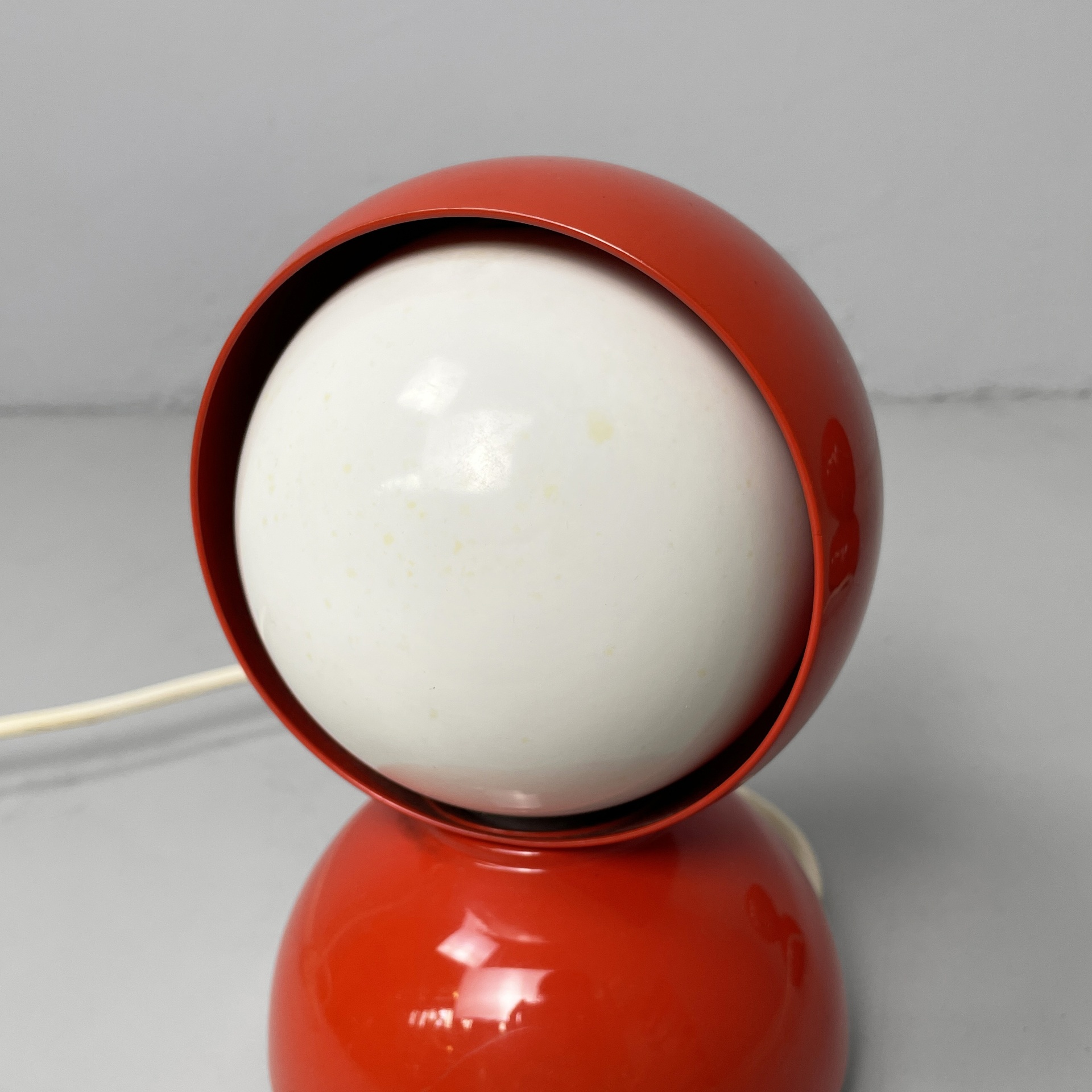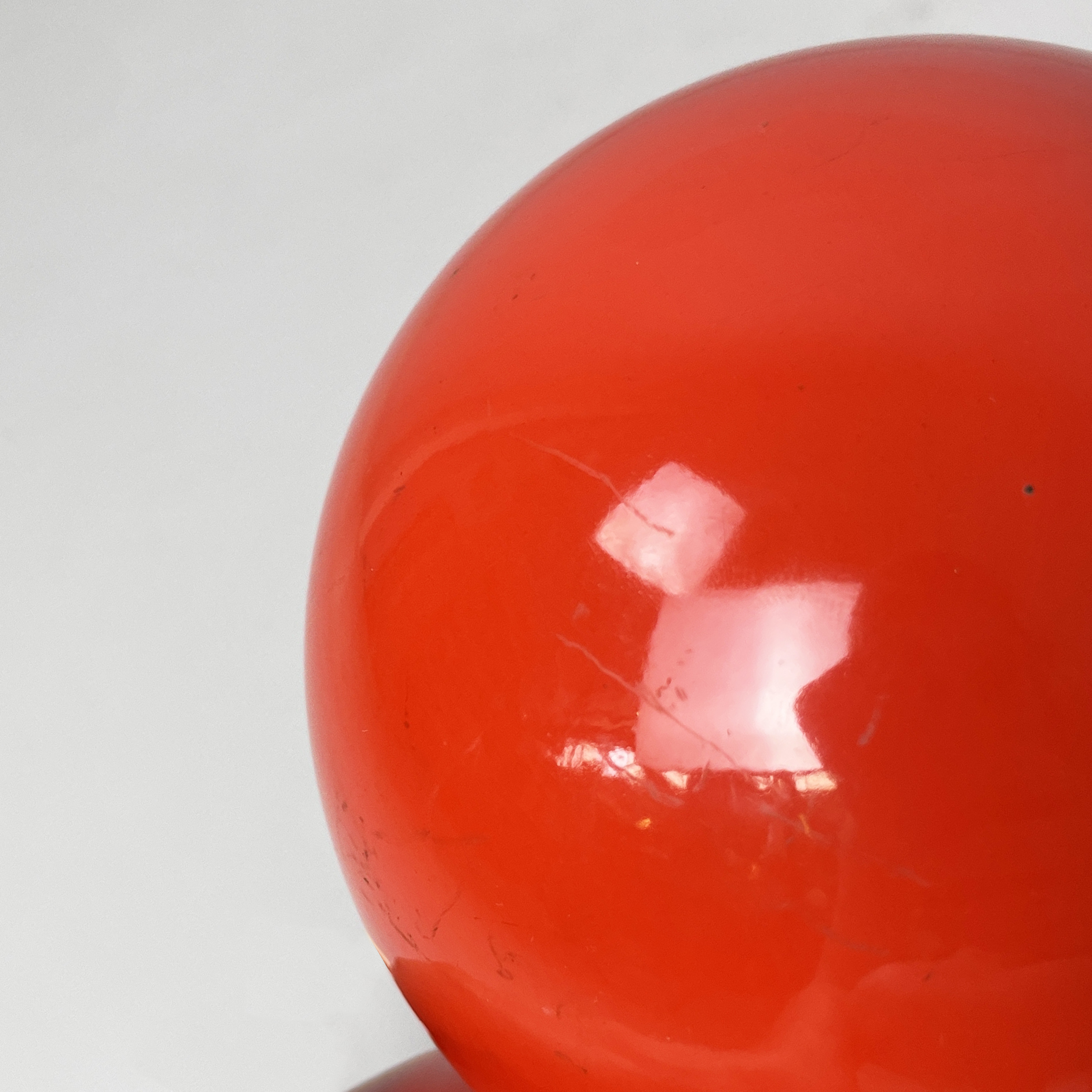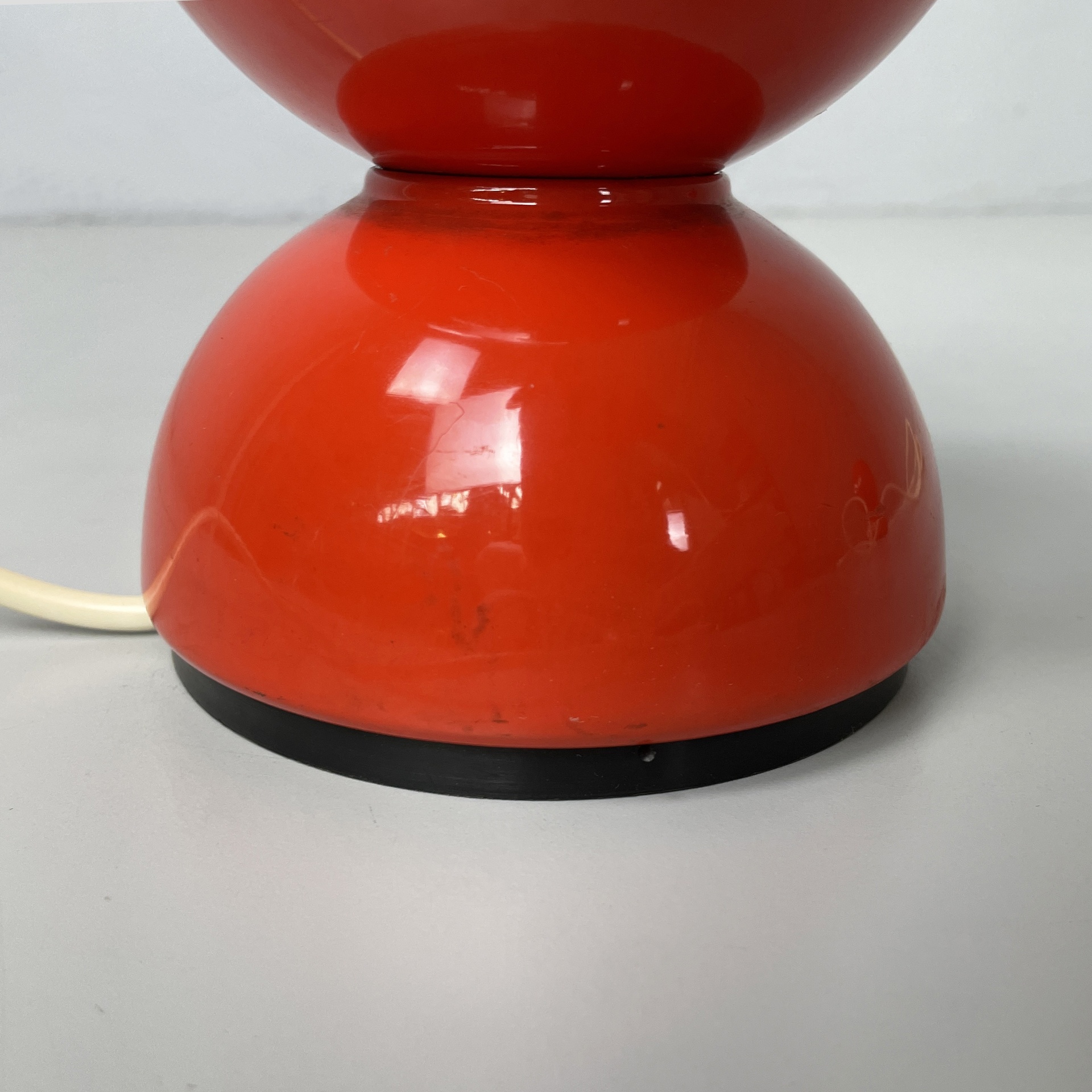 Coppia di lampade da tavolo modello Eclisse a base tonda. Il diffusore sferico è composto da una parte fissa in metallo rosso e una semisfera in metallo bianco, la quale può essere ruotato per nascondere la fonte luminosa. La base tonda è in metallo verniciato rosso. Utilizzabili come lampade da comodino. Possono essere montate a parete grazie ad un foro sotto la base ed essere usata come applique.