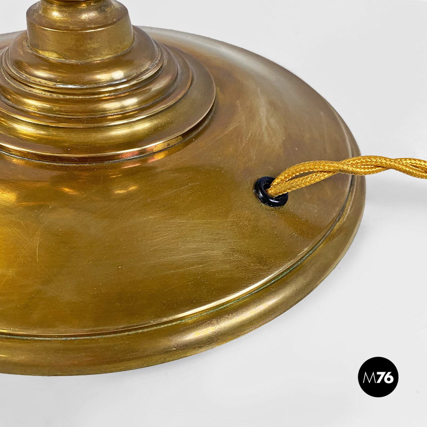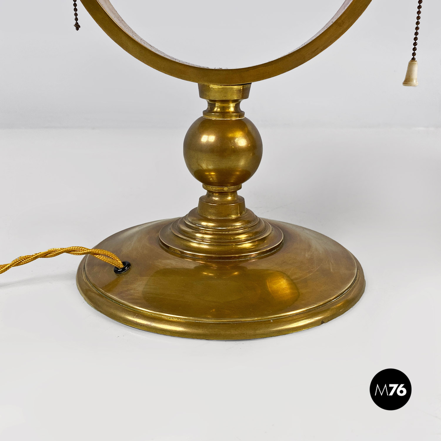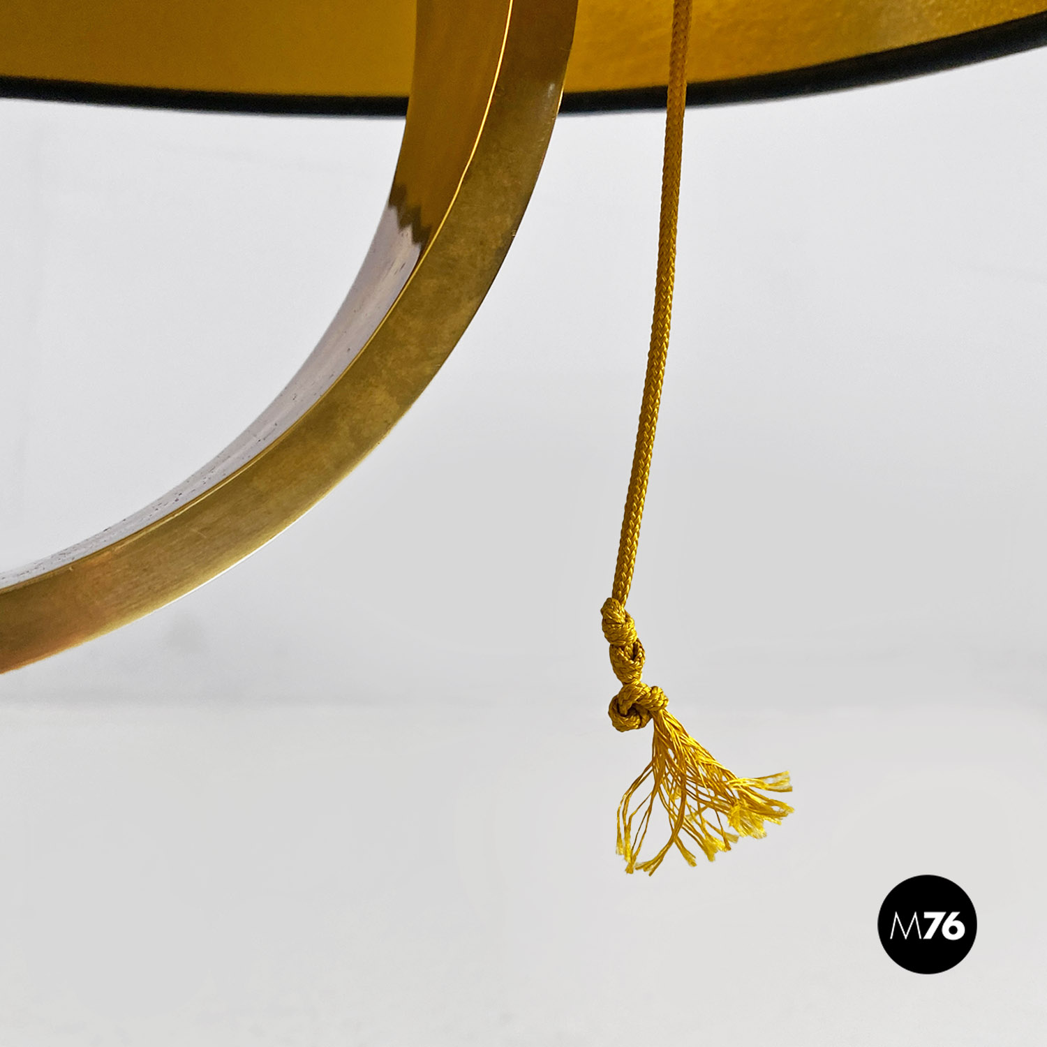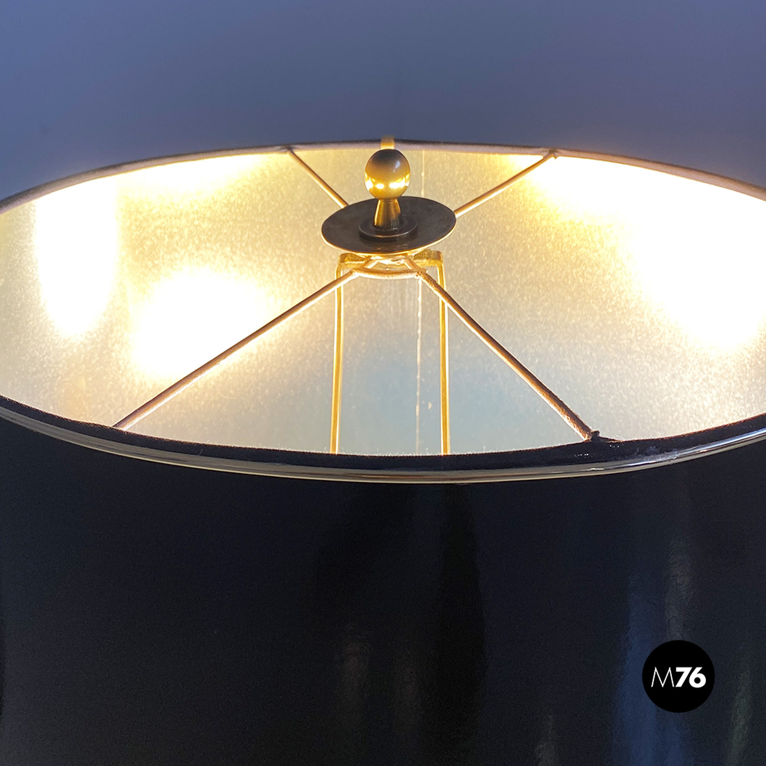 Coppia di due abat-jour o lampade da tavolo con struttura in ottone. Il paralume di forma ellittica è in plastica nera lucida all’esterno e dorato internamente, con bordino dorato a decorare le estremità. Accensione con catenine a scatto, separate per ognuno dei due porta lampadina.