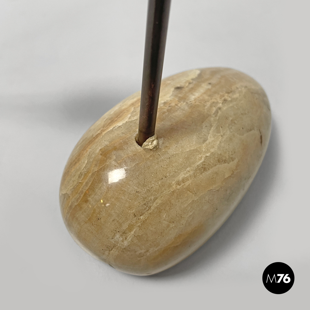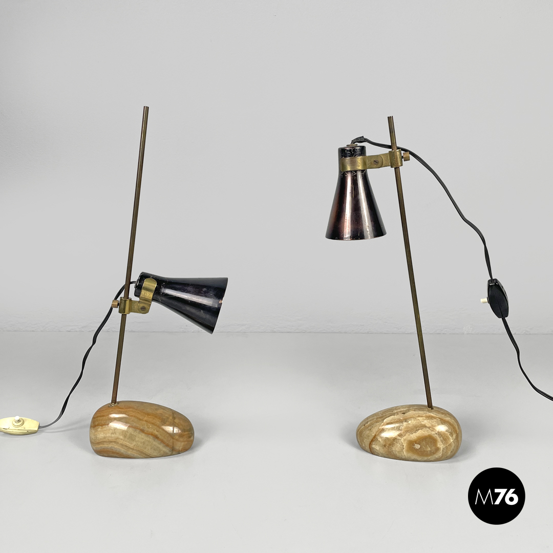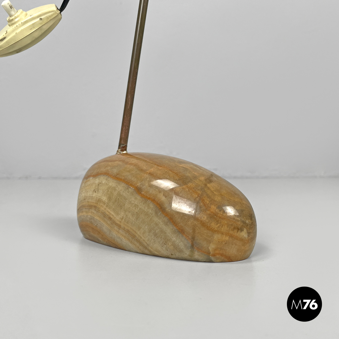 Coppia di lampade da tavolo modello LTA1 Sasso. La base è costituita da un sasso in onice tondeggiante allungato con sfumature e striature sui toni del beige e del marrone. Lo stelo è in tondino di ottone ed il paralume, di cui si può modificare l’altezza e la direzione, è in ottone brunito con attacco della lampadina E14.