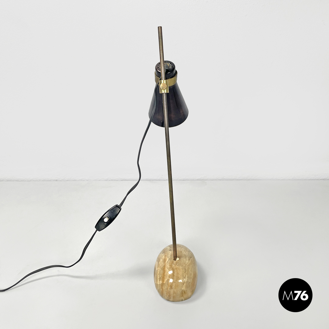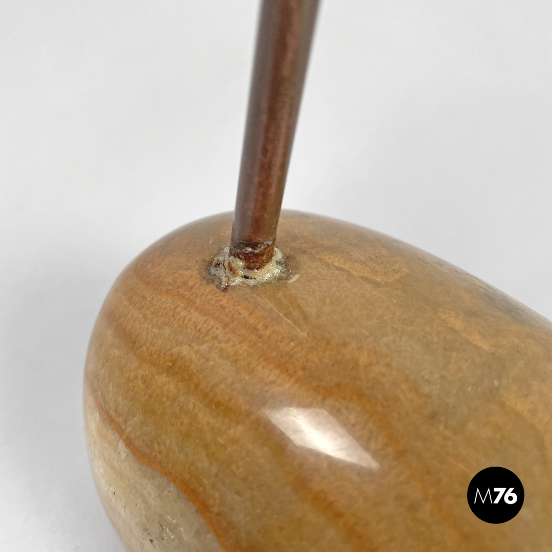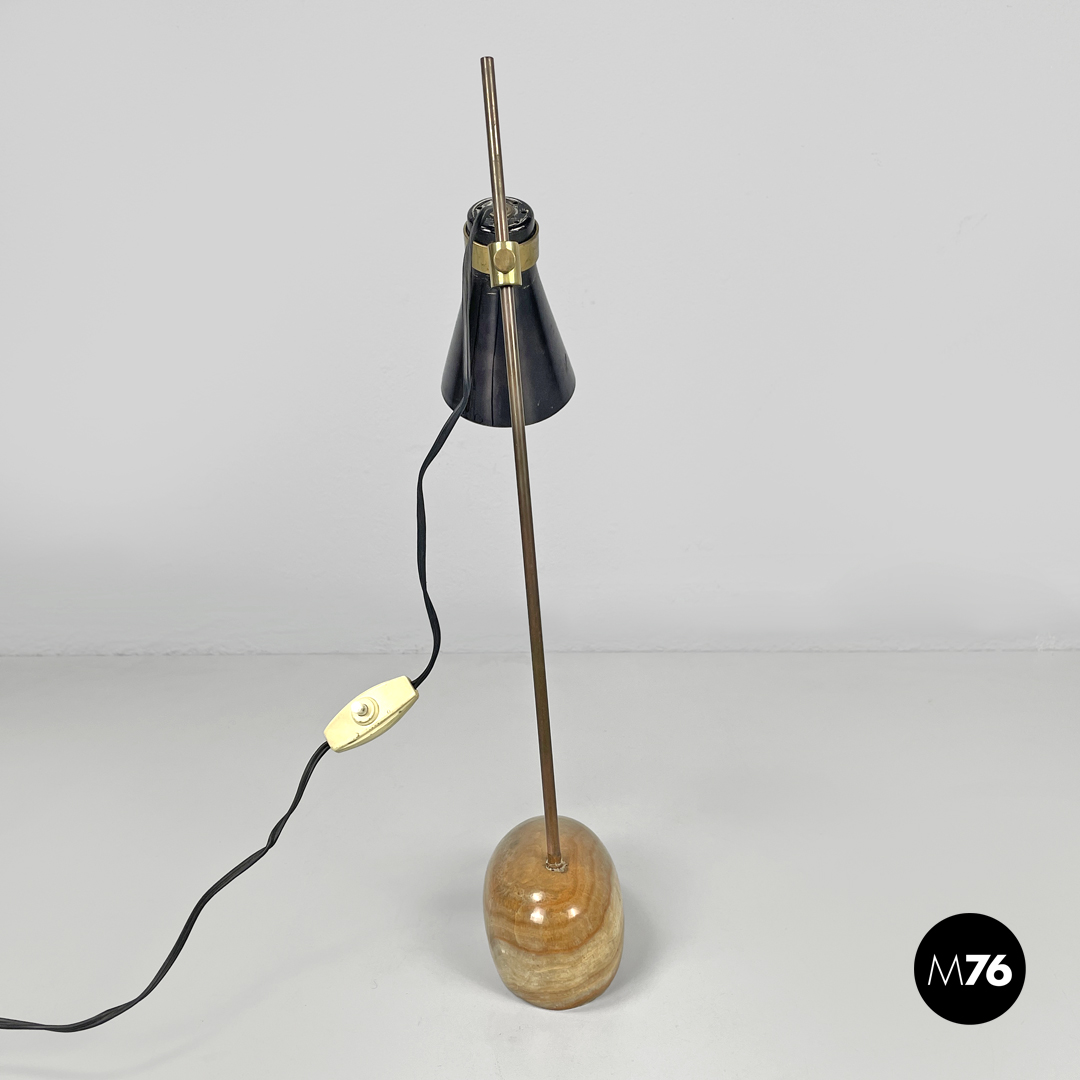 Coppia di lampade da tavolo modello LTA1 Sasso. La base è costituita da un sasso in onice tondeggiante allungato con sfumature e striature sui toni del beige e del marrone. Lo stelo è in tondino di ottone ed il paralume, di cui si può modificare l’altezza e la direzione, è in ottone brunito con attacco della lampadina E14.