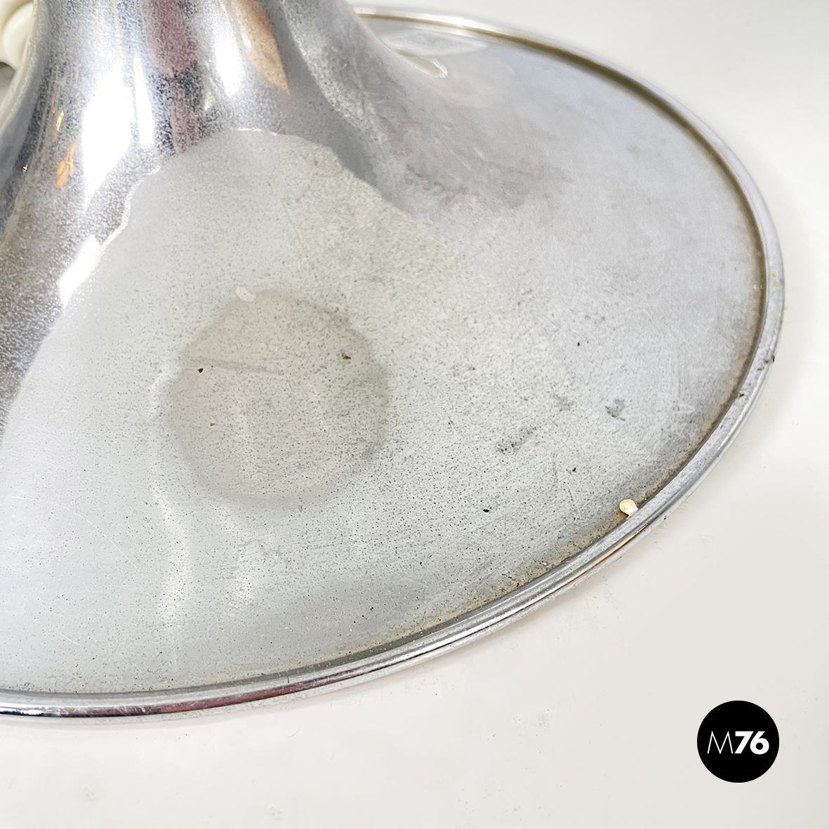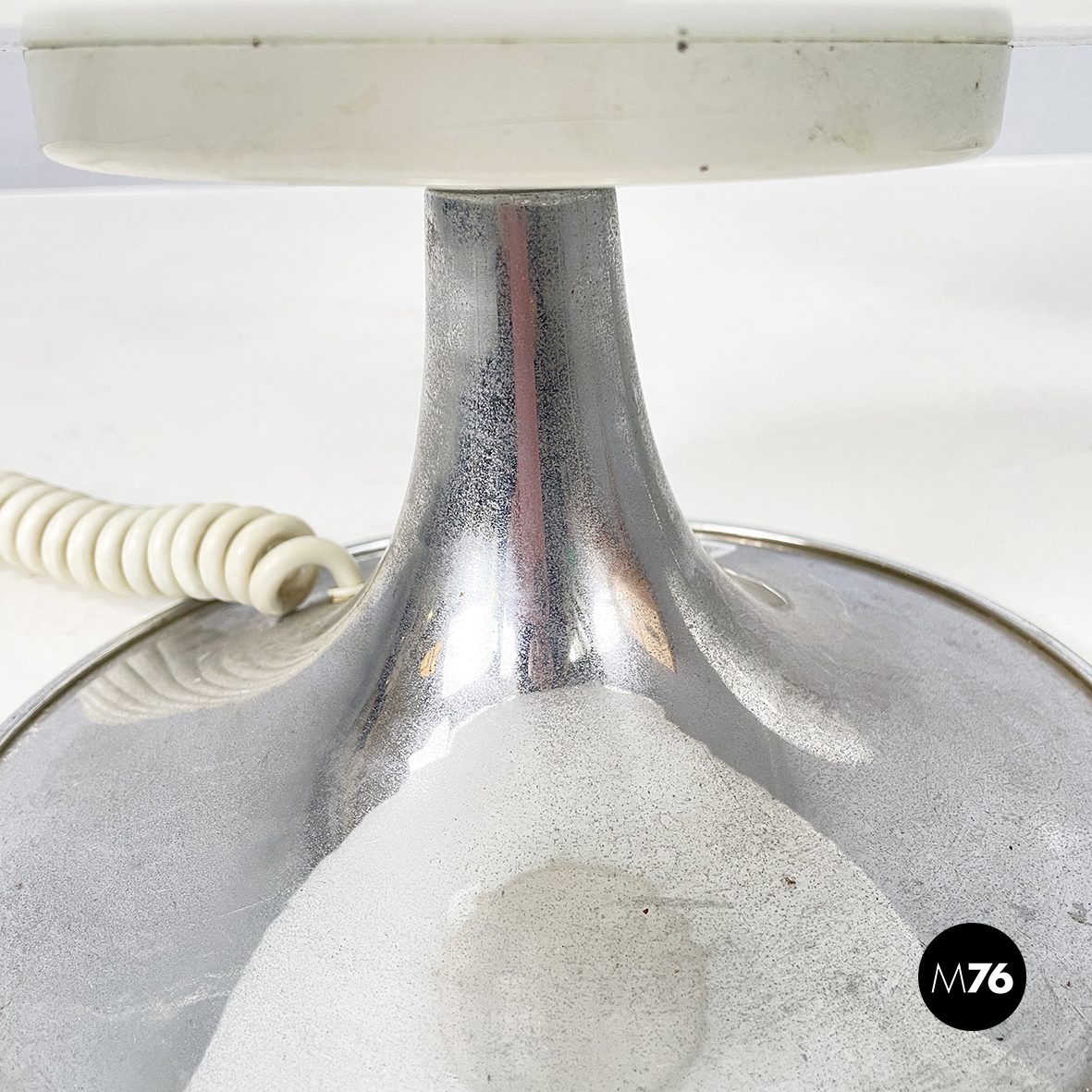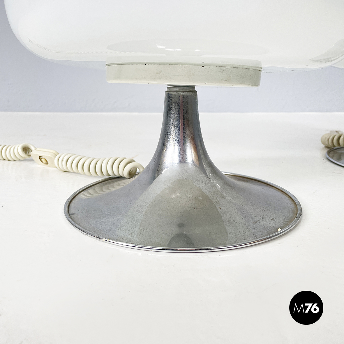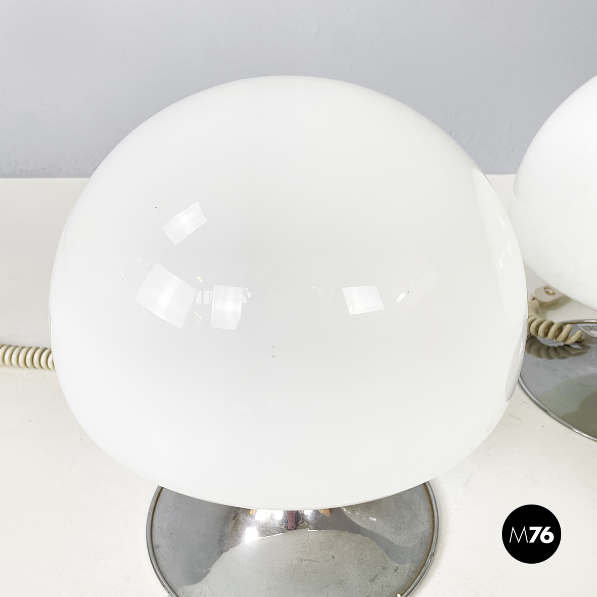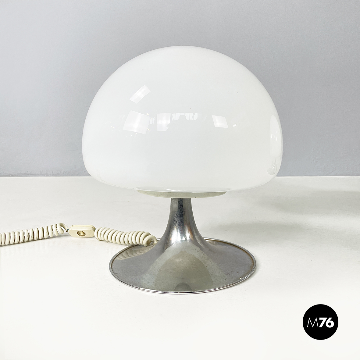 Coppia di lampade da tavolo modello Mushroom con diffusore a forma di fungo in vetro opalino. La base tonda è in acciaio cromato. Queste lampade sono perfette come lampada da comodino o abajur.