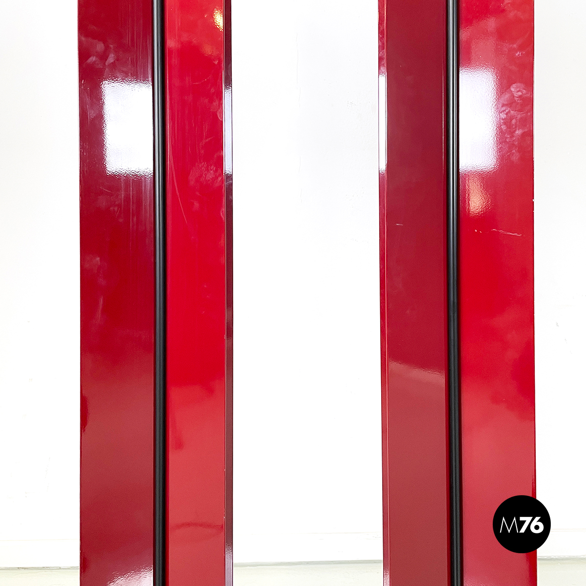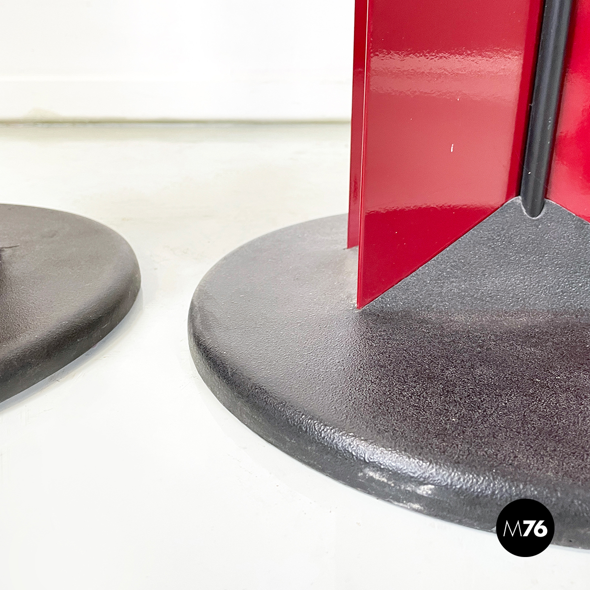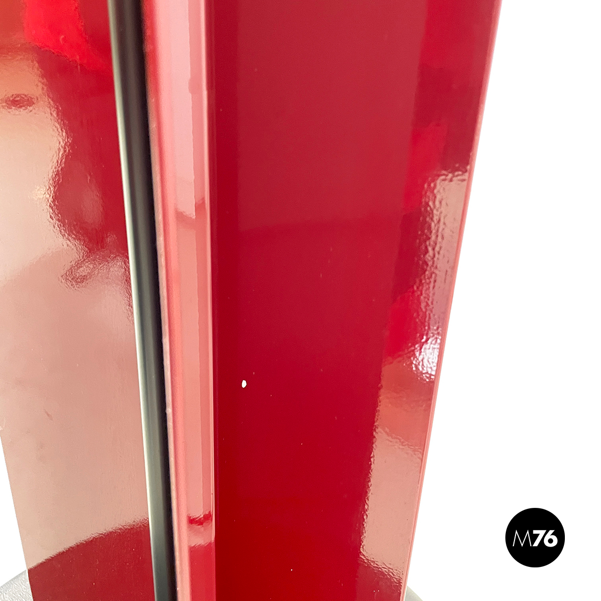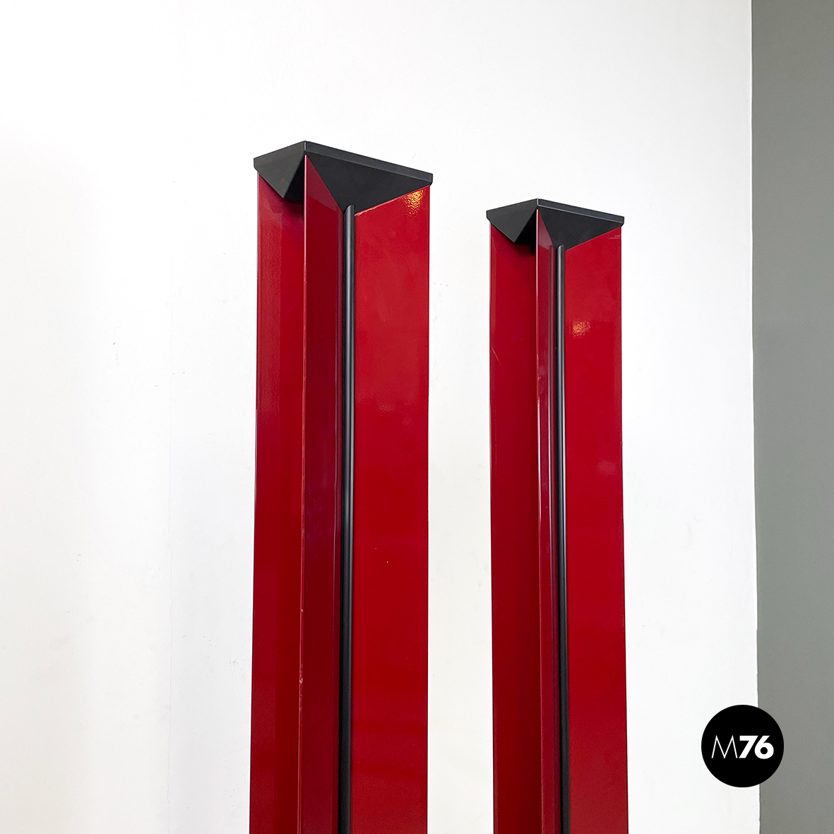 Coppia di lampade da terra con struttura composta da lastre di metallo verniciato rosso lucido, poste a X. Al centro dell struttura è presente una striscia di plastica nero. Nella parte alta è presente il diffusore triangolare. La base tonda con copertura in gomma nera.