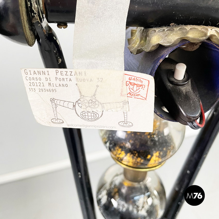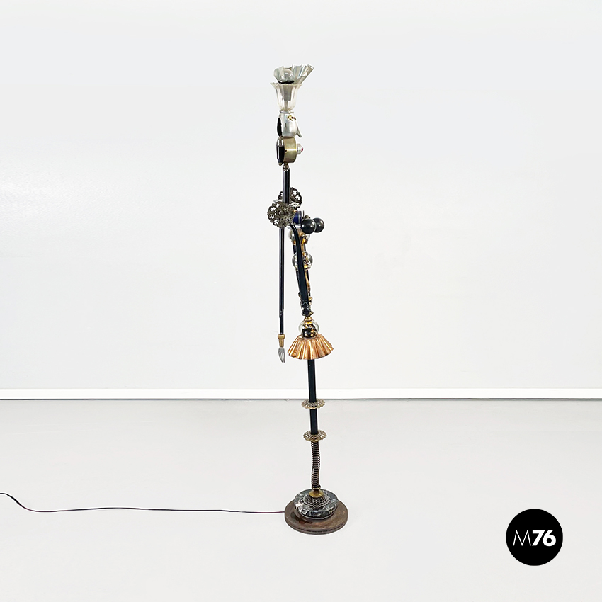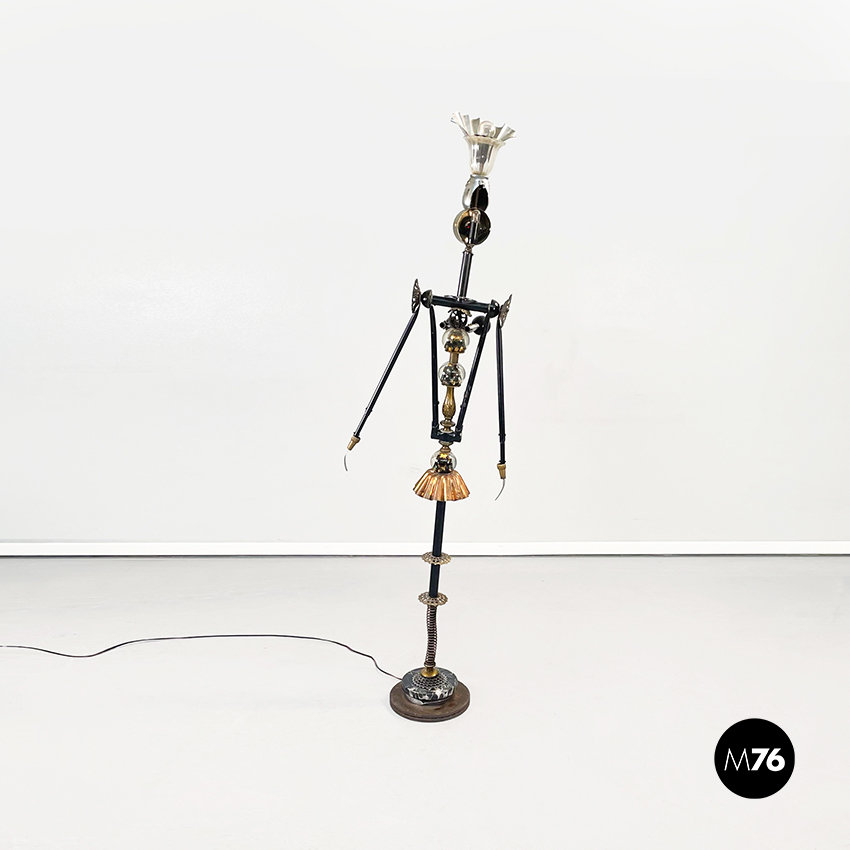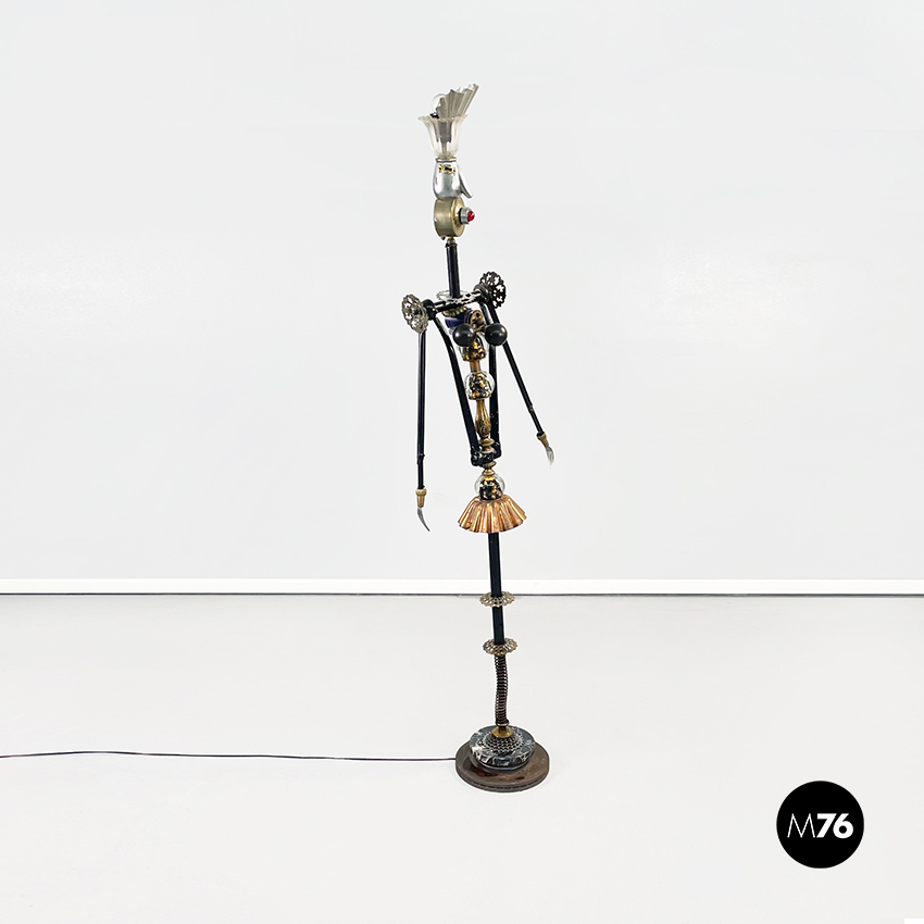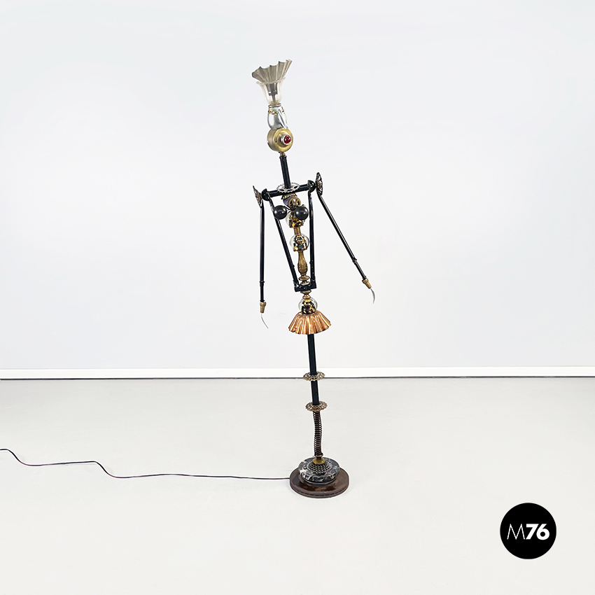 Coppia di sculture e lampade da terra di forma umanoide in metallo, ottone, marmo scuro e vetro. Queste lampade presentano due luci, di cui una rossa, entrambe poste all’altezza della testa. Il corpo centrale è composto da una serie di tubolari in metallo verniciato nero, ingranaggi dorati e sfere in vetro trasparente, nero e giallo. Le braccia mobili terminano con una mano composta da una forchetta. La base tonda è in marmo e metallo.