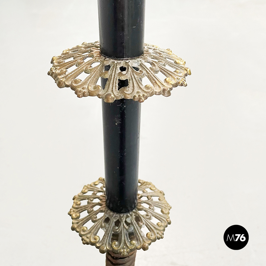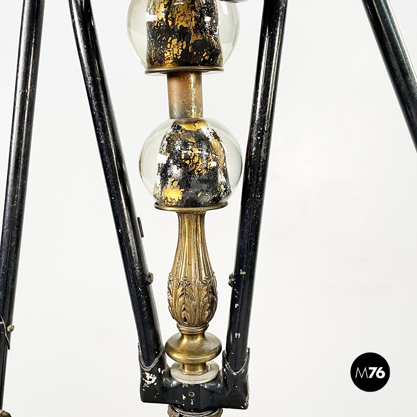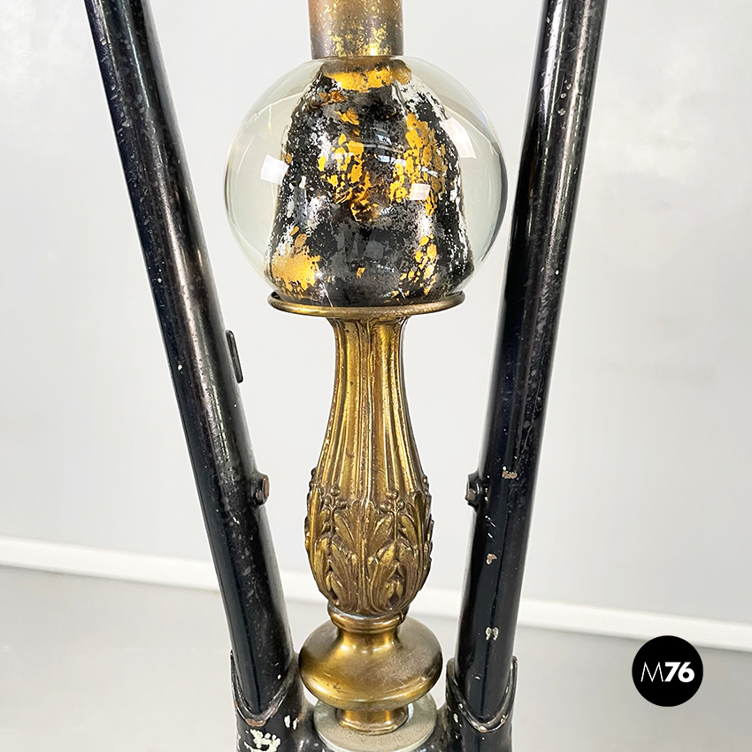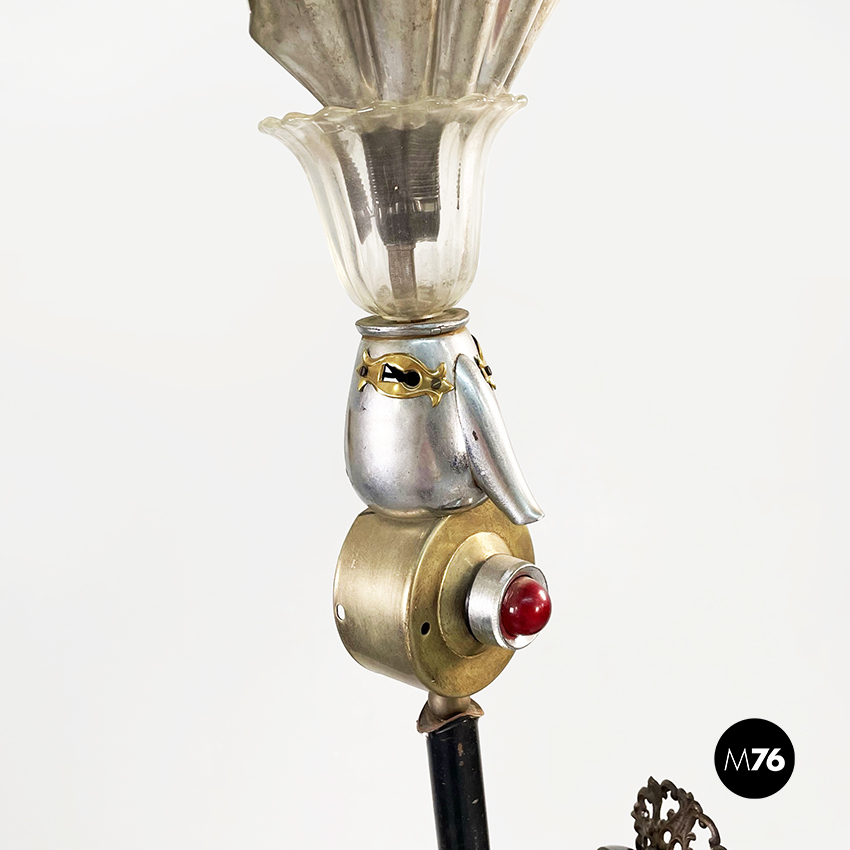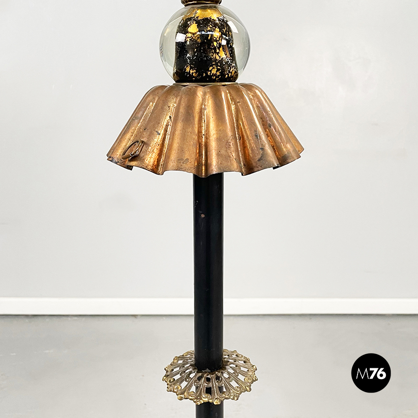 Coppia di sculture e lampade da terra di forma umanoide in metallo, ottone, marmo scuro e vetro. Queste lampade presentano due luci, di cui una rossa, entrambe poste all’altezza della testa. Il corpo centrale è composto da una serie di tubolari in metallo verniciato nero, ingranaggi dorati e sfere in vetro trasparente, nero e giallo. Le braccia mobili terminano con una mano composta da una forchetta. La base tonda è in marmo e metallo.