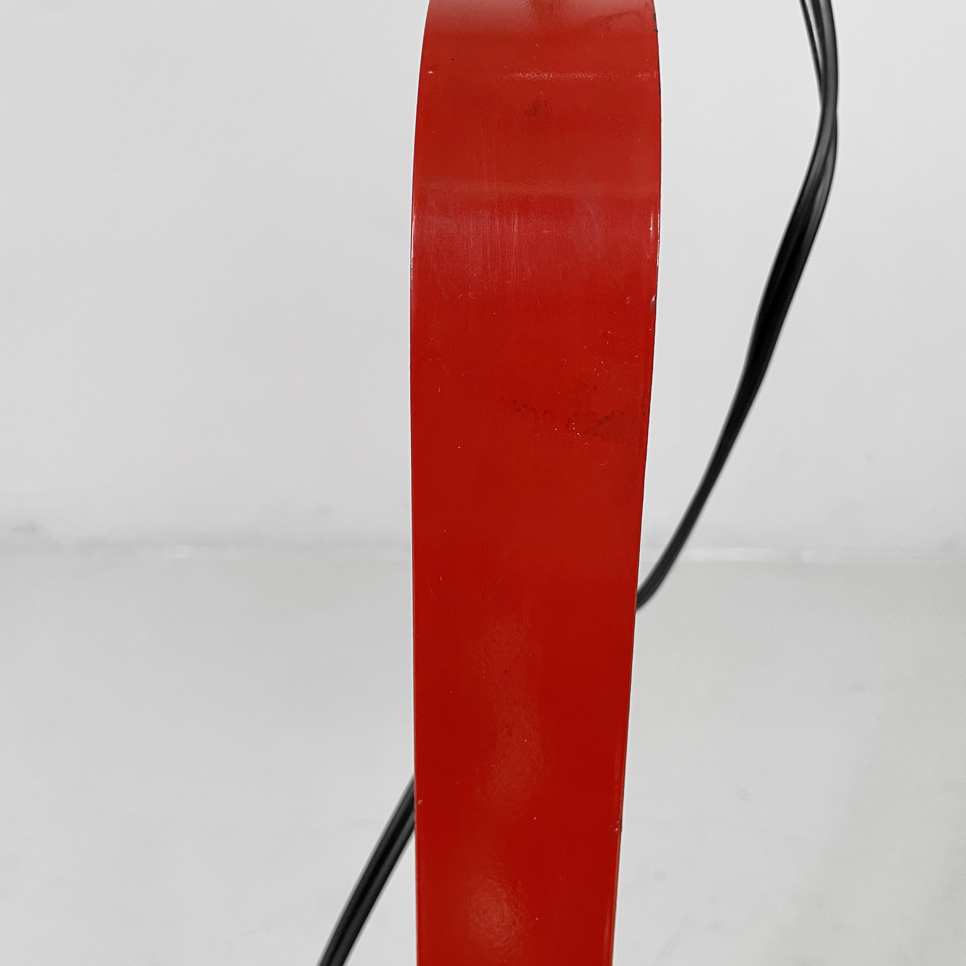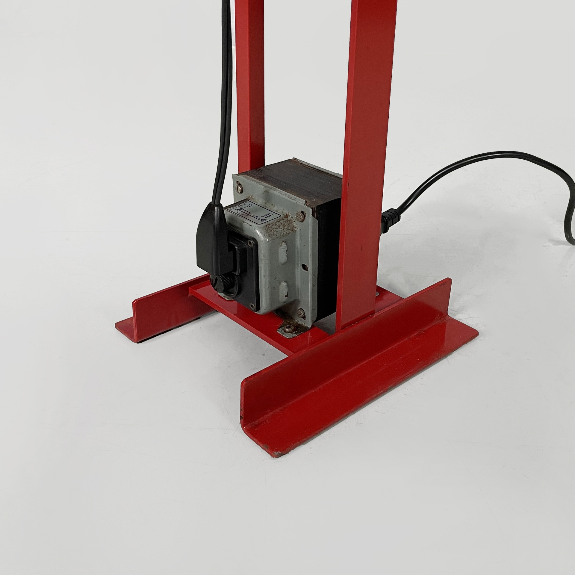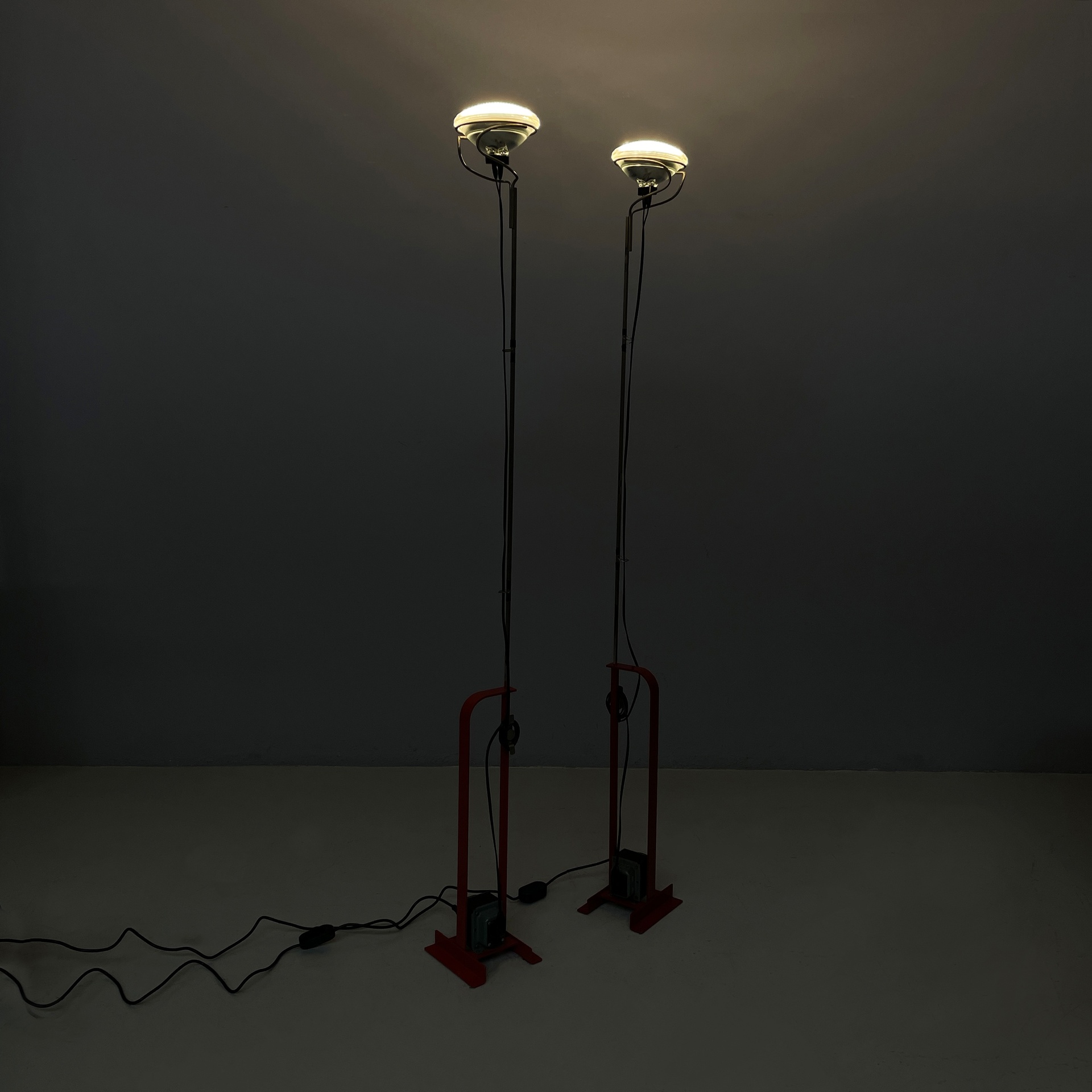 Coppia di lampade da terra modello Toio con diffusore a luce indiretta. La struttura è formata da una base in metallo verniciato rosso e uno stelo esagonale in metallo, che supporta il cavo elettrico e può essere regolato in altezza.