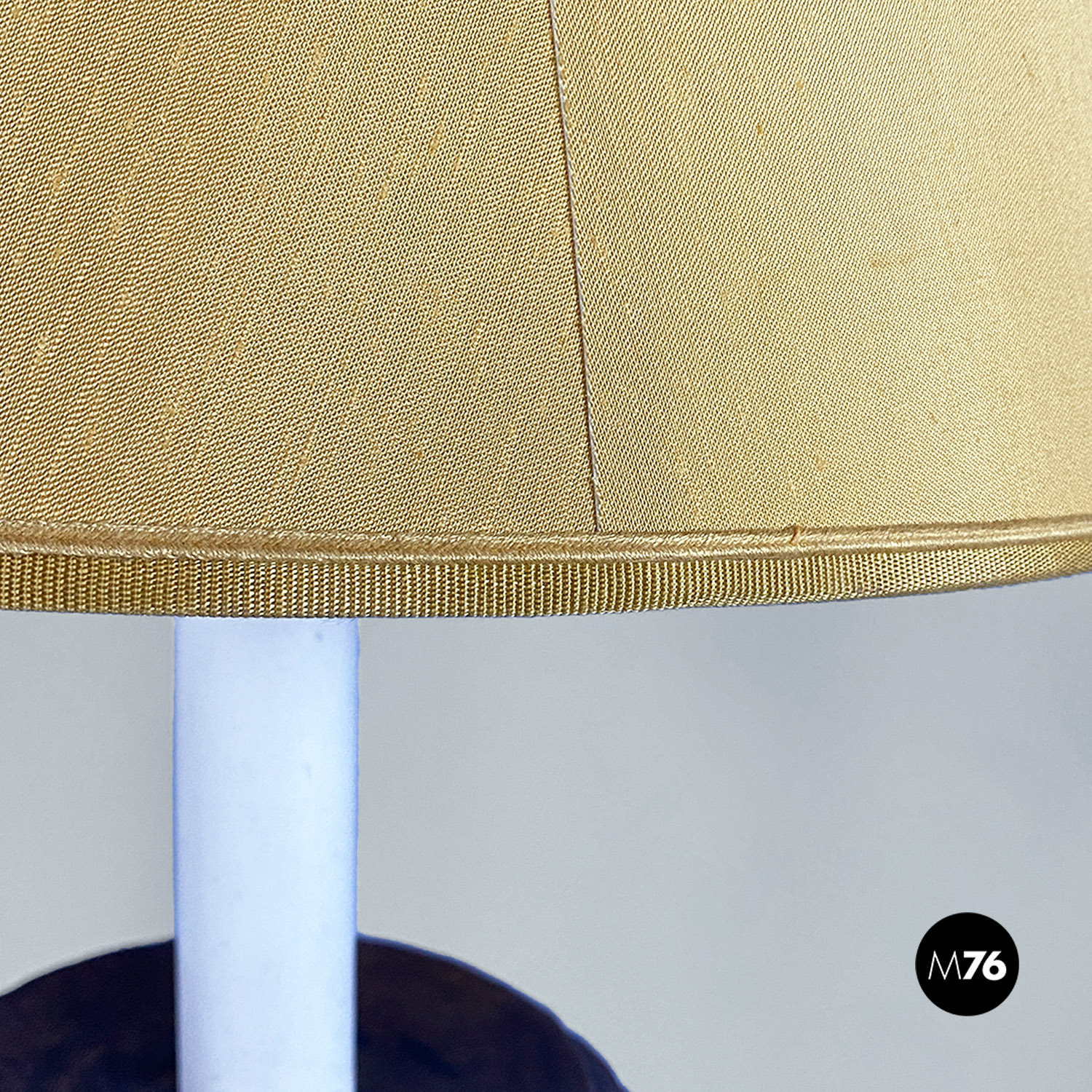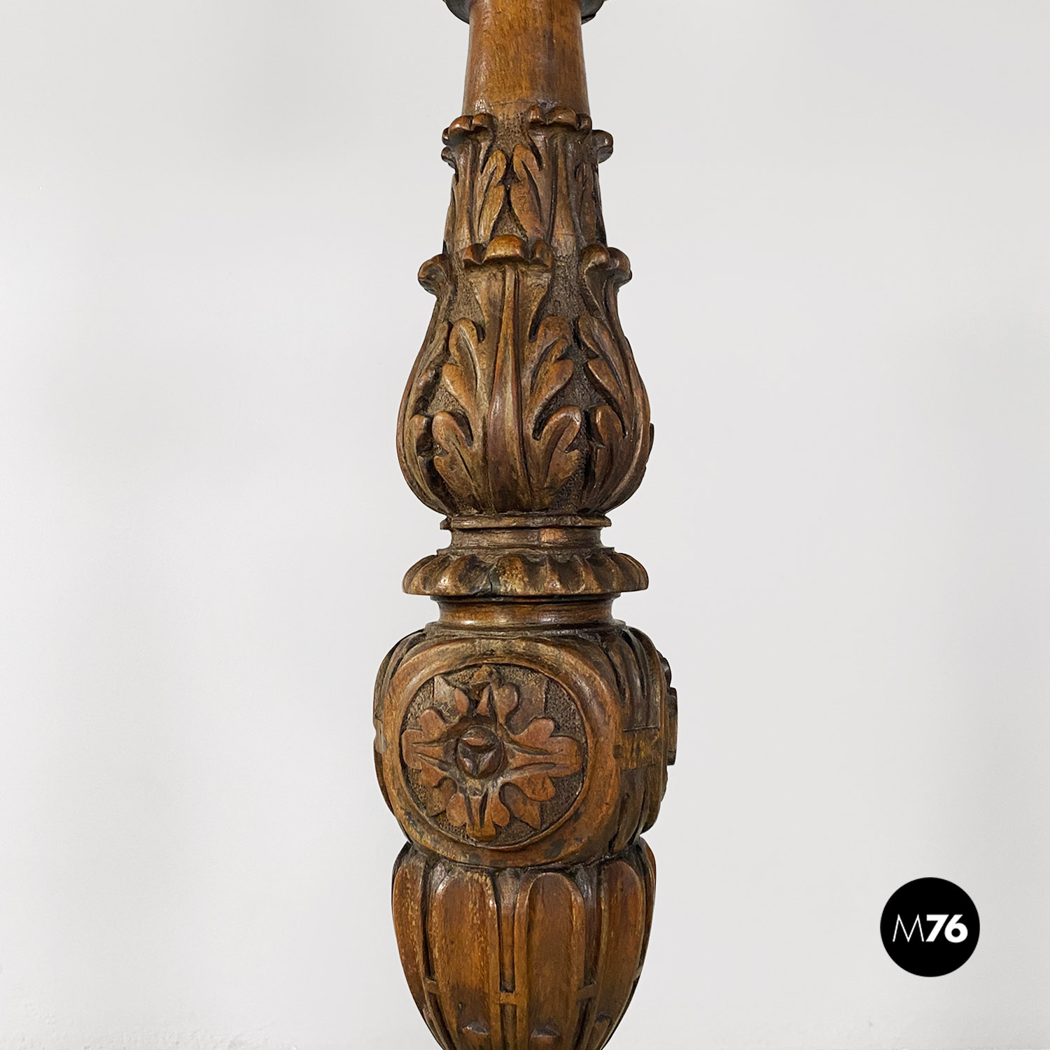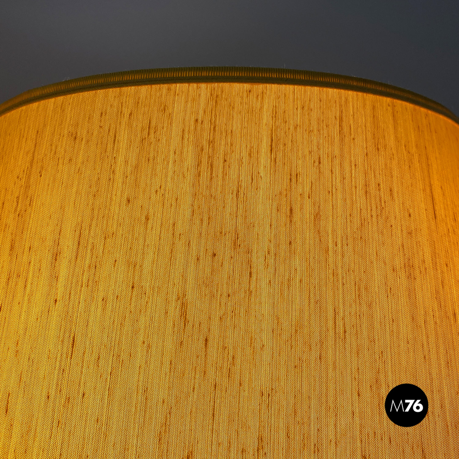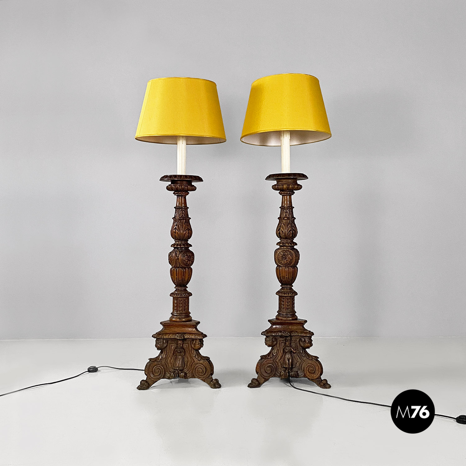 Coppia di lampade da terra o torciere con struttura in legno scuro in patina, finemente intagliato, e paralume in tessuto giallo di produzione moderna.