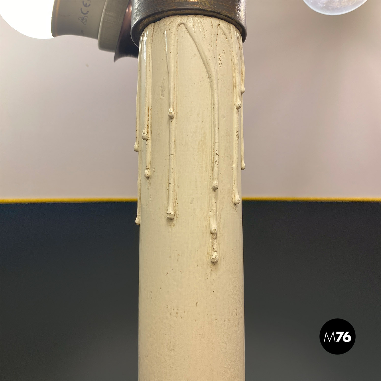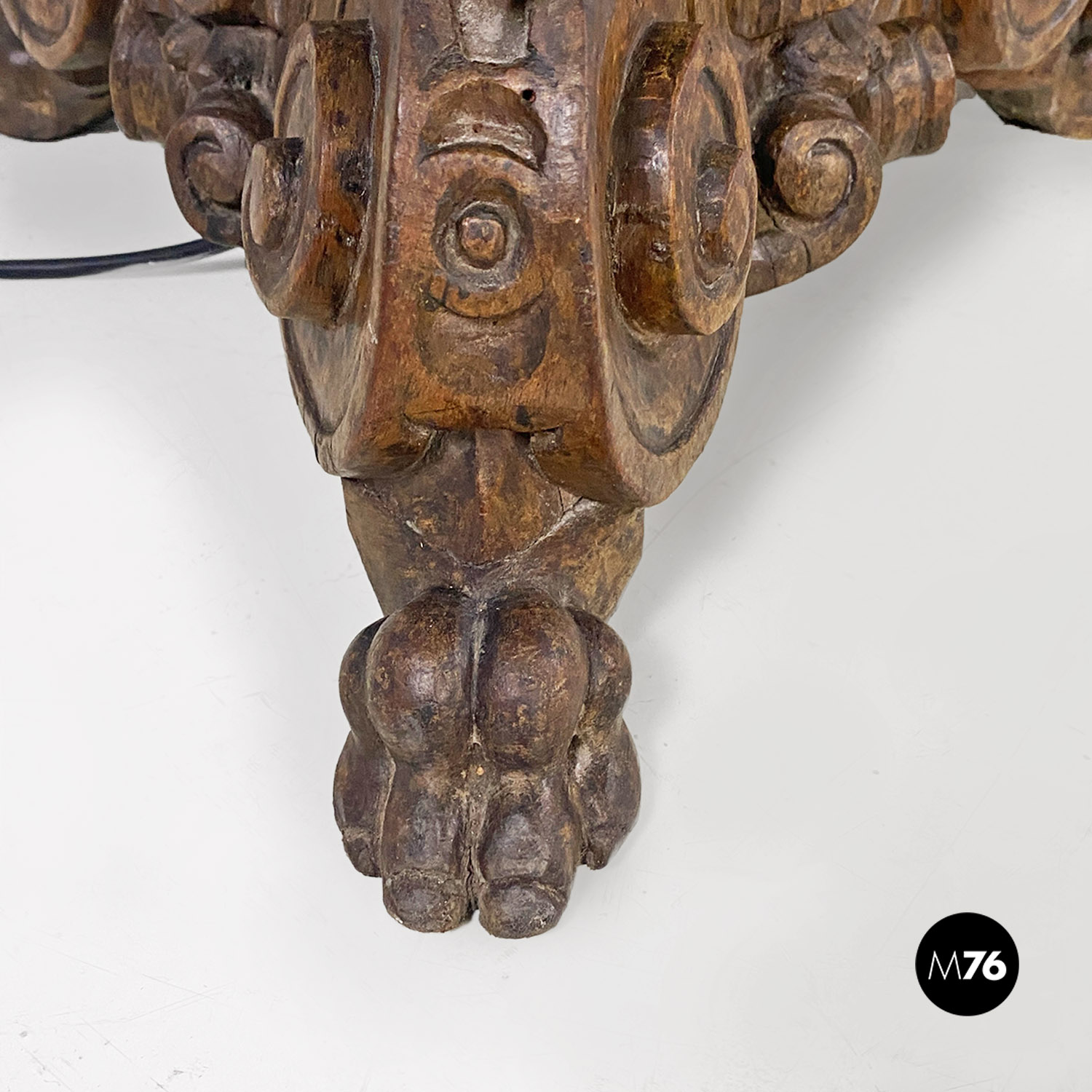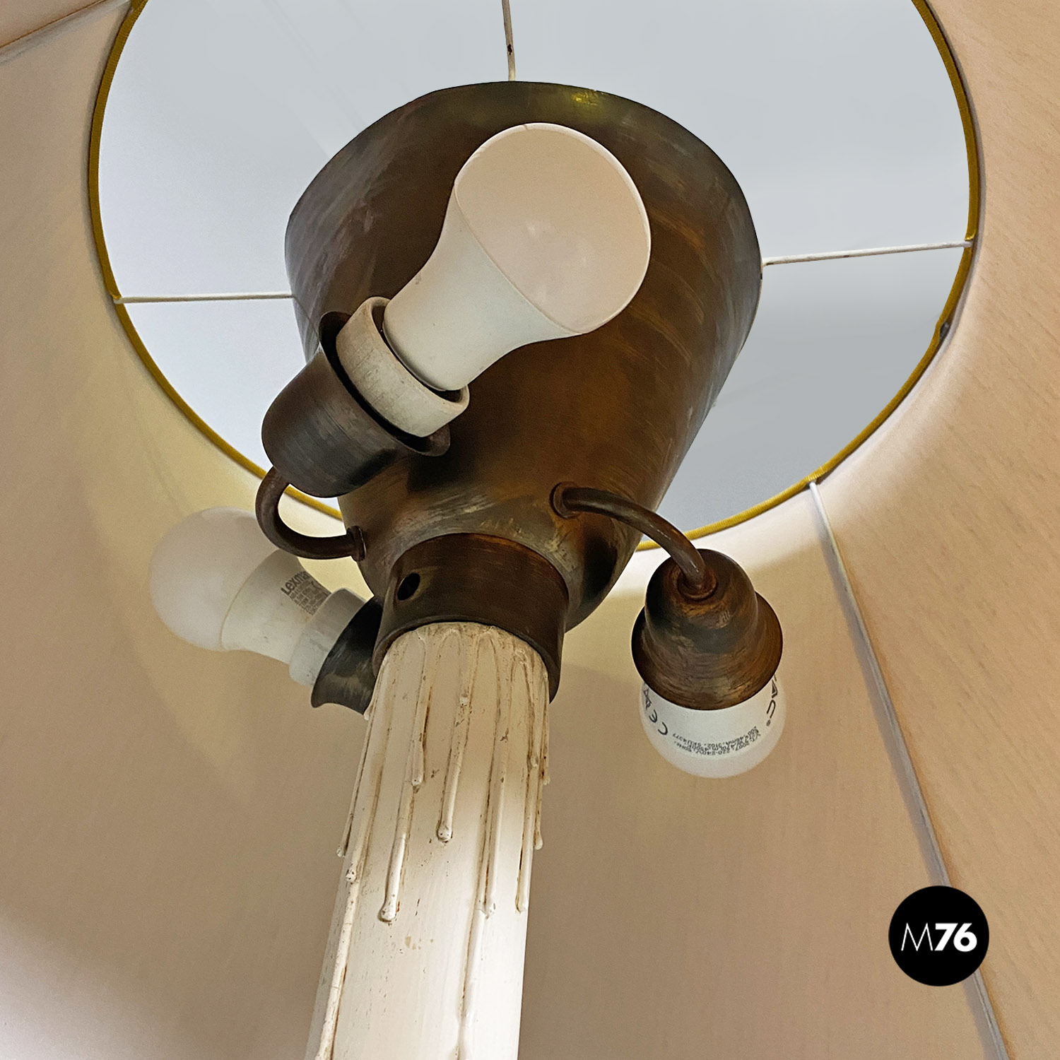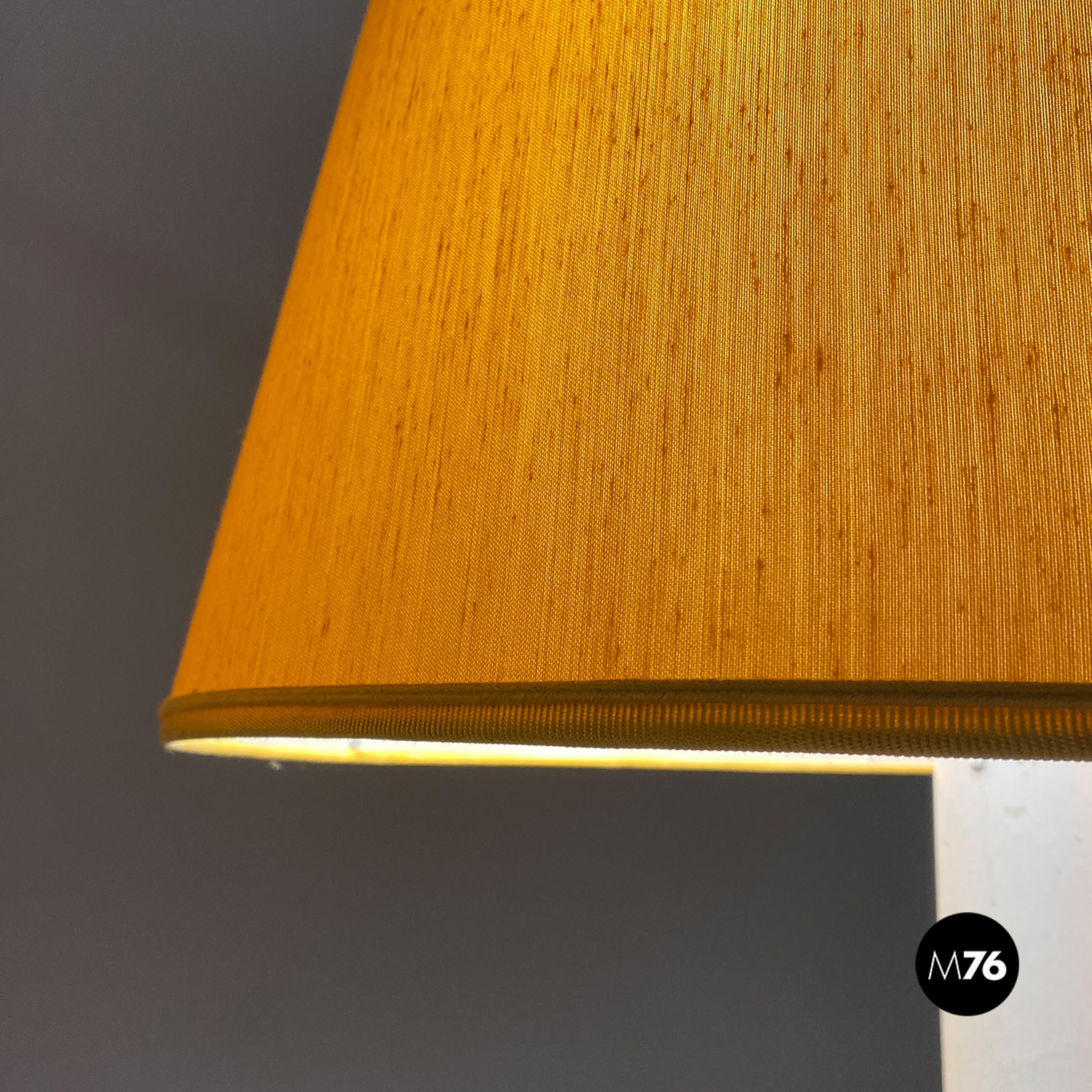 Coppia di lampade da terra o torciere con struttura in legno scuro in patina, finemente intagliato, e paralume in tessuto giallo di produzione moderna.