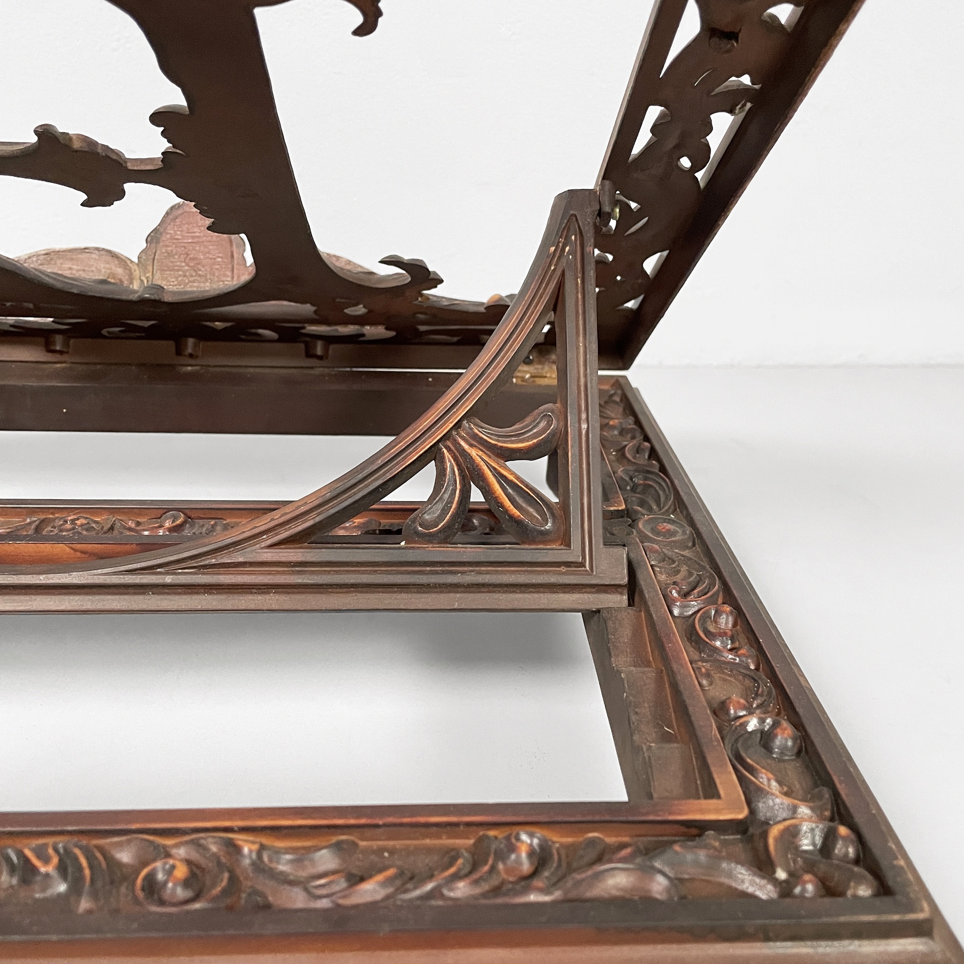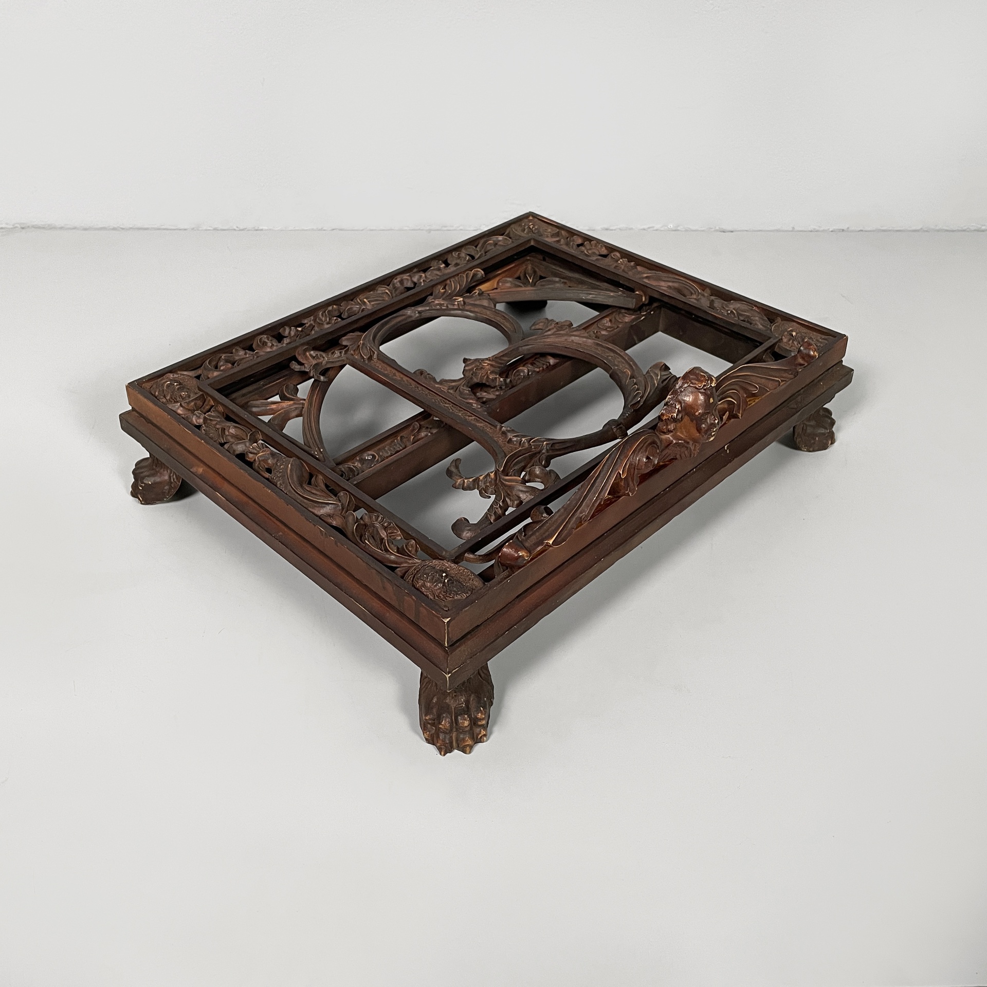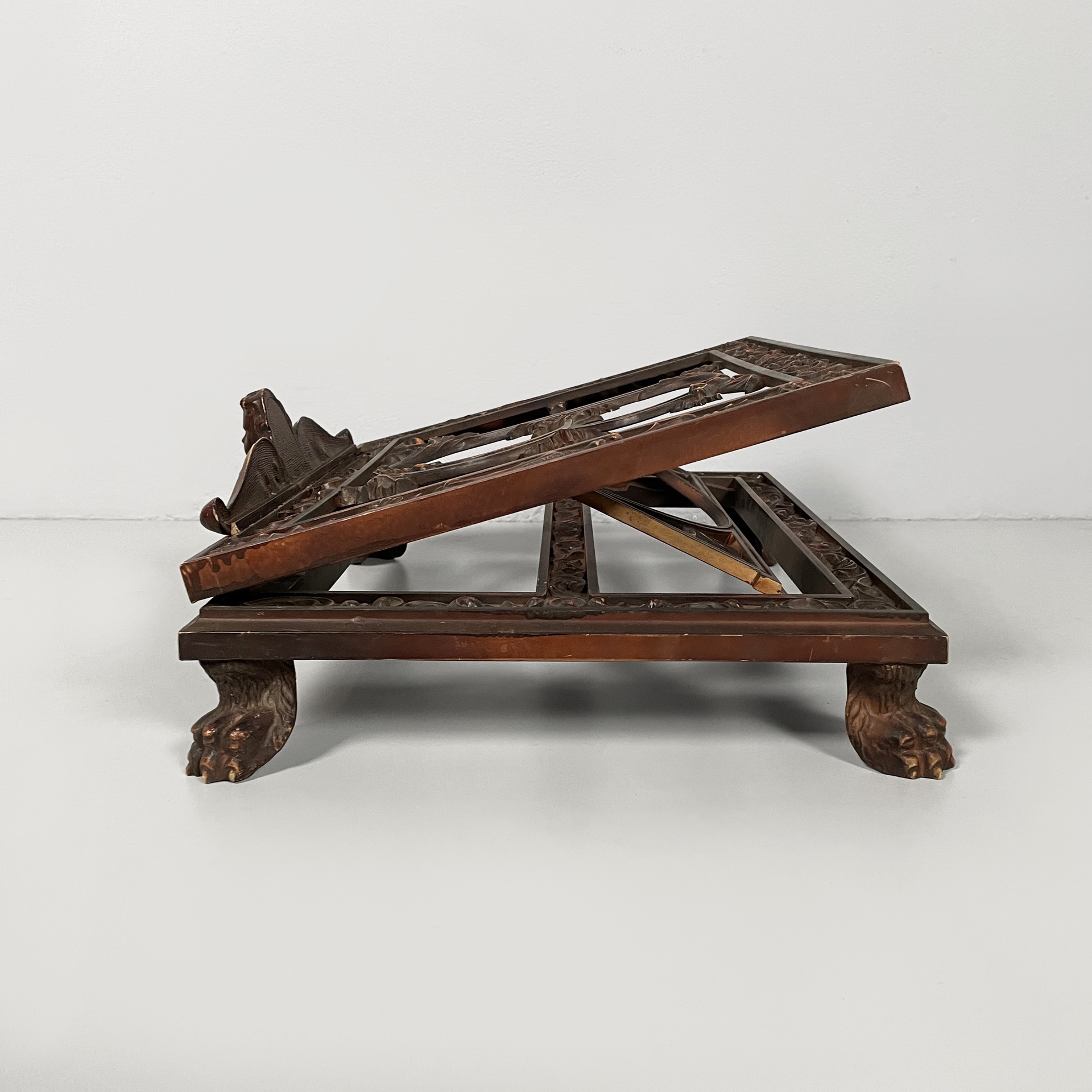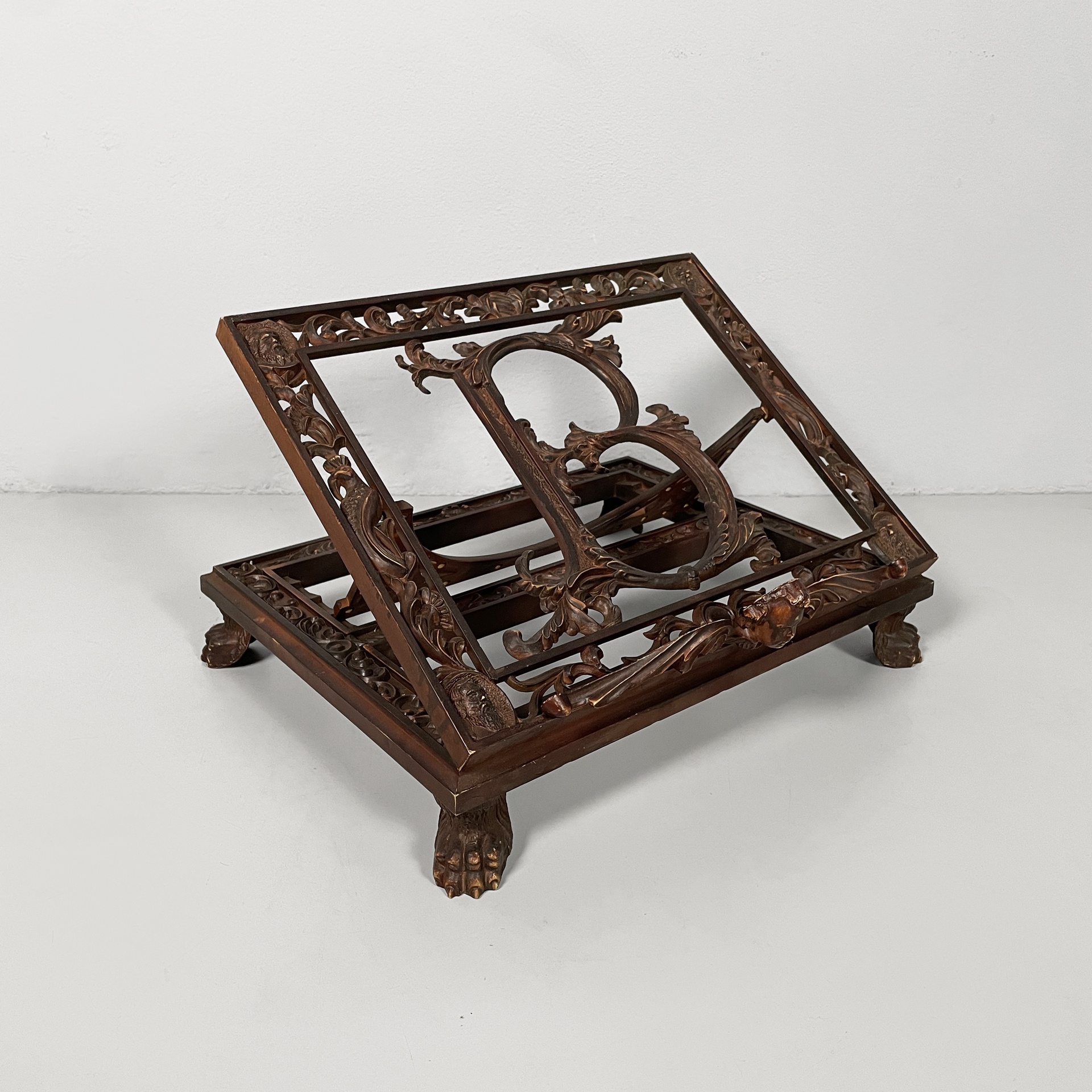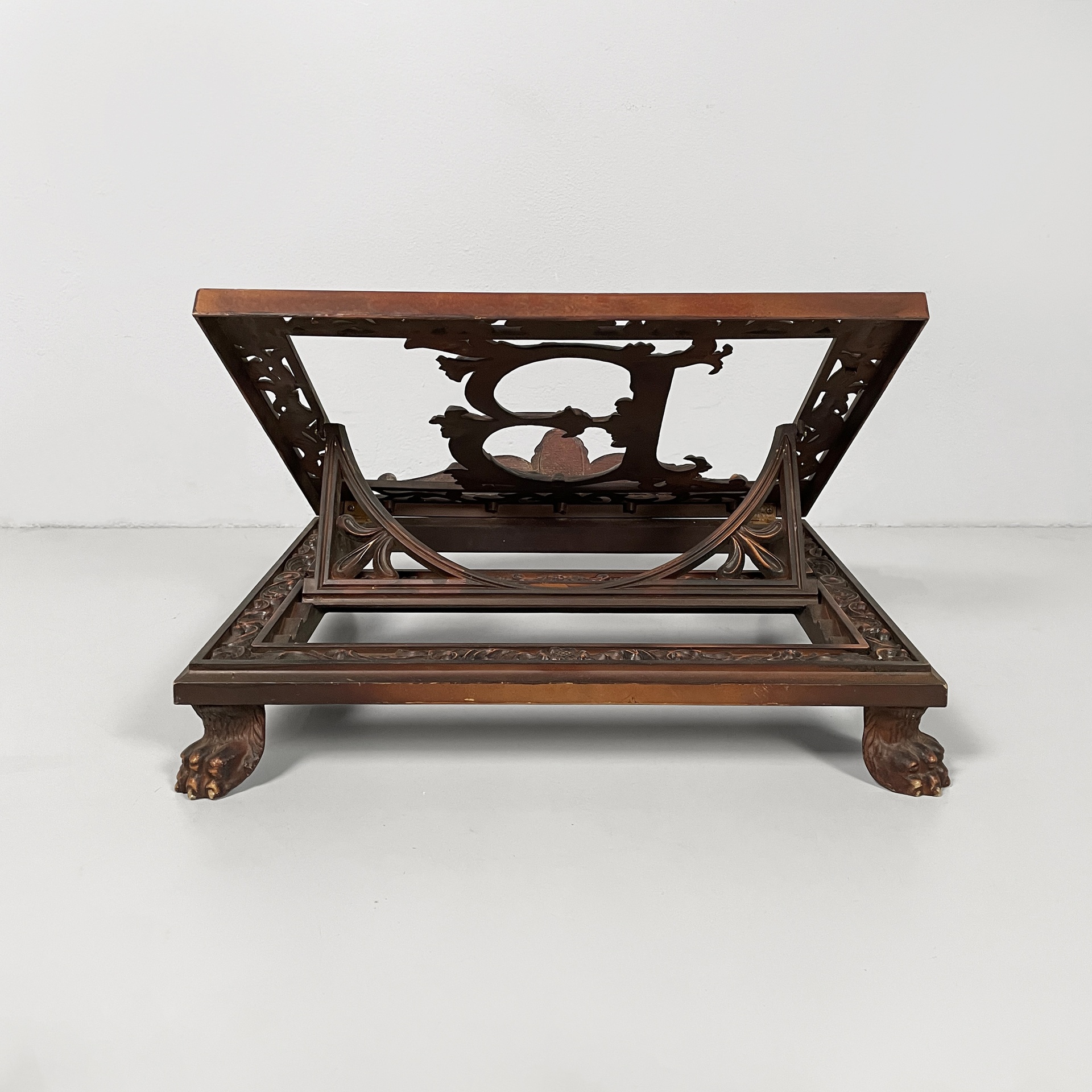 Leggio da tavolo in bachelite. Il piano di appoggio finemente lavorato presenta una B centrale. La base rettangolare presenta numerosi decori e piedini a zampa di leone. Il leggio ha tre gradi di inclinazione.