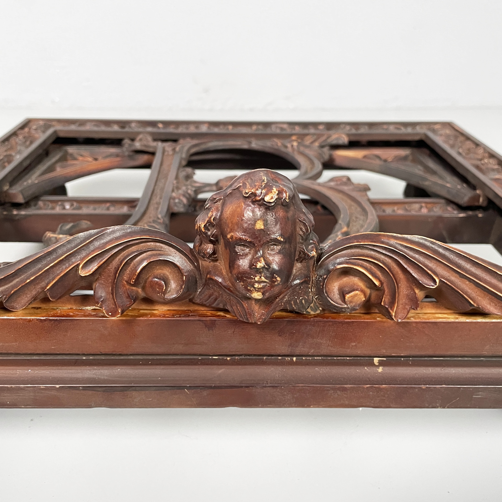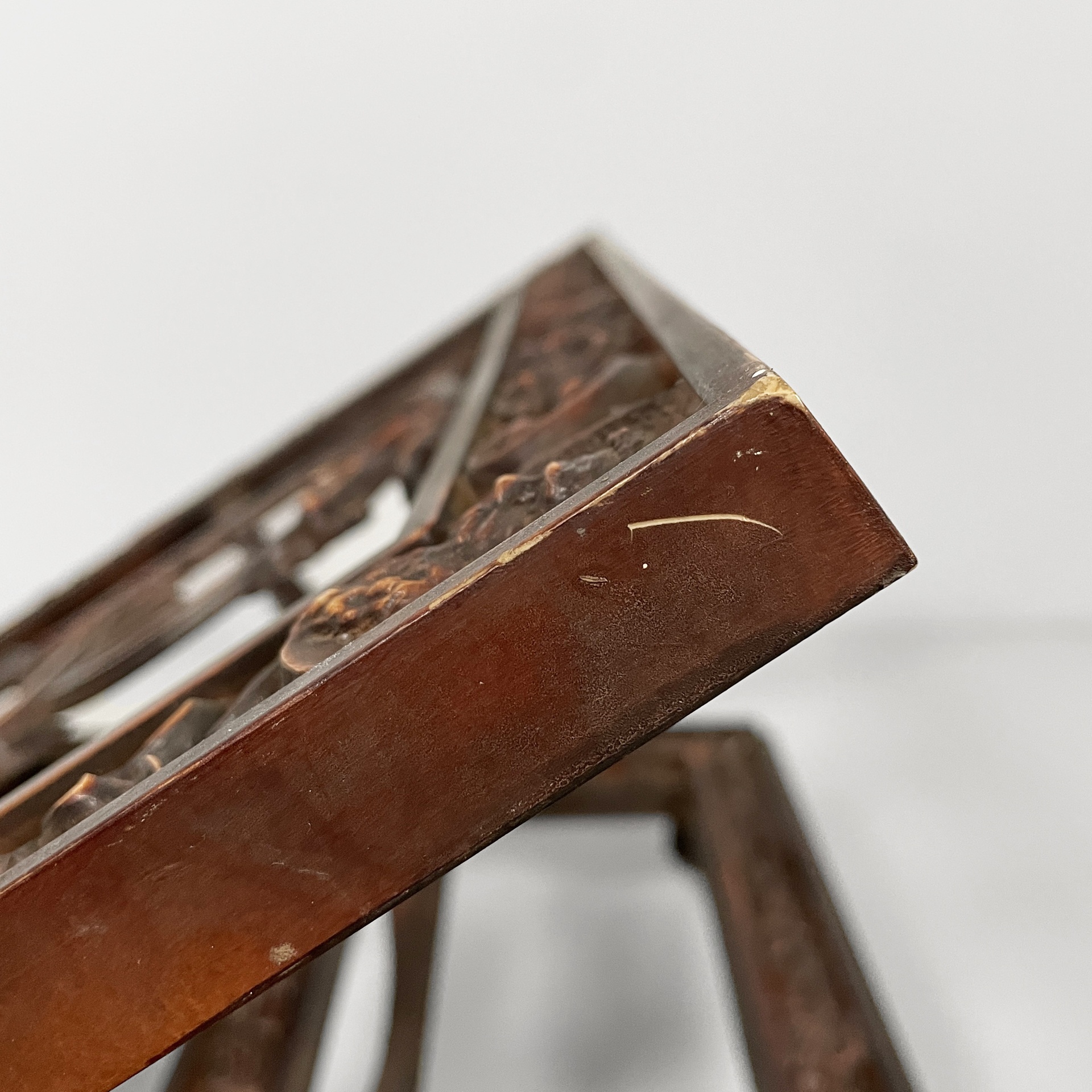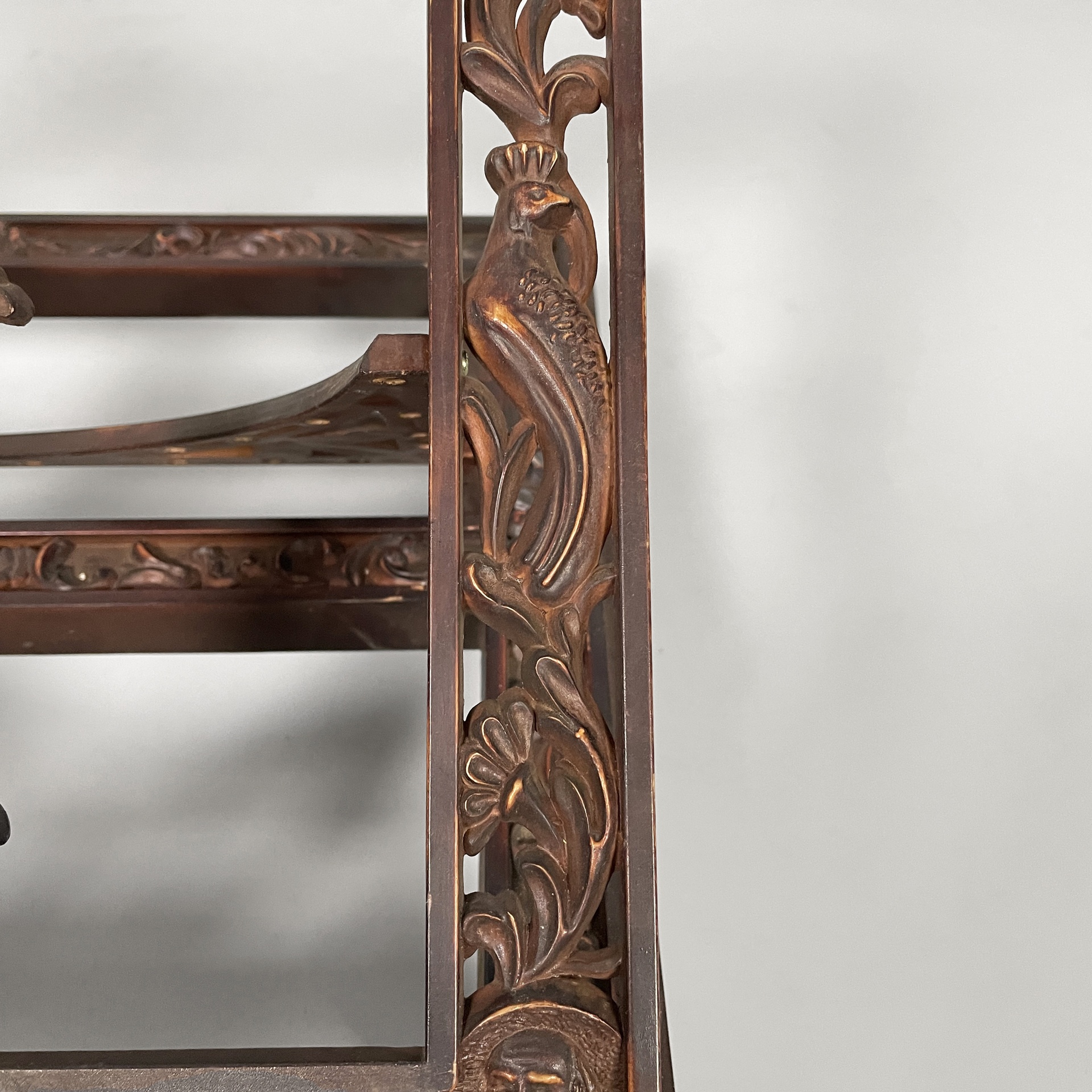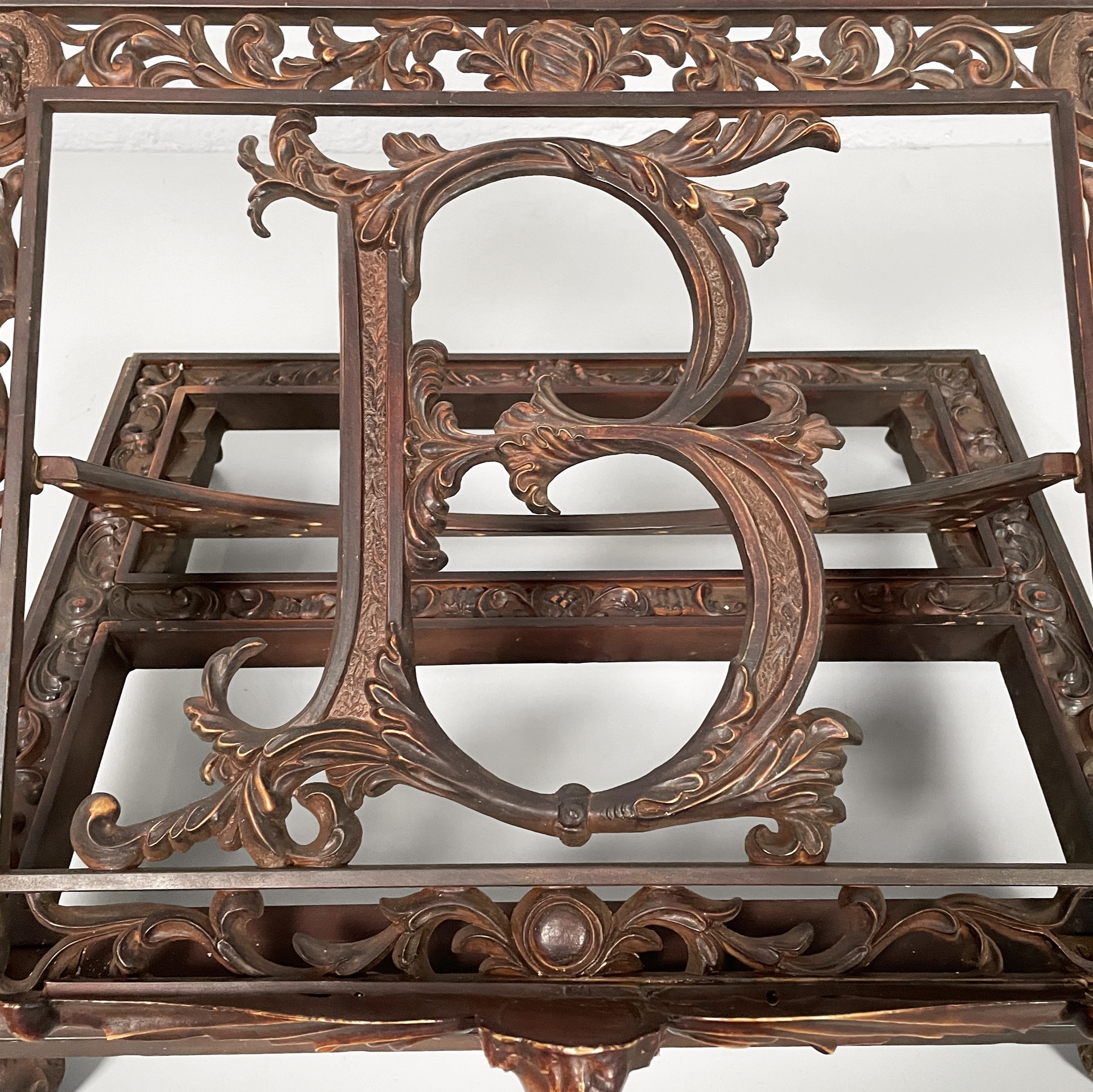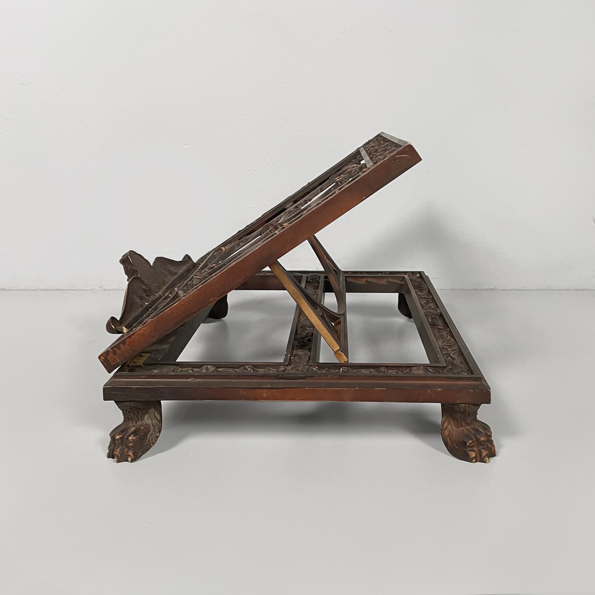Leggio da tavolo in bachelite. Il piano di appoggio finemente lavorato presenta una B centrale. La base rettangolare presenta numerosi decori e piedini a zampa di leone. Il leggio ha tre gradi di inclinazione.