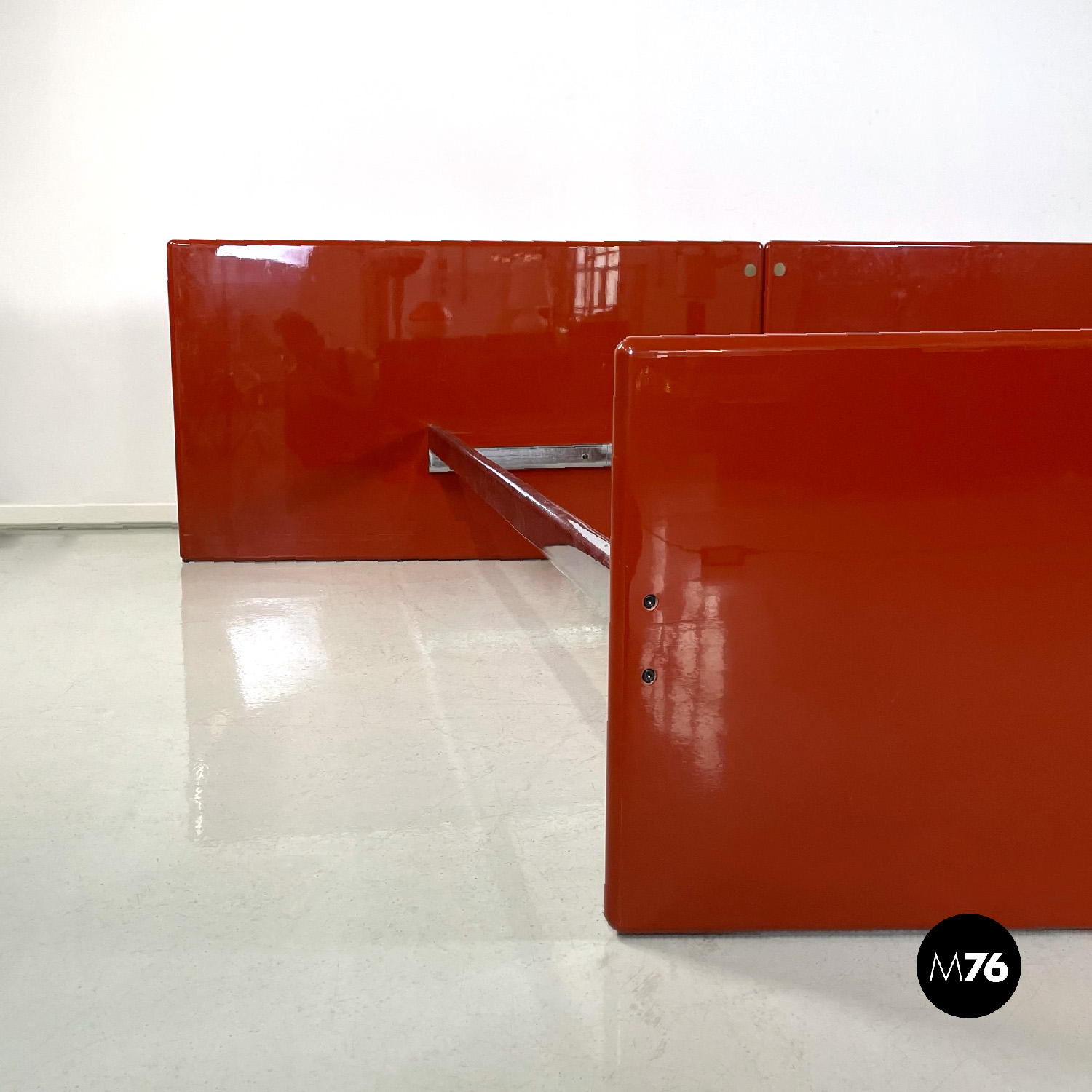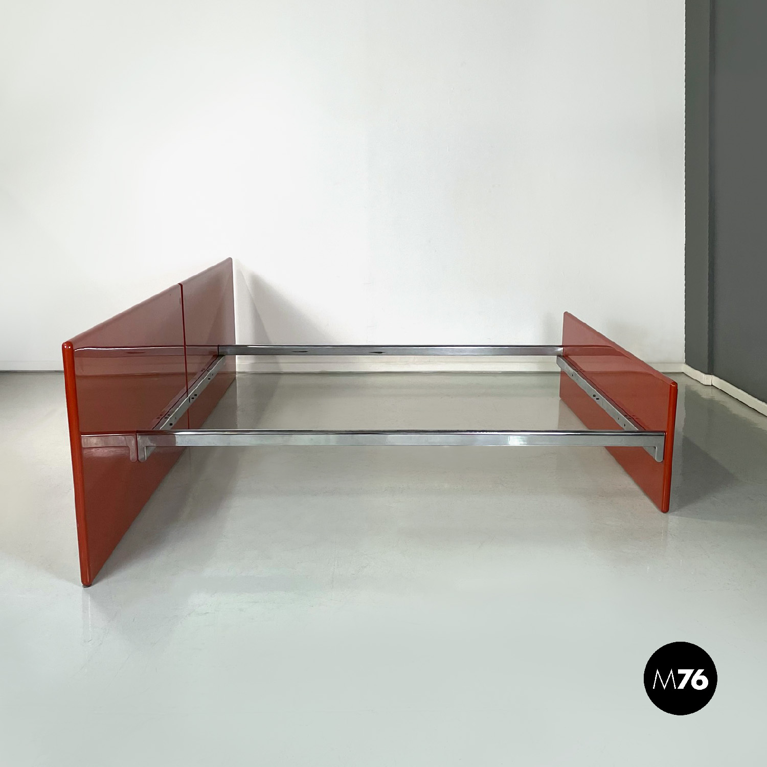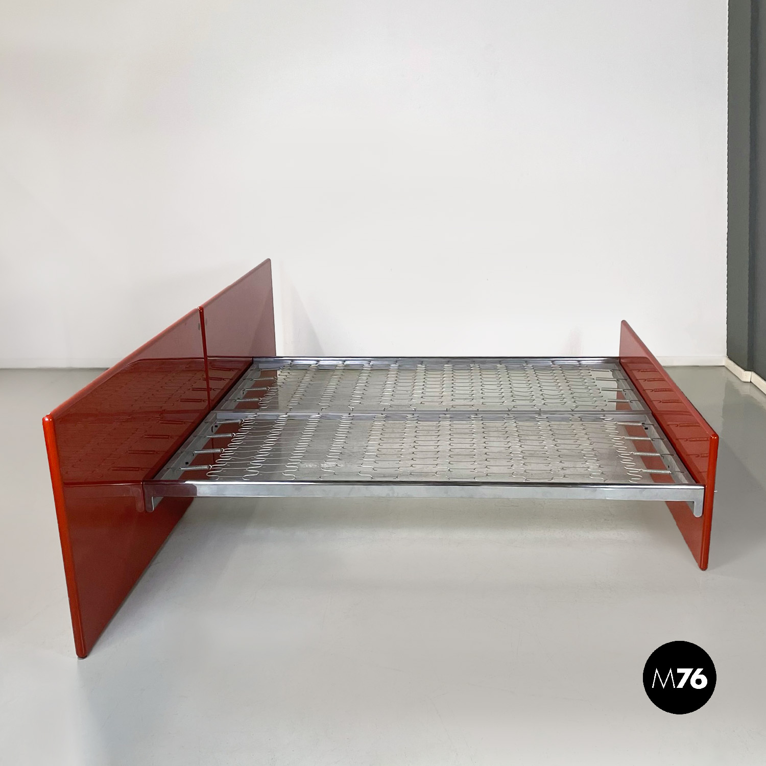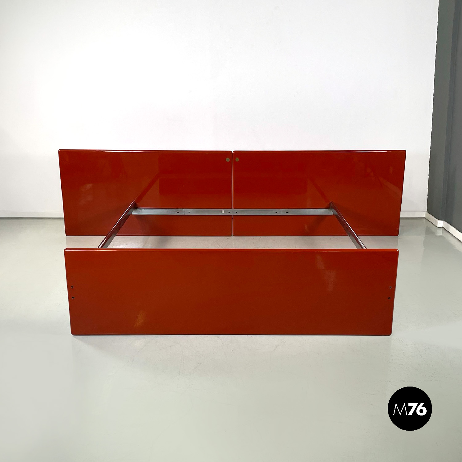 Letto rettangolare con struttura in legno laccato rosso vermiglione e metallo. La struttura che contiene le reti è in metallo argentato. I due pannelli che compongono la testata si estendono oltre la struttura di metallo, presentano due dettagli di forma tonda di metallo. Ai piedi del letto si trova un altro pannello in legno laccato più basso rispetto alla testata e quasi della stessa lunghezza della struttura metallica.