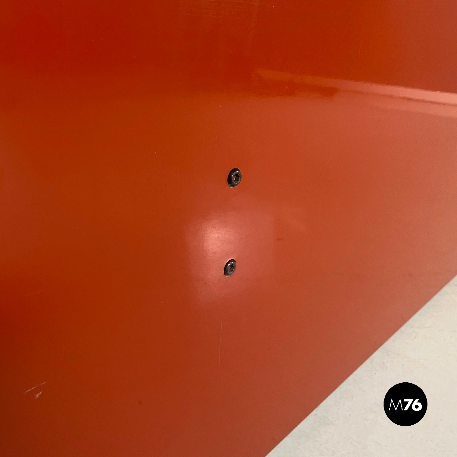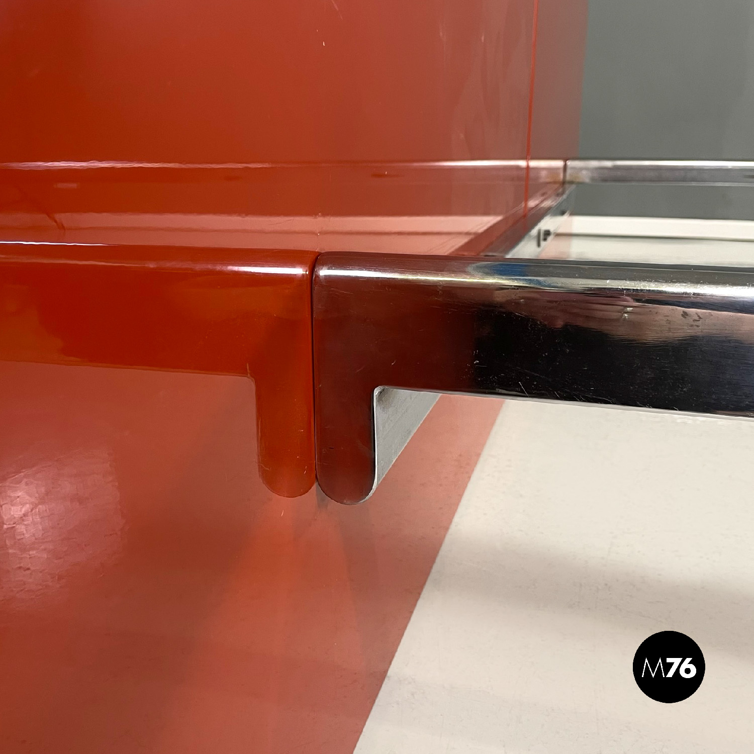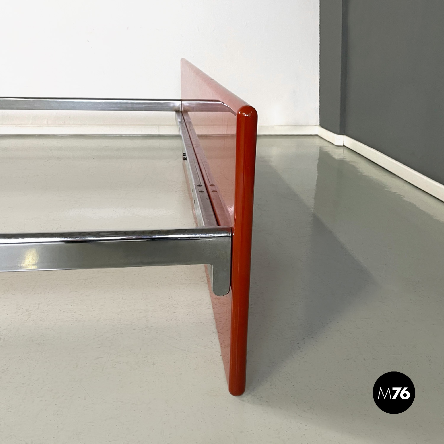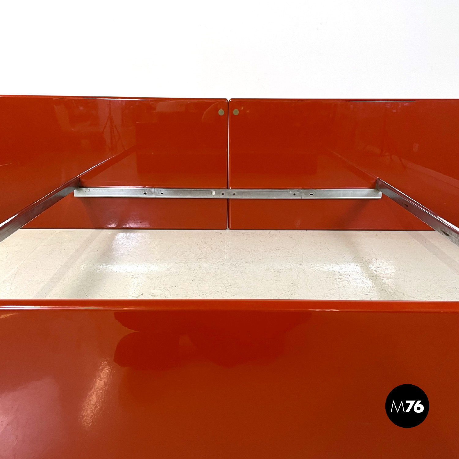 Letto rettangolare con struttura in legno laccato rosso vermiglione e metallo. La struttura che contiene le reti è in metallo argentato. I due pannelli che compongono la testata si estendono oltre la struttura di metallo, presentano due dettagli di forma tonda di metallo. Ai piedi del letto si trova un altro pannello in legno laccato più basso rispetto alla testata e quasi della stessa lunghezza della struttura metallica.