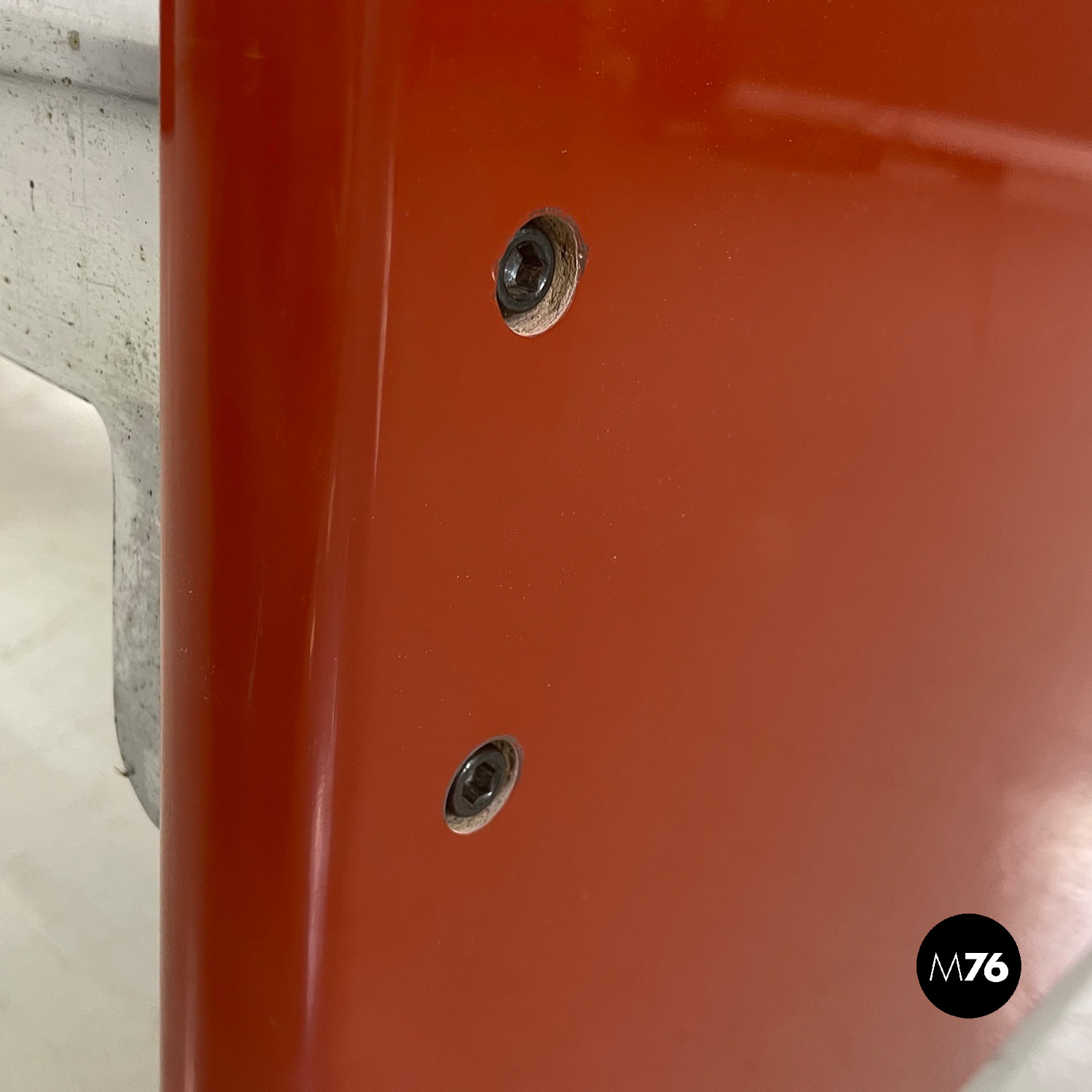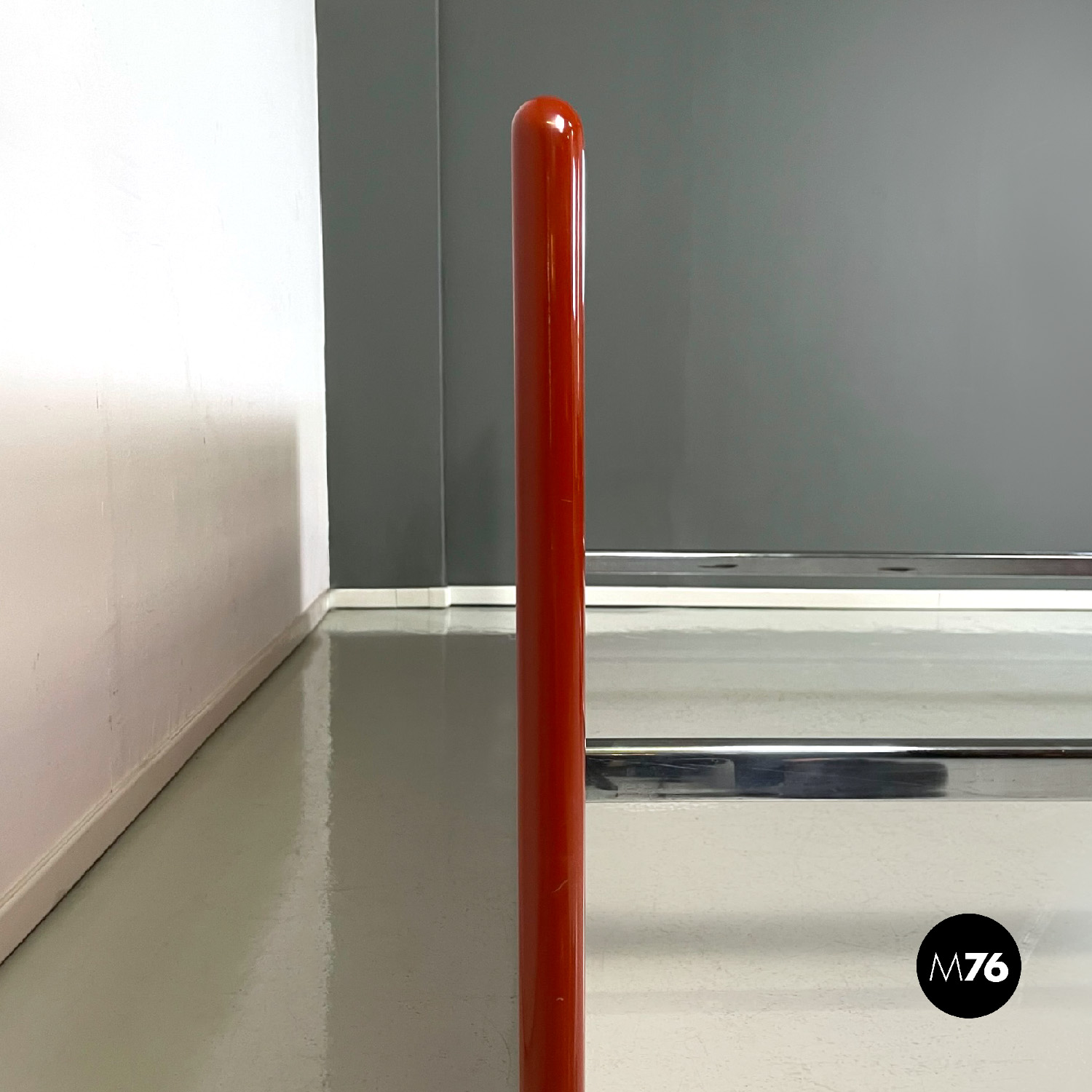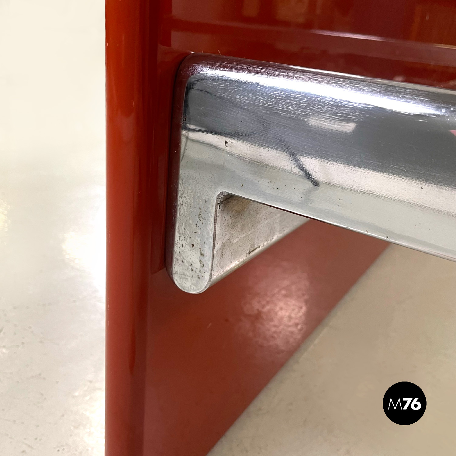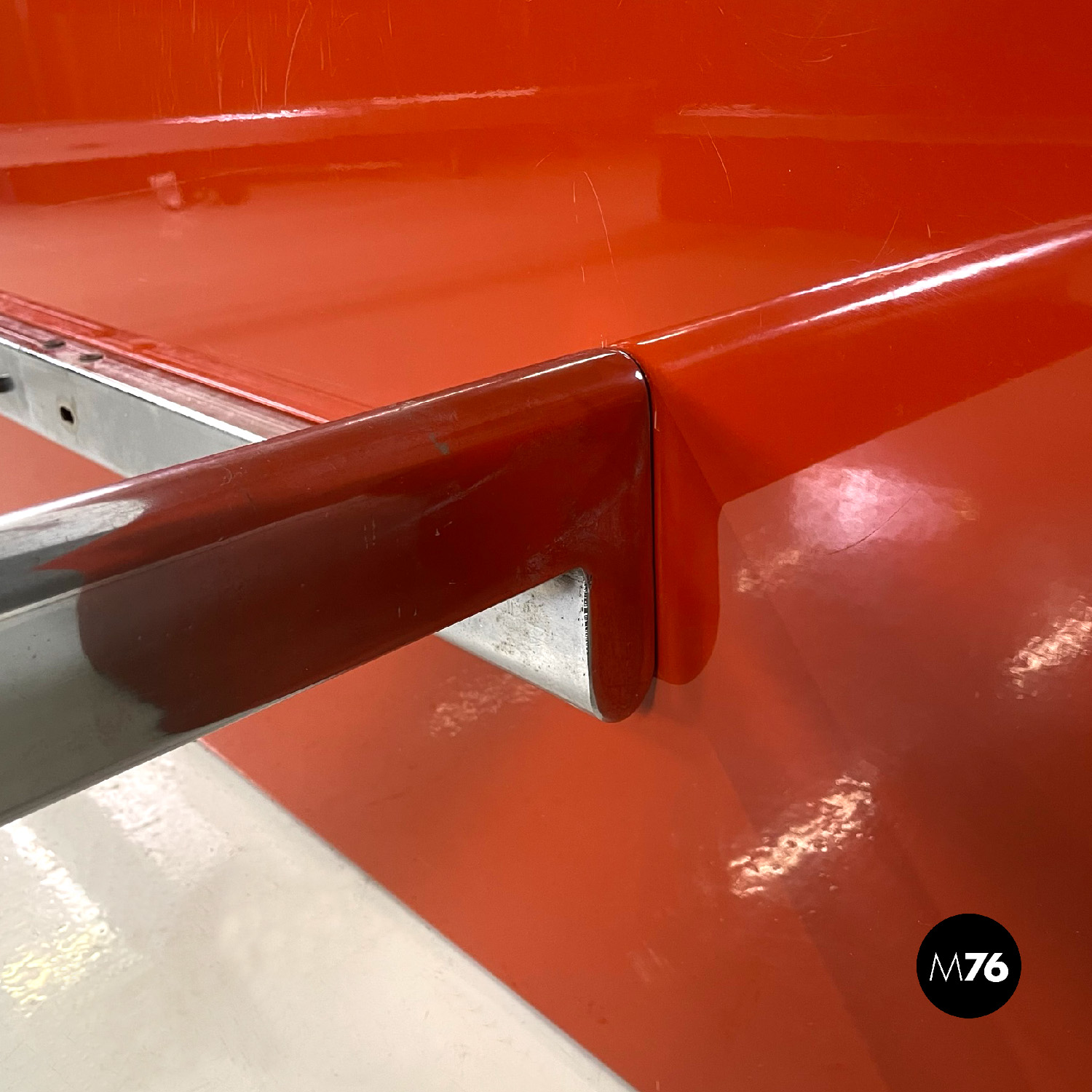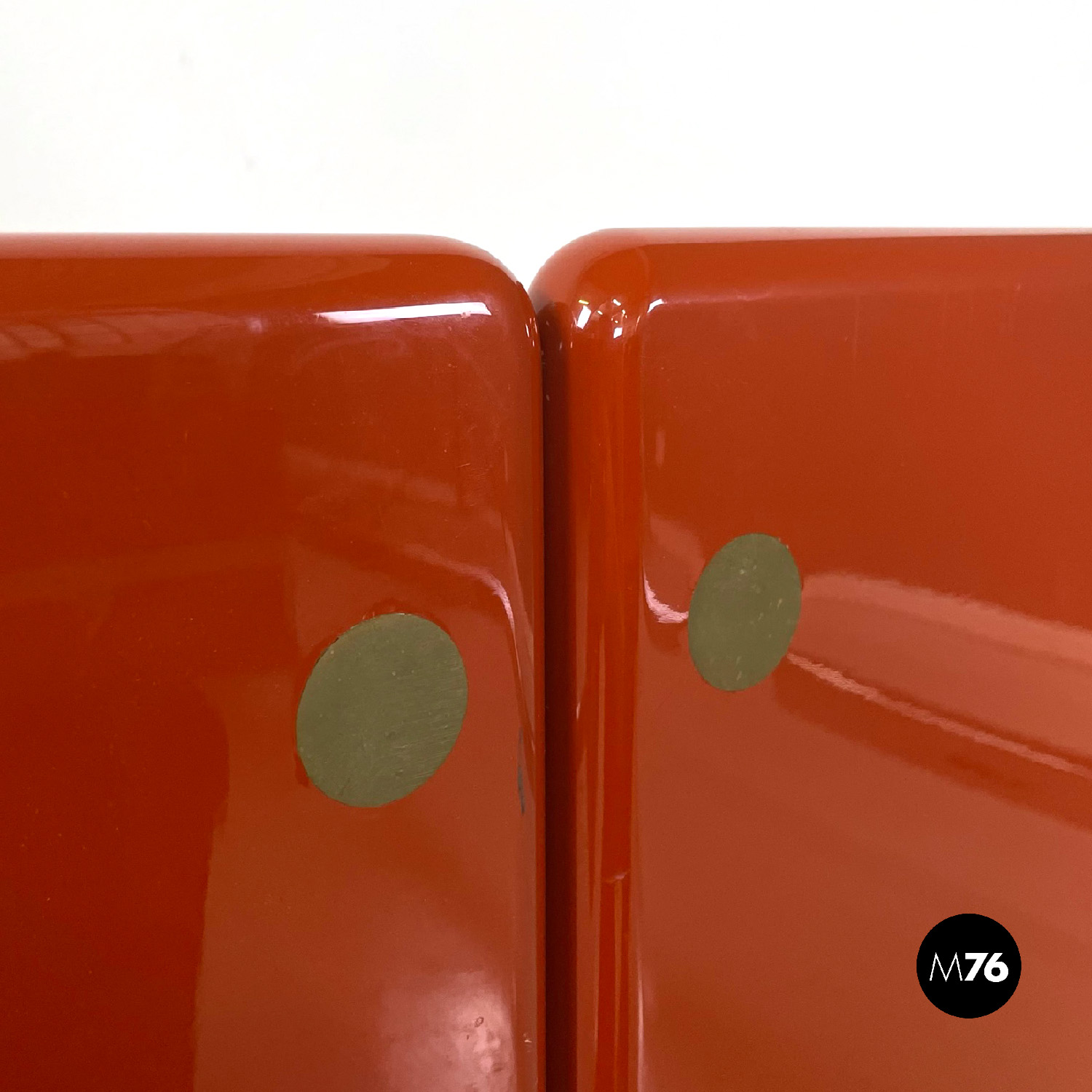 Letto rettangolare con struttura in legno laccato rosso vermiglione e metallo. La struttura che contiene le reti è in metallo argentato. I due pannelli che compongono la testata si estendono oltre la struttura di metallo, presentano due dettagli di forma tonda di metallo. Ai piedi del letto si trova un altro pannello in legno laccato più basso rispetto alla testata e quasi della stessa lunghezza della struttura metallica.