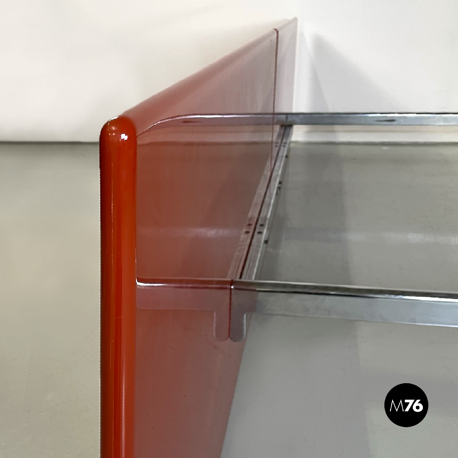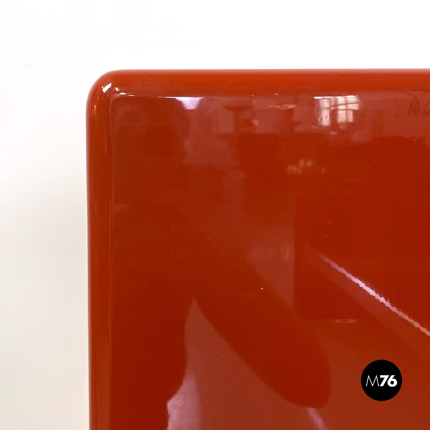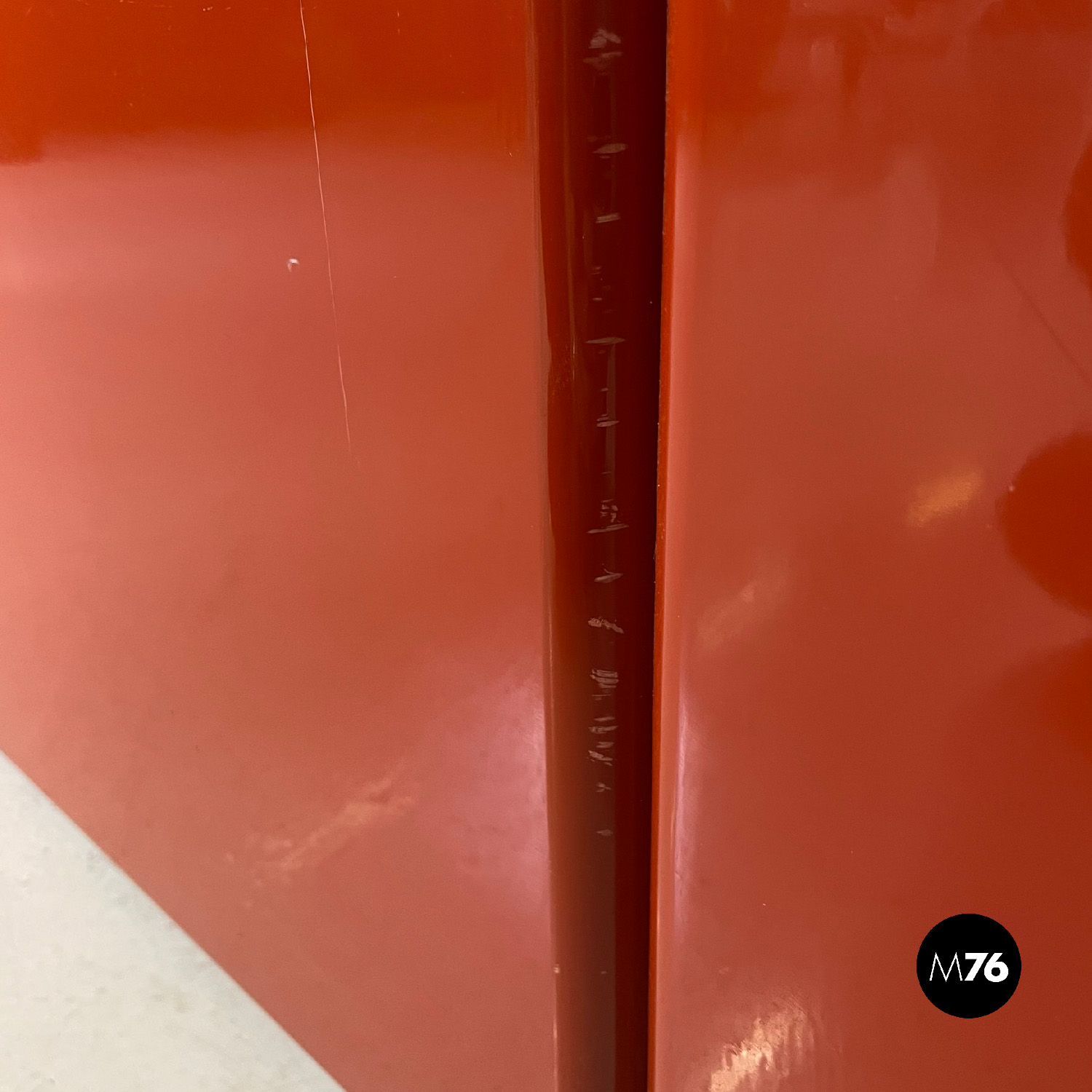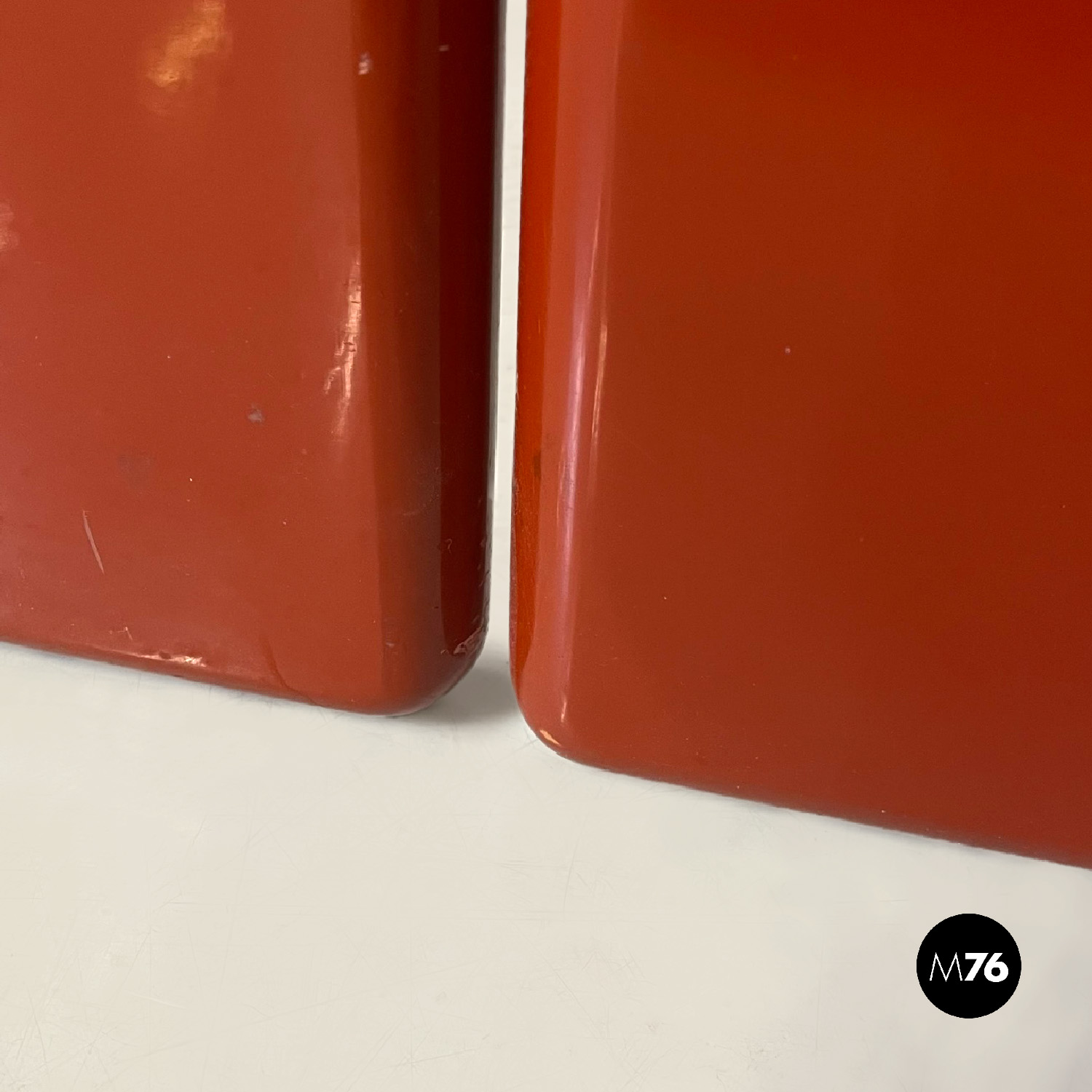 Letto rettangolare con struttura in legno laccato rosso vermiglione e metallo. La struttura che contiene le reti è in metallo argentato. I due pannelli che compongono la testata si estendono oltre la struttura di metallo, presentano due dettagli di forma tonda di metallo. Ai piedi del letto si trova un altro pannello in legno laccato più basso rispetto alla testata e quasi della stessa lunghezza della struttura metallica.