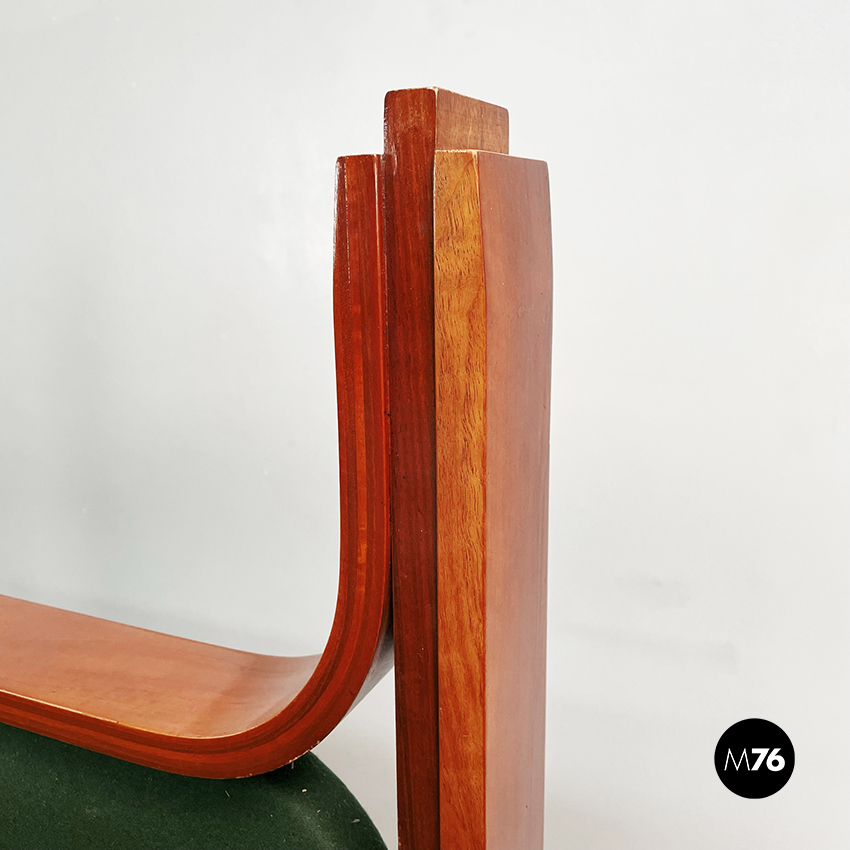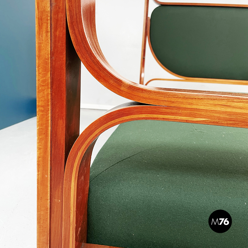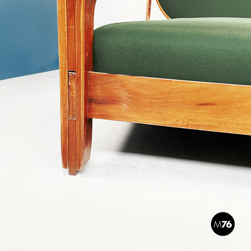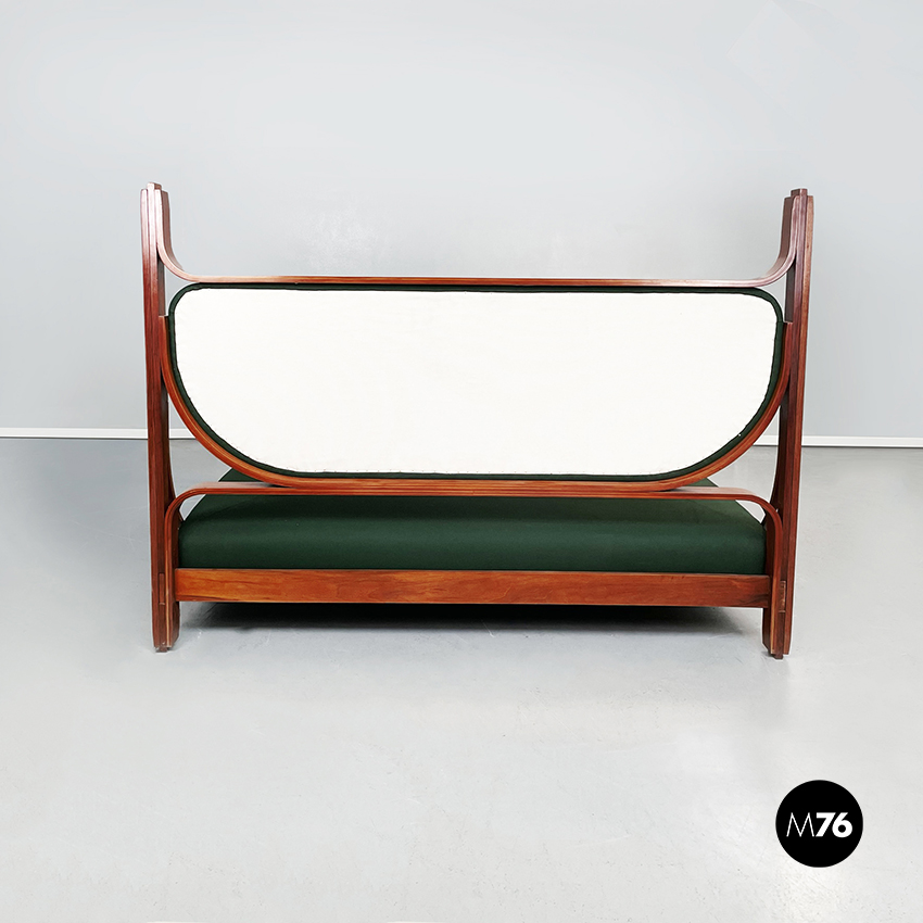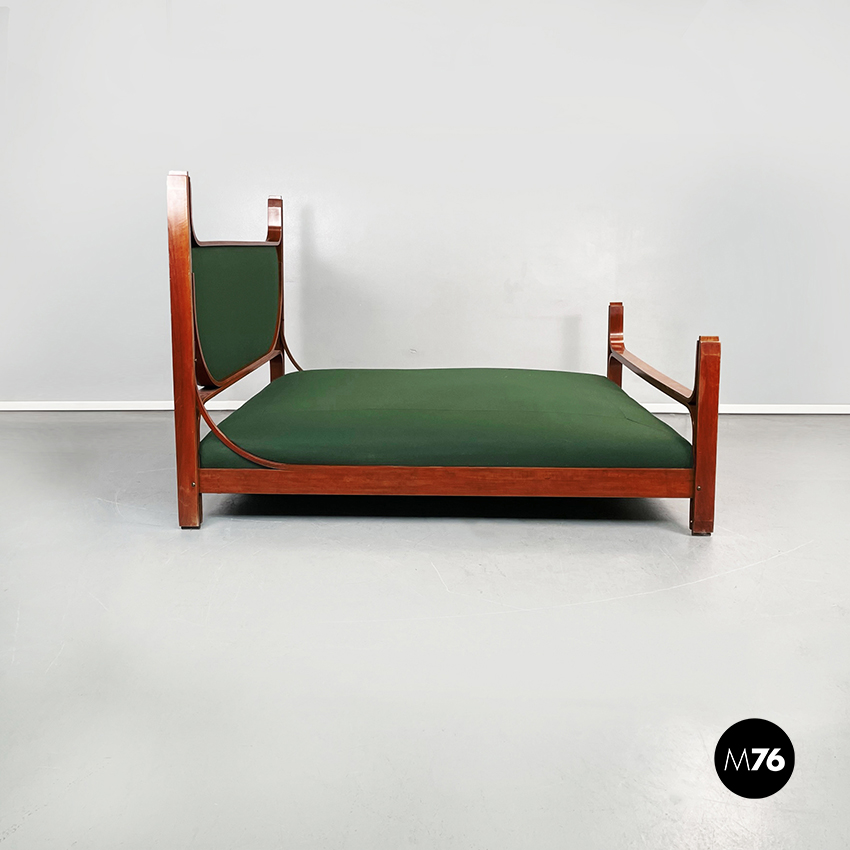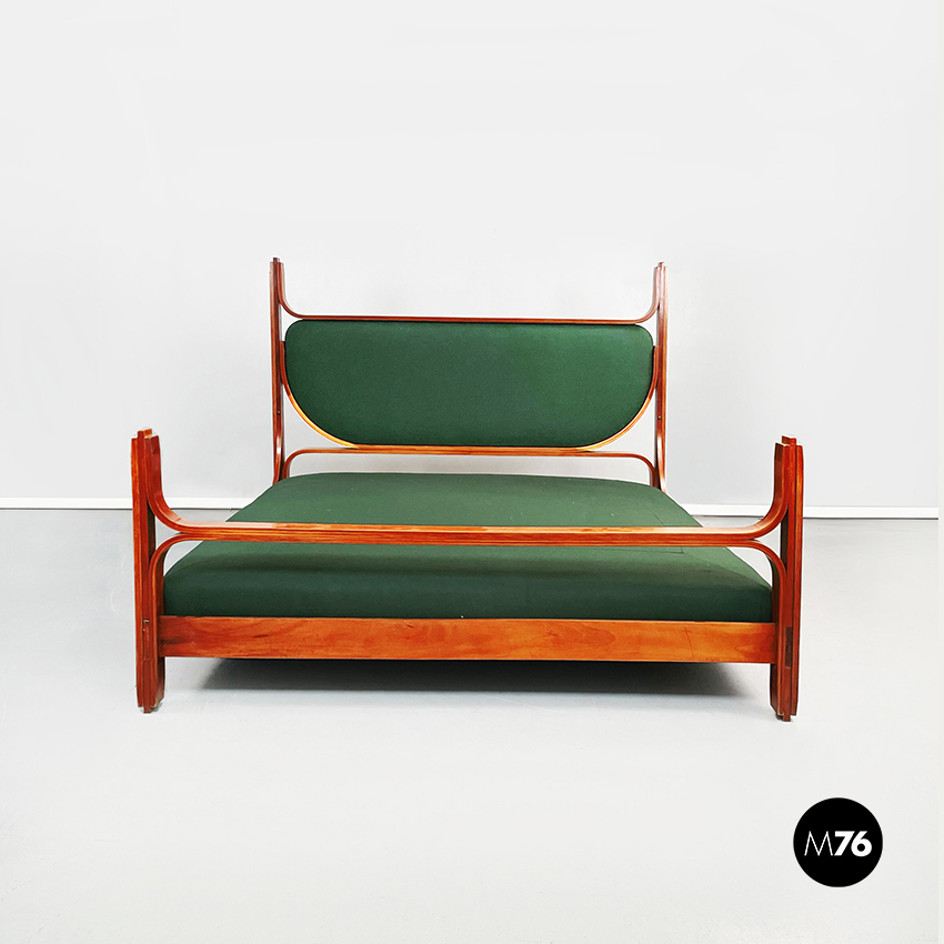 Letto matrimoniale mod. L12 con materasso rettangolare, imbottito e rivestito in tessuto verde bosco. La struttura è in legno massello curvato. La testata è rifinita con un’imbottitura, rivestiva in tessuto verde bosco.