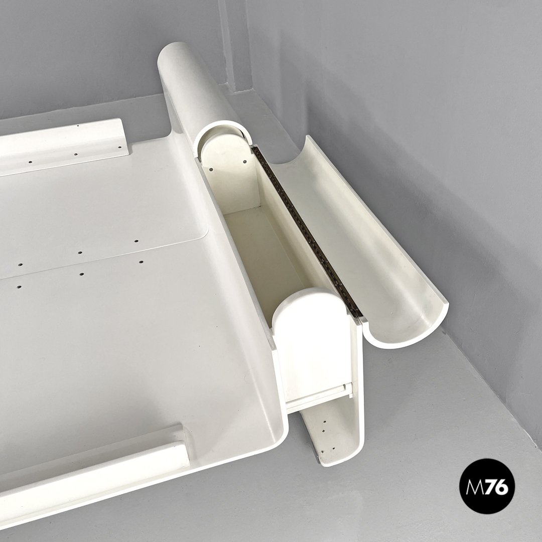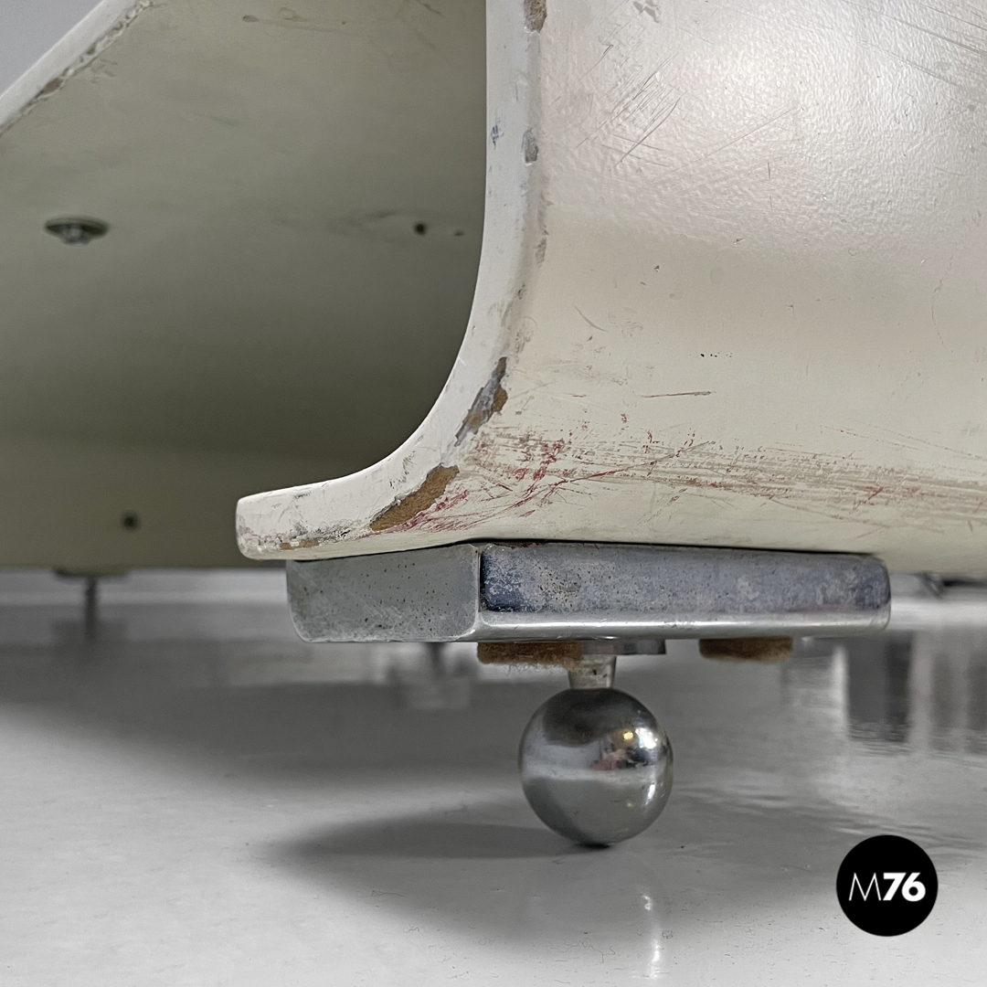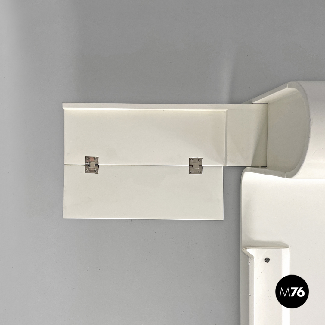 Letto matrimoniale a due piazze modello Aiace rettangolare. La struttura è interamente in legno laccato bianco con finitura opaca, ha delle linee morbide e curve che vanno dalla testiera alla pediera, nell’appoggio a terra e sui due listelli che contengono il materasso. Sopra la testiera si trova un’anta curva che si apre su uno spazio interno, mentre dai lati si possono estrarre due piani d’appoggio. I piedini sono sferici in metallo cromato.