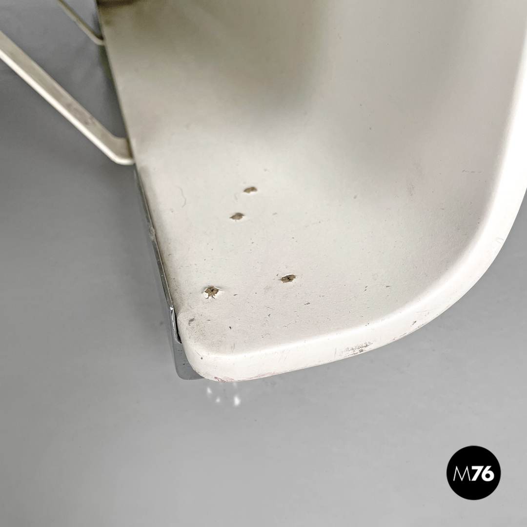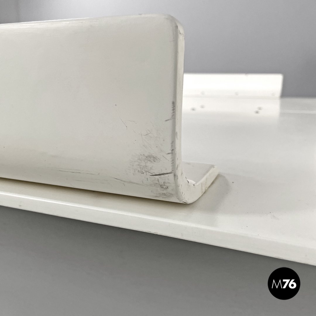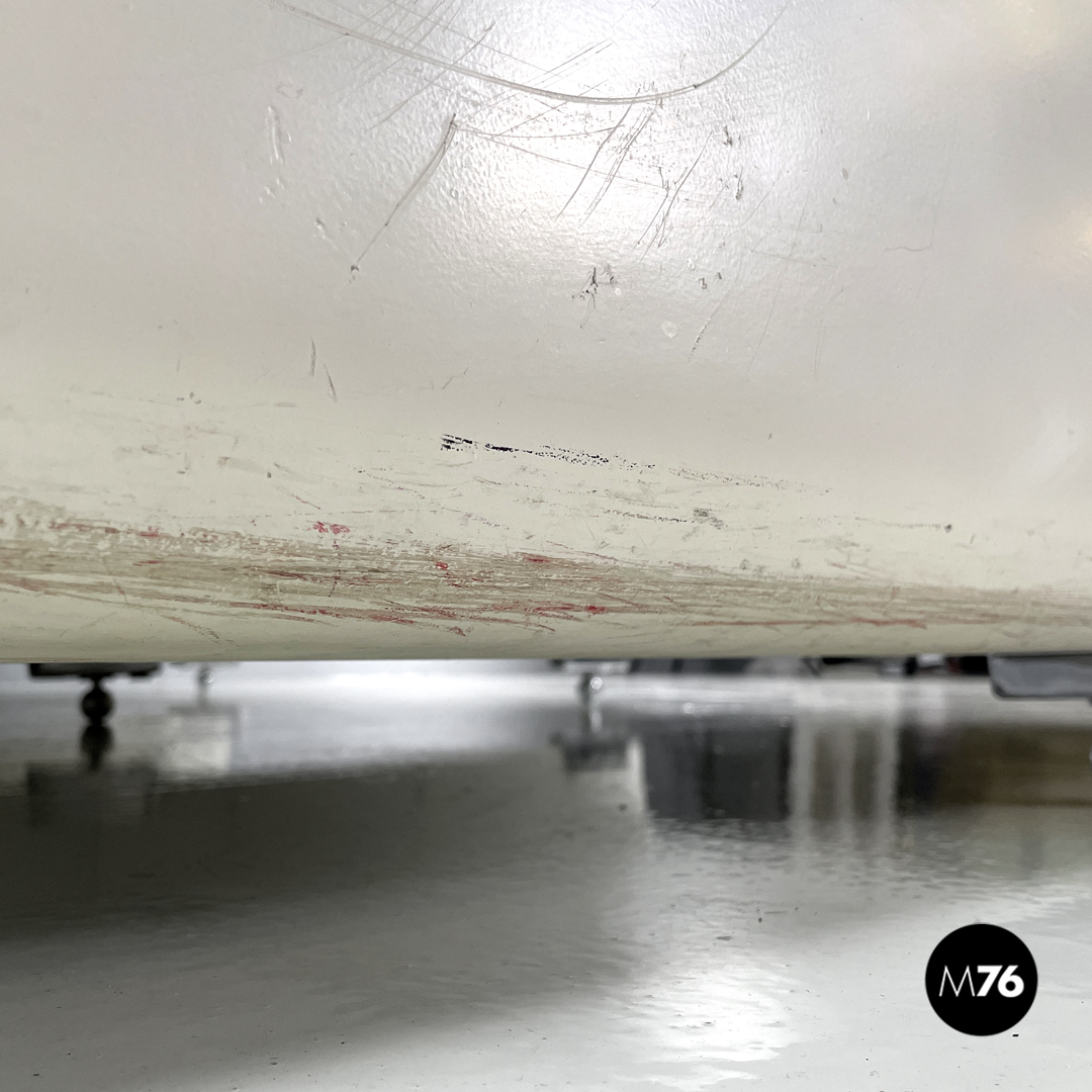 Letto matrimoniale a due piazze modello Aiace rettangolare. La struttura è interamente in legno laccato bianco con finitura opaca, ha delle linee morbide e curve che vanno dalla testiera alla pediera, nell’appoggio a terra e sui due listelli che contengono il materasso. Sopra la testiera si trova un’anta curva che si apre su uno spazio interno, mentre dai lati si possono estrarre due piani d’appoggio. I piedini sono sferici in metallo cromato.