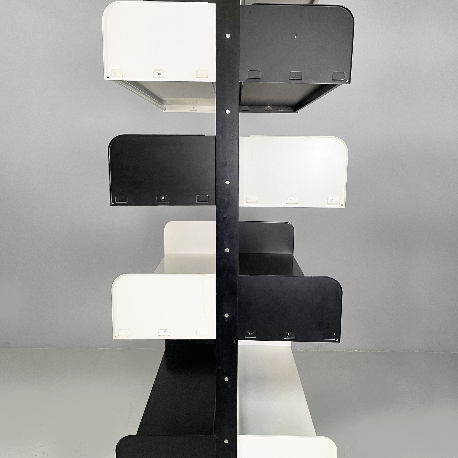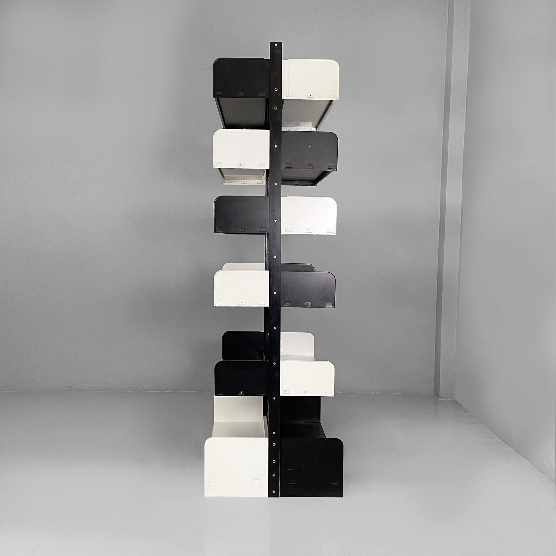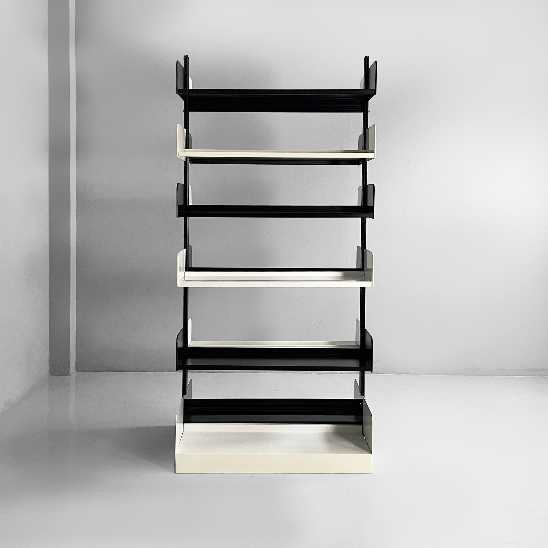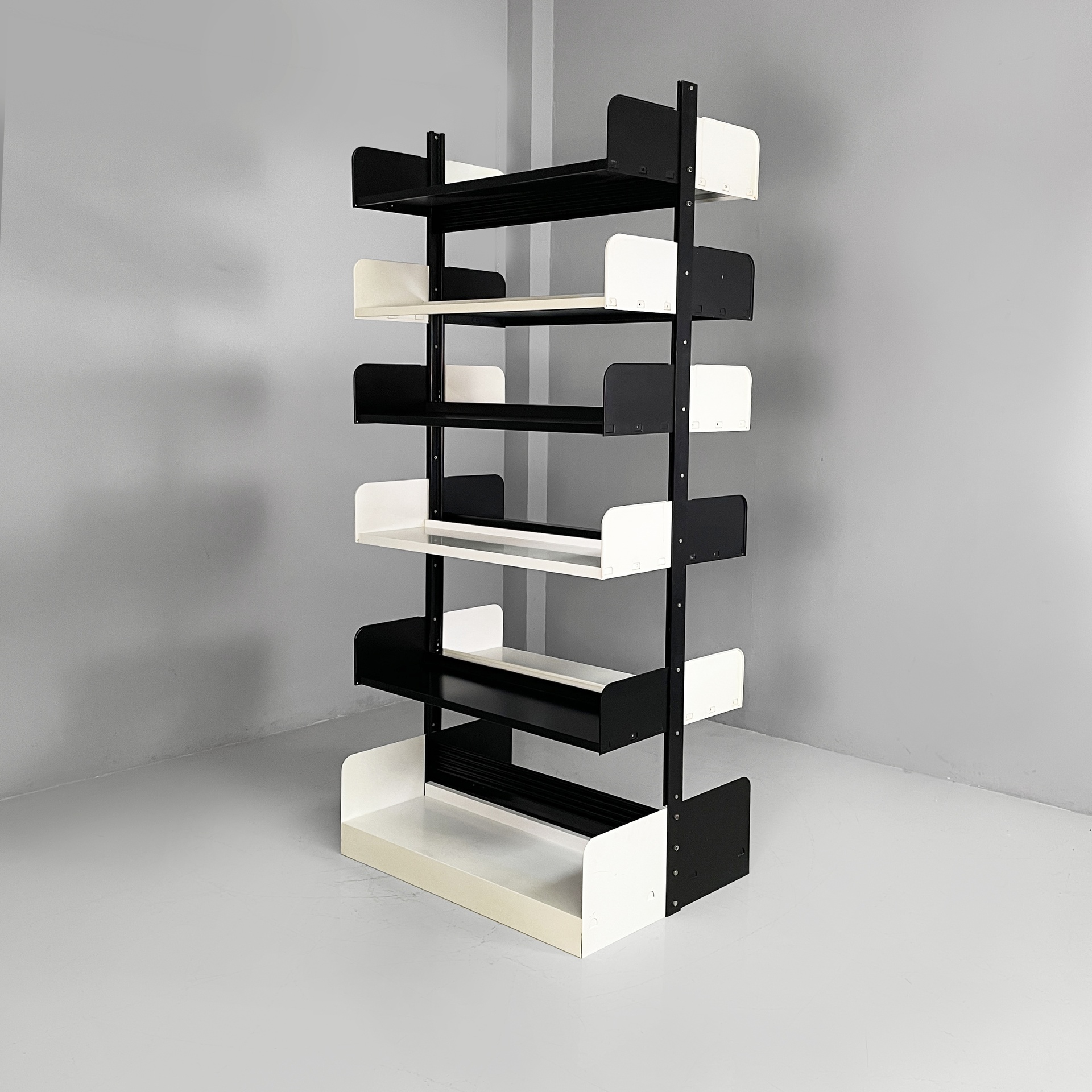 Libreria modulare da centro stanza modello Congresso interamente in metallo verniciato nero e bianca. Mensole e reggi mensola fissati ad incastro manualmente, senza bisogno di altre componenti. La struttura è composta da due montanti in metallo nero.