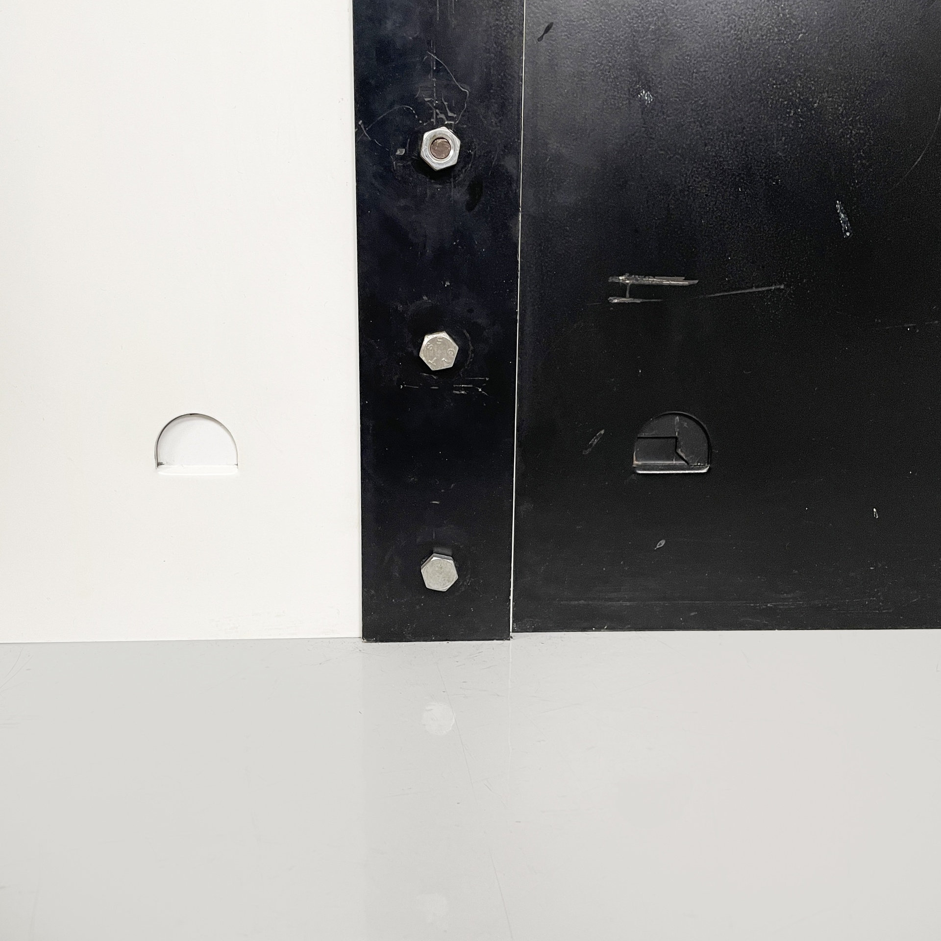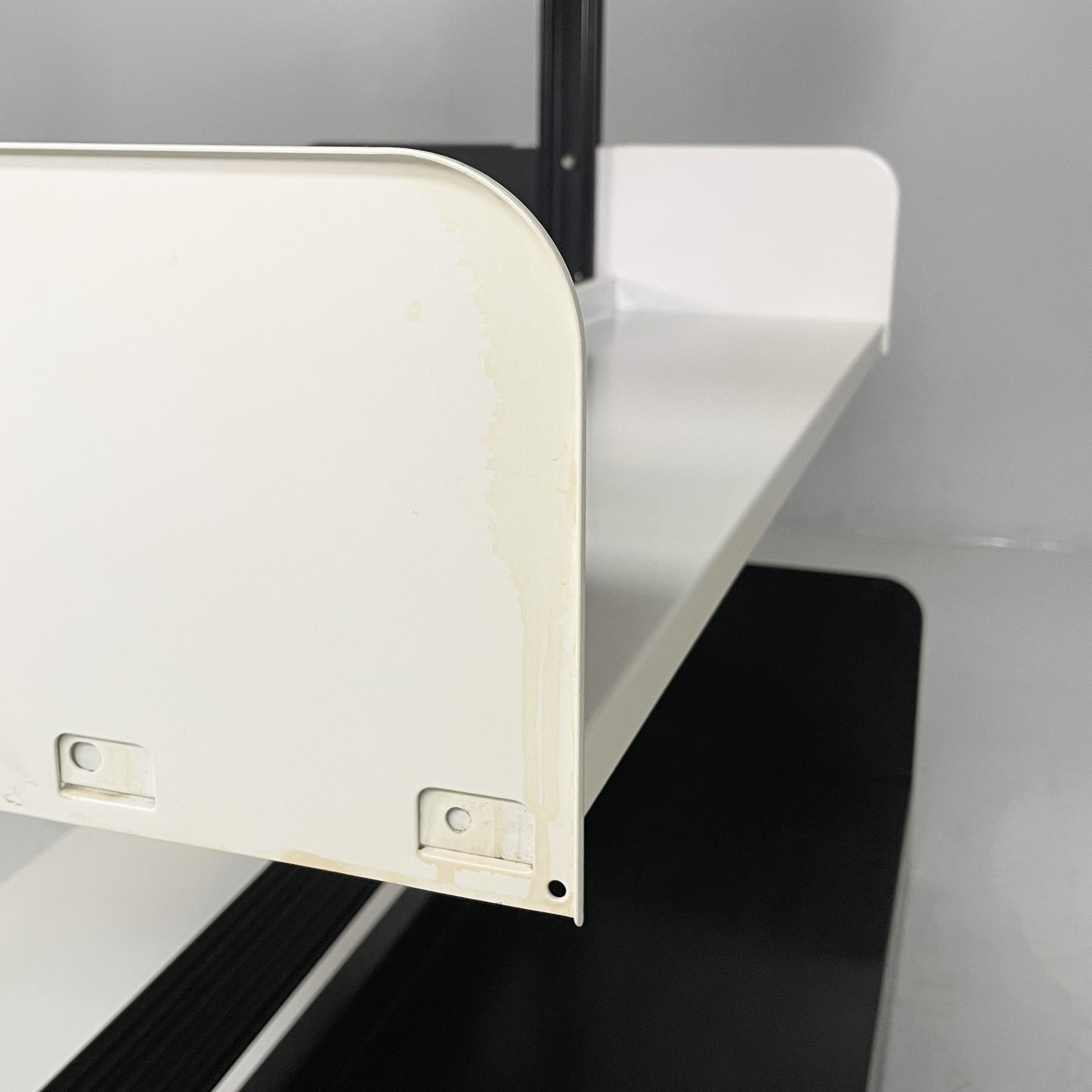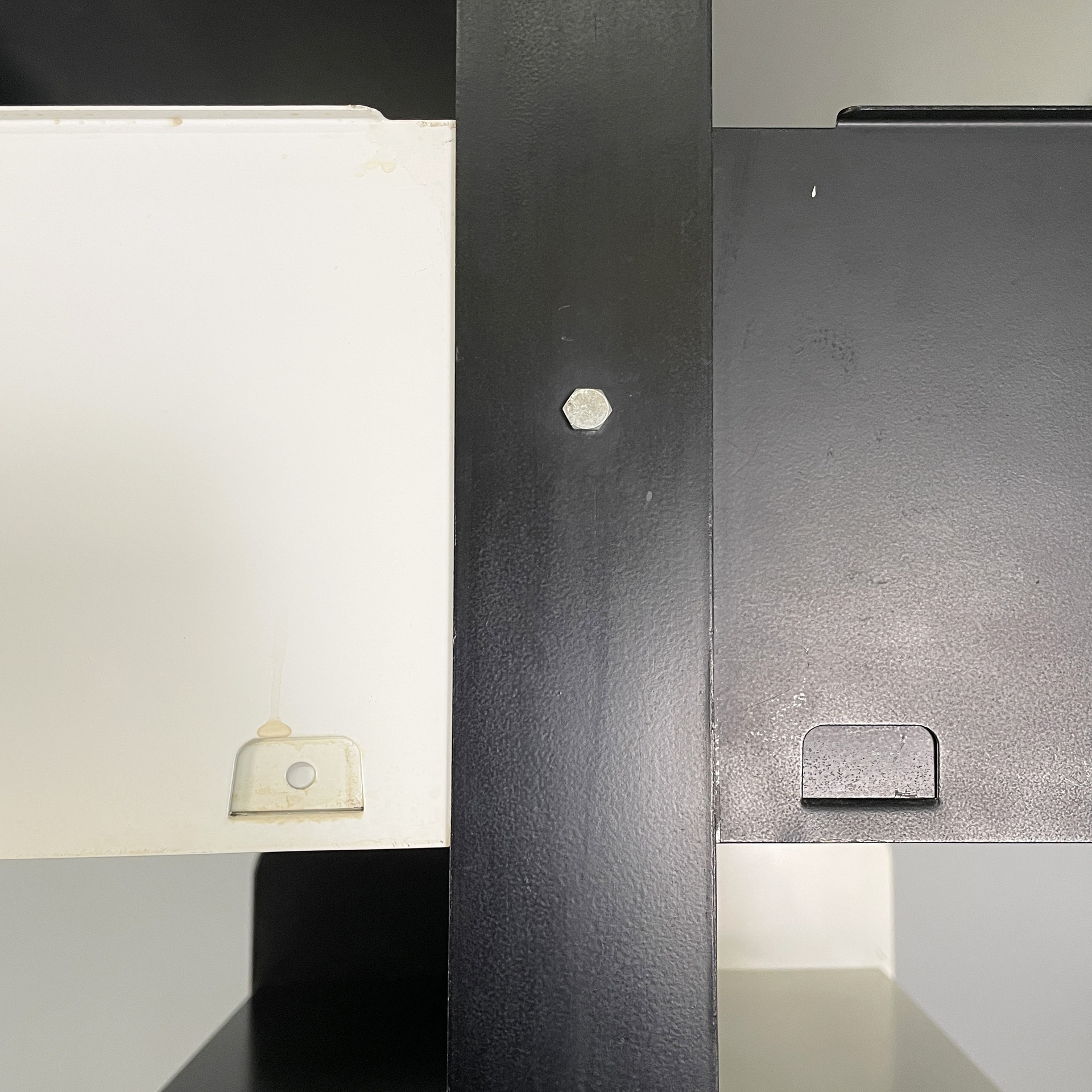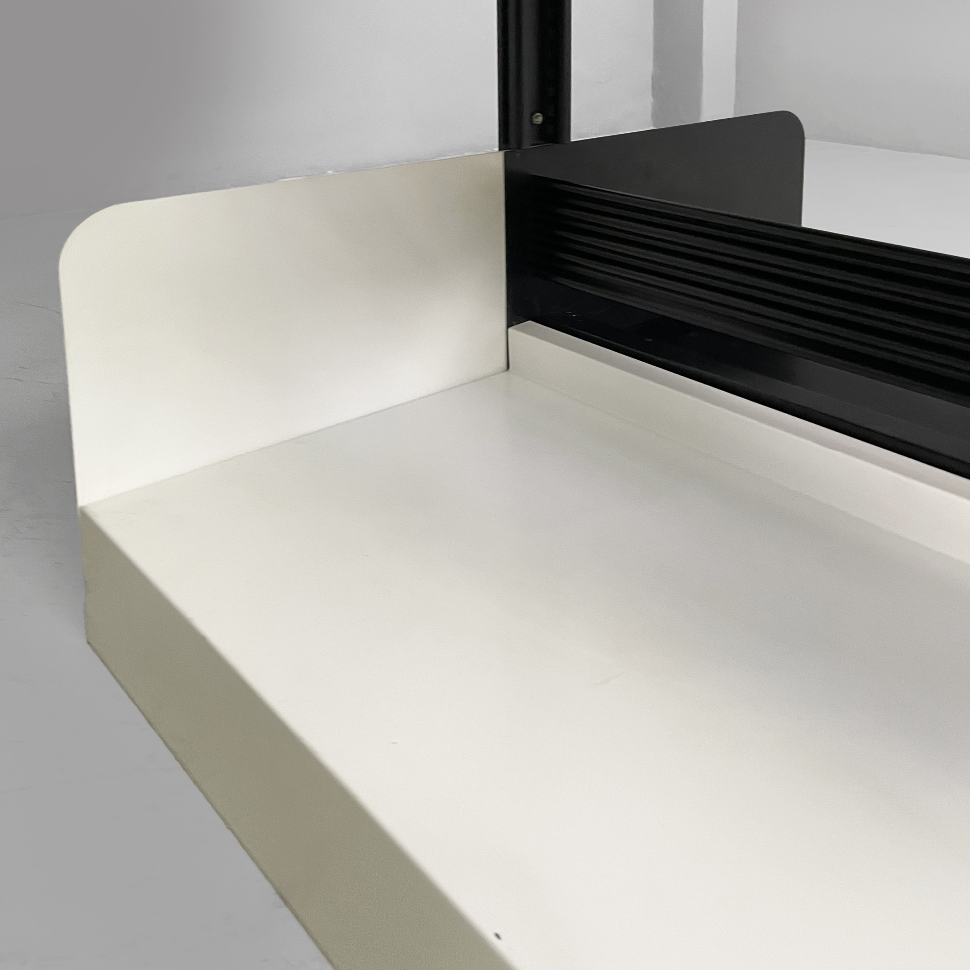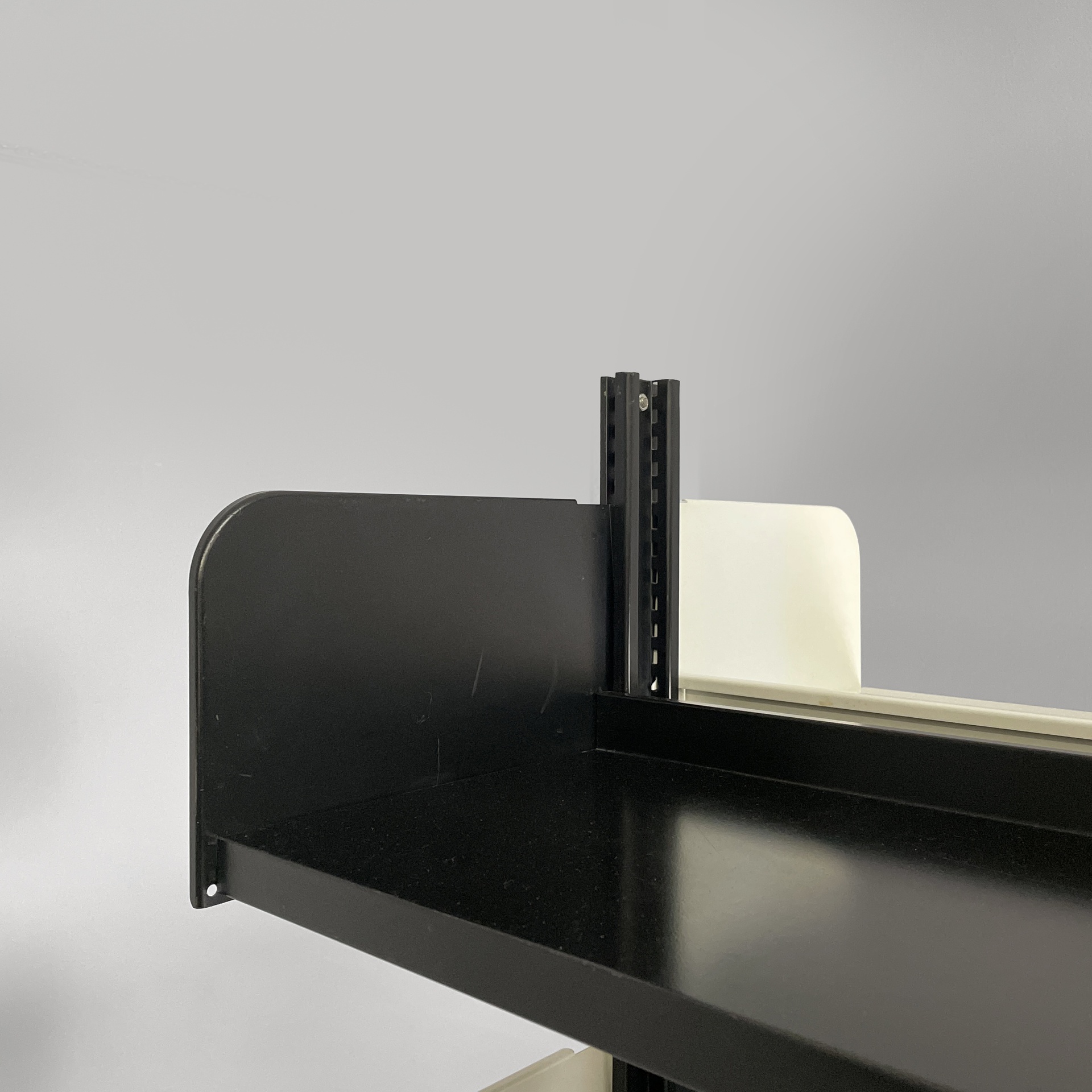 Libreria modulare da centro stanza modello Congresso interamente in metallo verniciato nero e bianca. Mensole e reggi mensola fissati ad incastro manualmente, senza bisogno di altre componenti. La struttura è composta da due montanti in metallo nero.