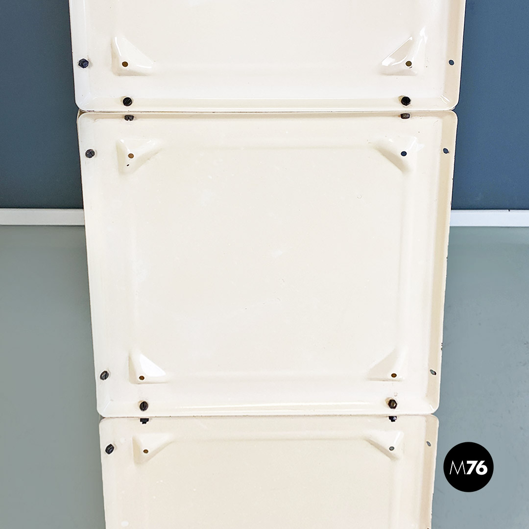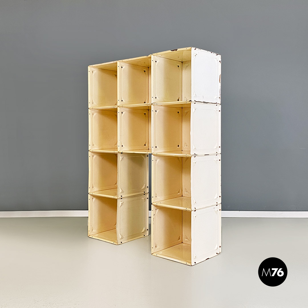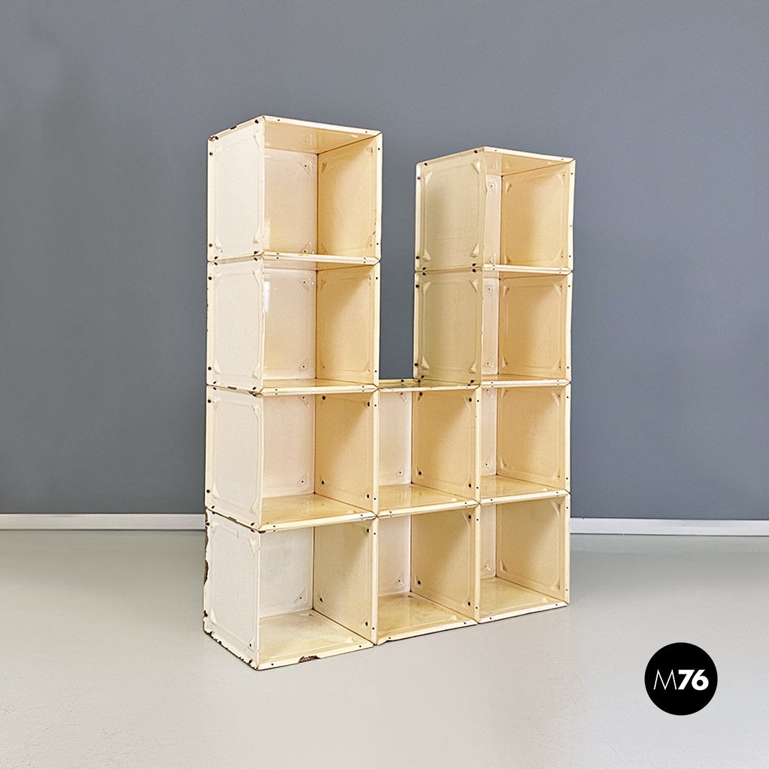 Libreria autoportante modello Container con struttura interamente in metallo, molto solida, composta da dieci cubi, avvitati tra loro a formare una piccola parete attrezzata. Bulloni di fissaggio a vista, con quattro fori su ogni lato del cubo utili a scegliere la disposizione complessiva dei moduli.
