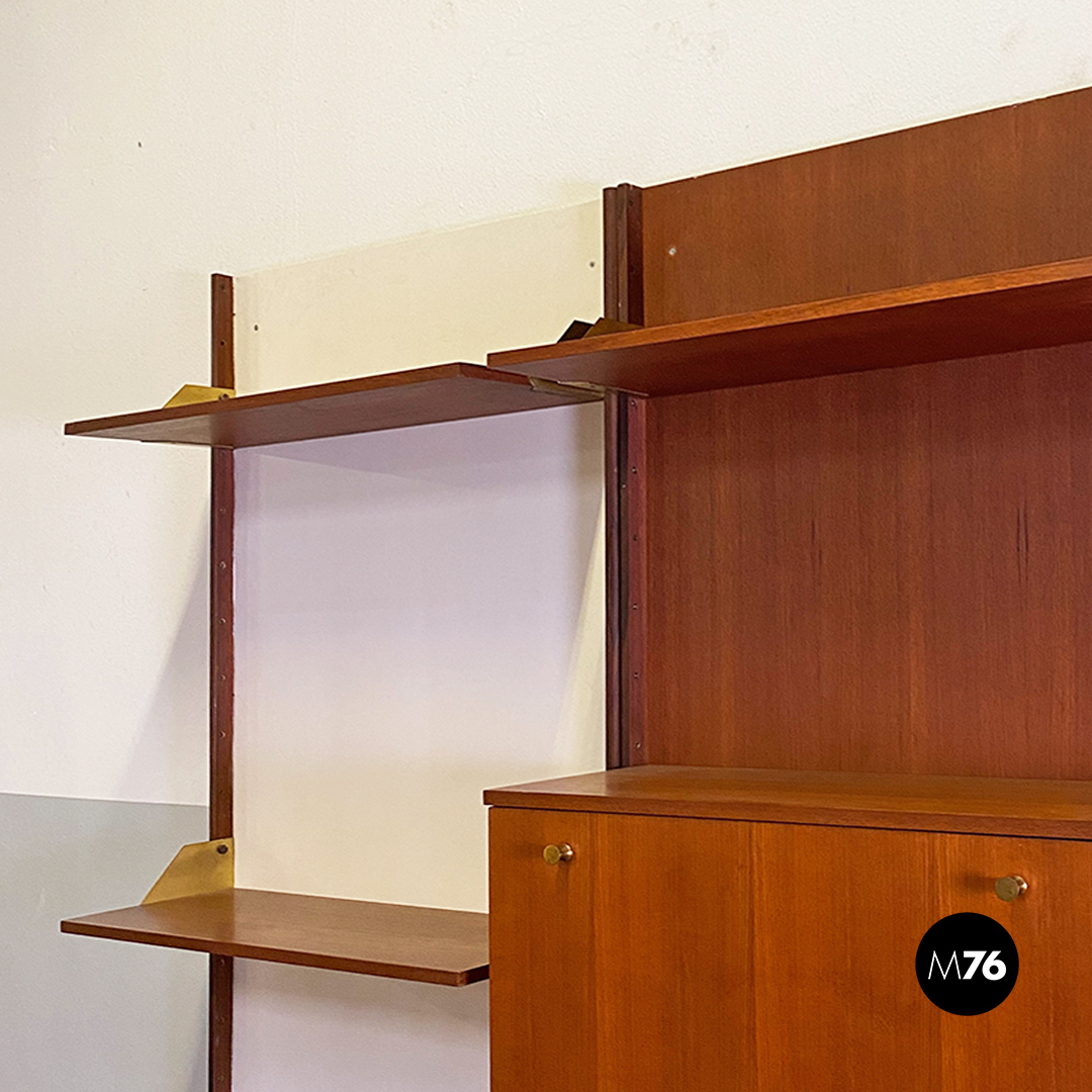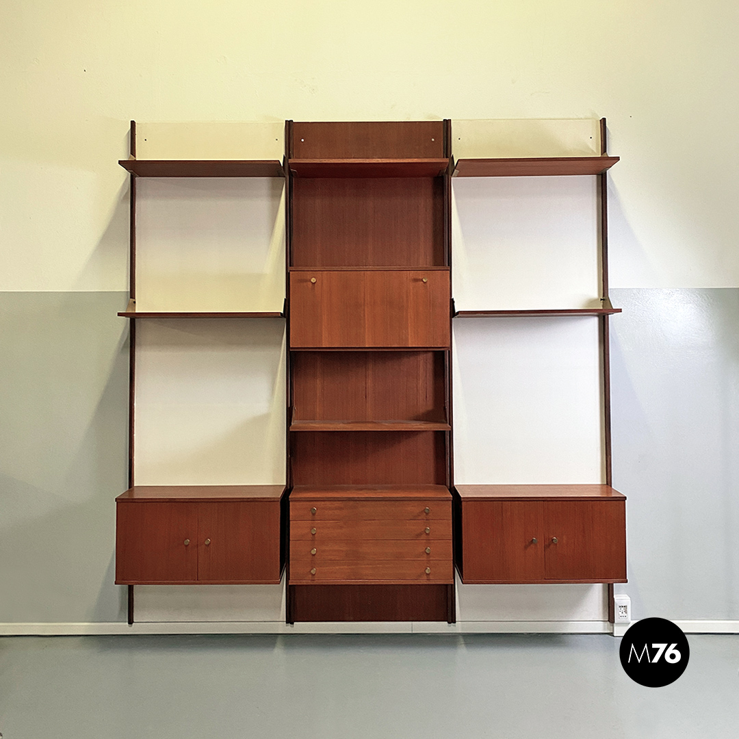 Libreria da parete, componibile, completamente in teak. Composta da tre pannelli a muro, di cui due verniciati in bianco, con montanti che fanno da profilo ai pannelli, mensole e cabinet posizionabili liberamente e fissati alle pareti tramite delle bussole in ottone presenti all’interno dei montanti. Reggimensola e maniglie sempre in ottone, in patina. Provvista di due cabinet con ante a battente, uno con cassetti ed uno con anta a ribalta.